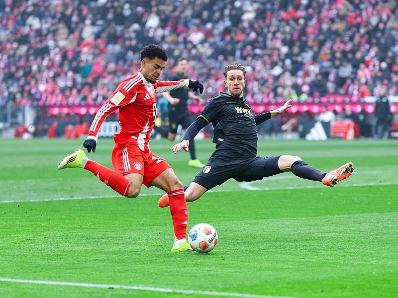 Die Partie begann wie erwartet: Die Münchner dominierten den Ballbesitz von Beginn an, fanden jedoch in den ersten Minuten kaum Wege in die gefährlichen Zonen vor dem Tor der Gäste. Augsburg setzte auf eine kompakte Defensive und versuchte, das Aufbauspiel der Bayern früh zu stören, ohne selbst zu zwingenden Chancen zu kommen. Der erste Abschluss der Partie gehörte dennoch den Gästen, als Claude-Maurice aus rund 21 Metern knapp am Tor vorbeischoss (5. Minute). Auf Seiten der Bayern sorgte Diaz für die erste gefährliche Aktion, sein Schuss aus spitzem Winkel konnte jedoch von Zesiger geblockt werden (8.).