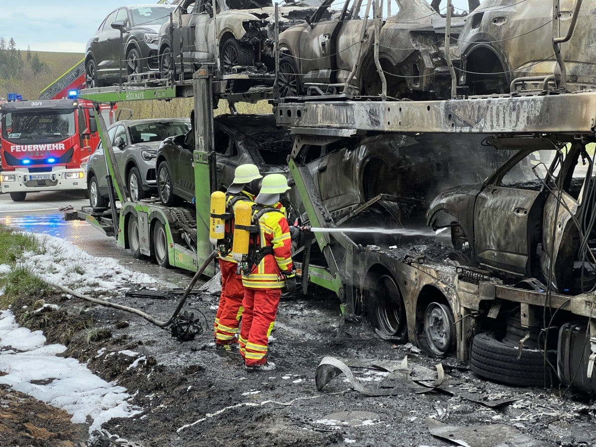 Der Brand entwickelte sich schnell, die eintreffenden Einsatzkräfte konnten schon von mehreren Kilometern die schwarze Rauchwolke stehen, die über der Autobahn stand. Flammen waren meterhoch und ließen sich nur schwer bändigen. Die auf dem Auto geladenen Hybrid-Autos sind teilweise komplett zerstört. Vier davon standen in Vollbrand. Die Polizei rechnet mit einem Sachschaden von rund 500.000 Euro. Glücklicherweise wurde keiner verletzt.