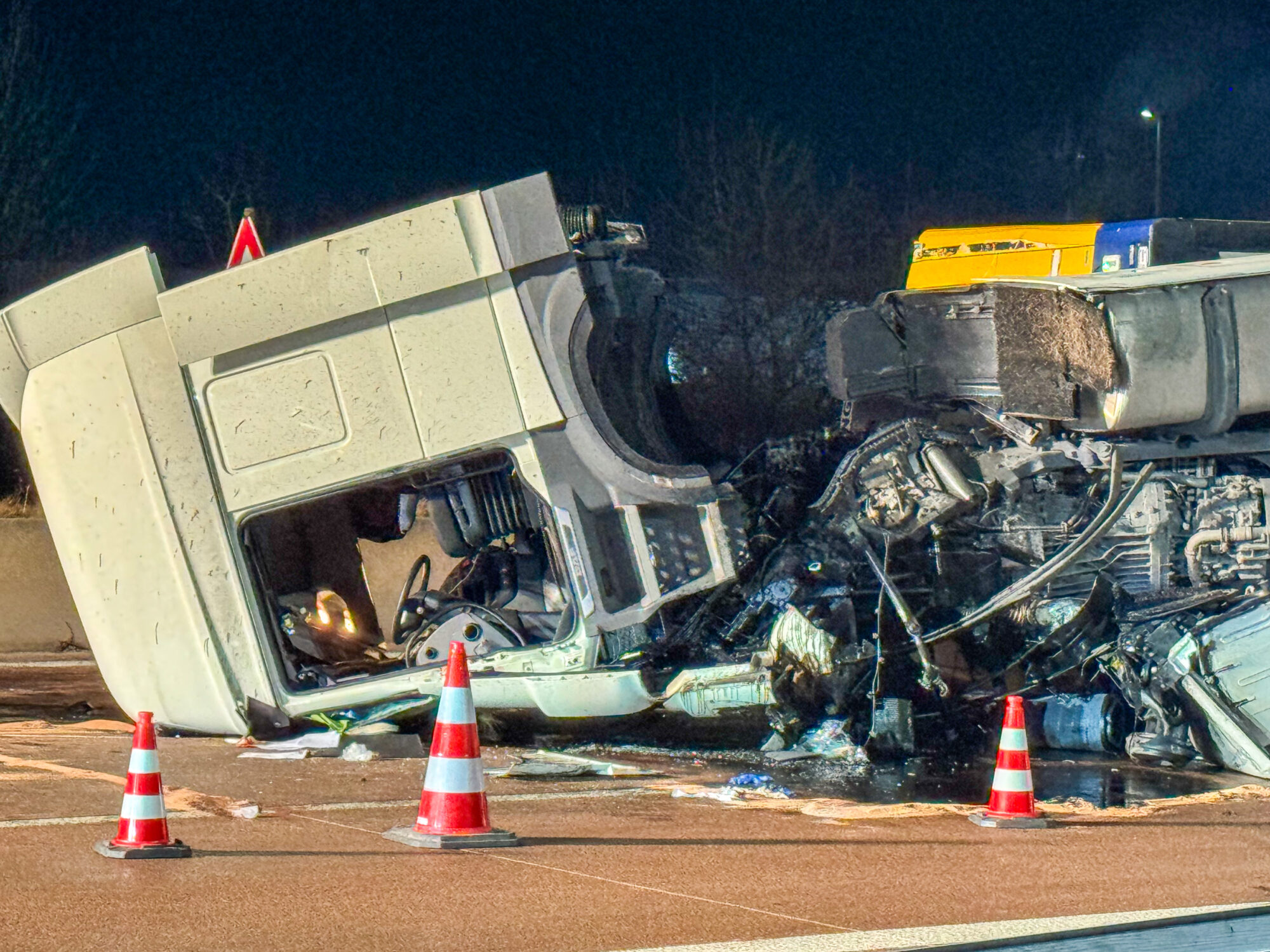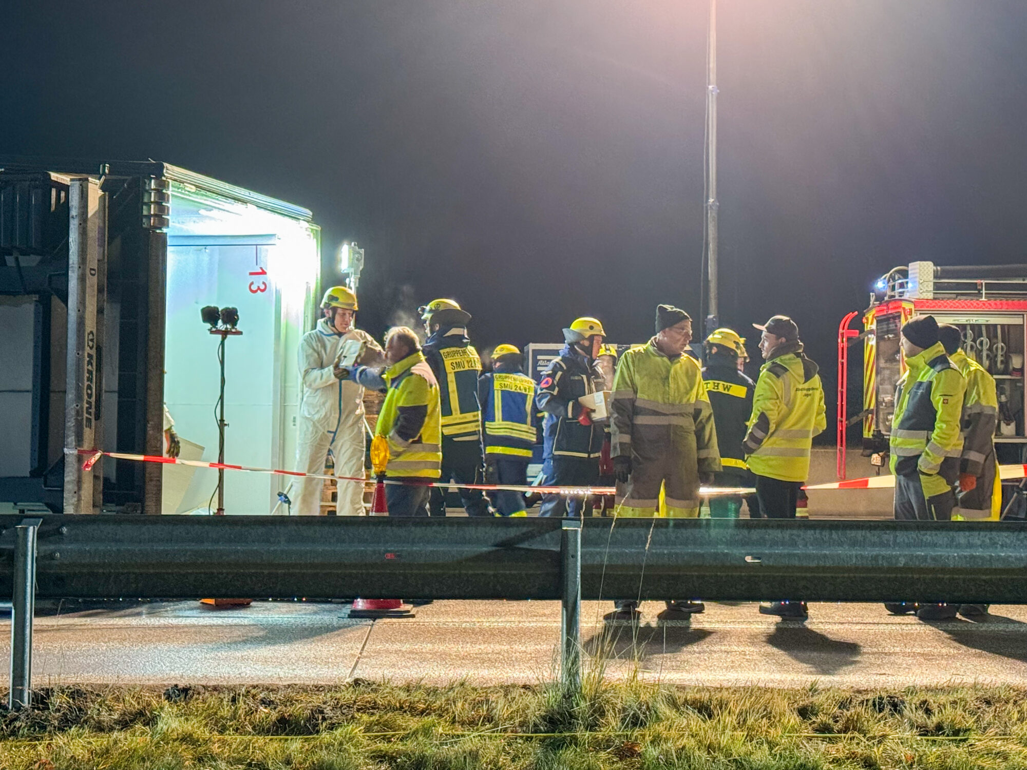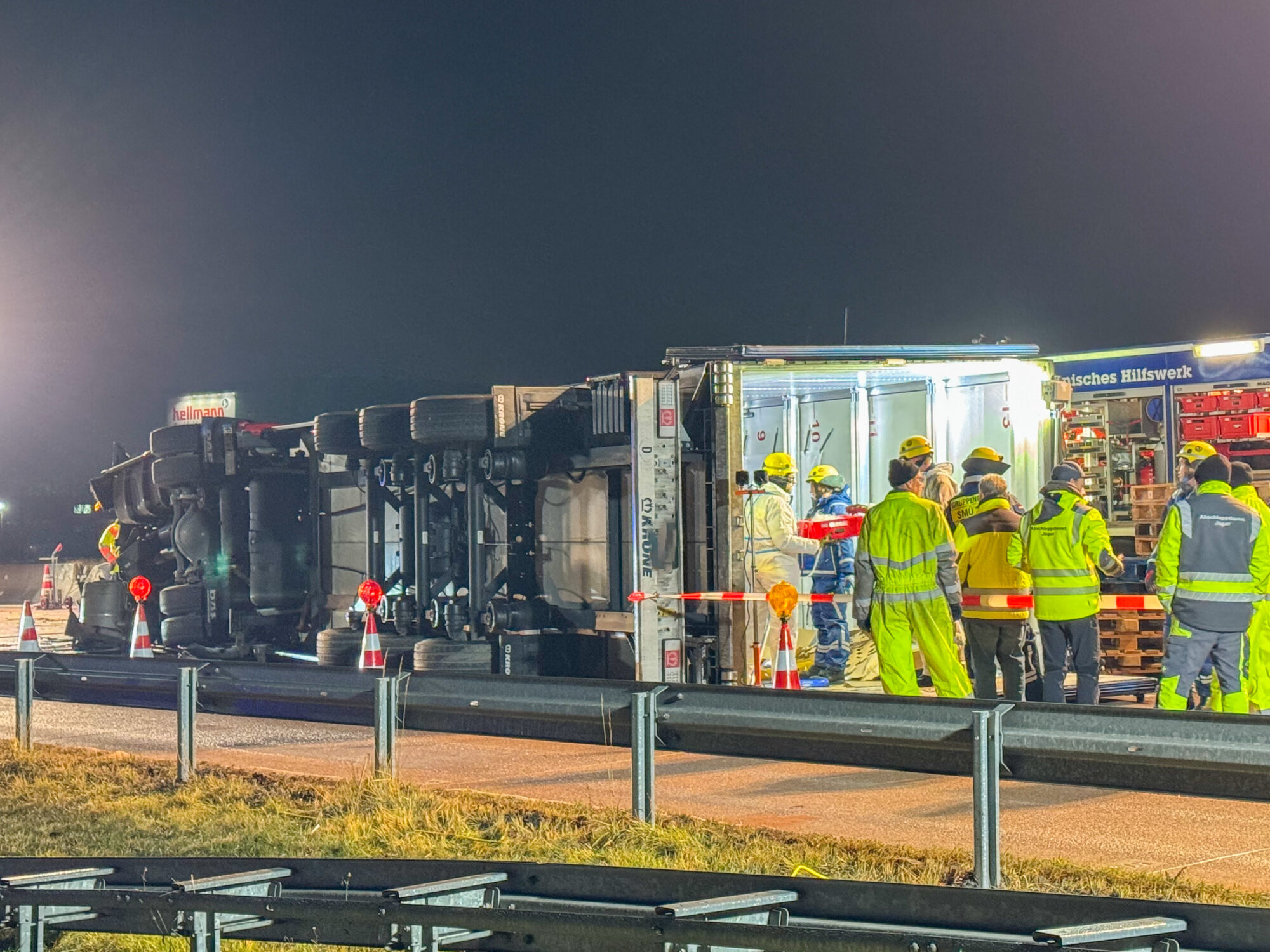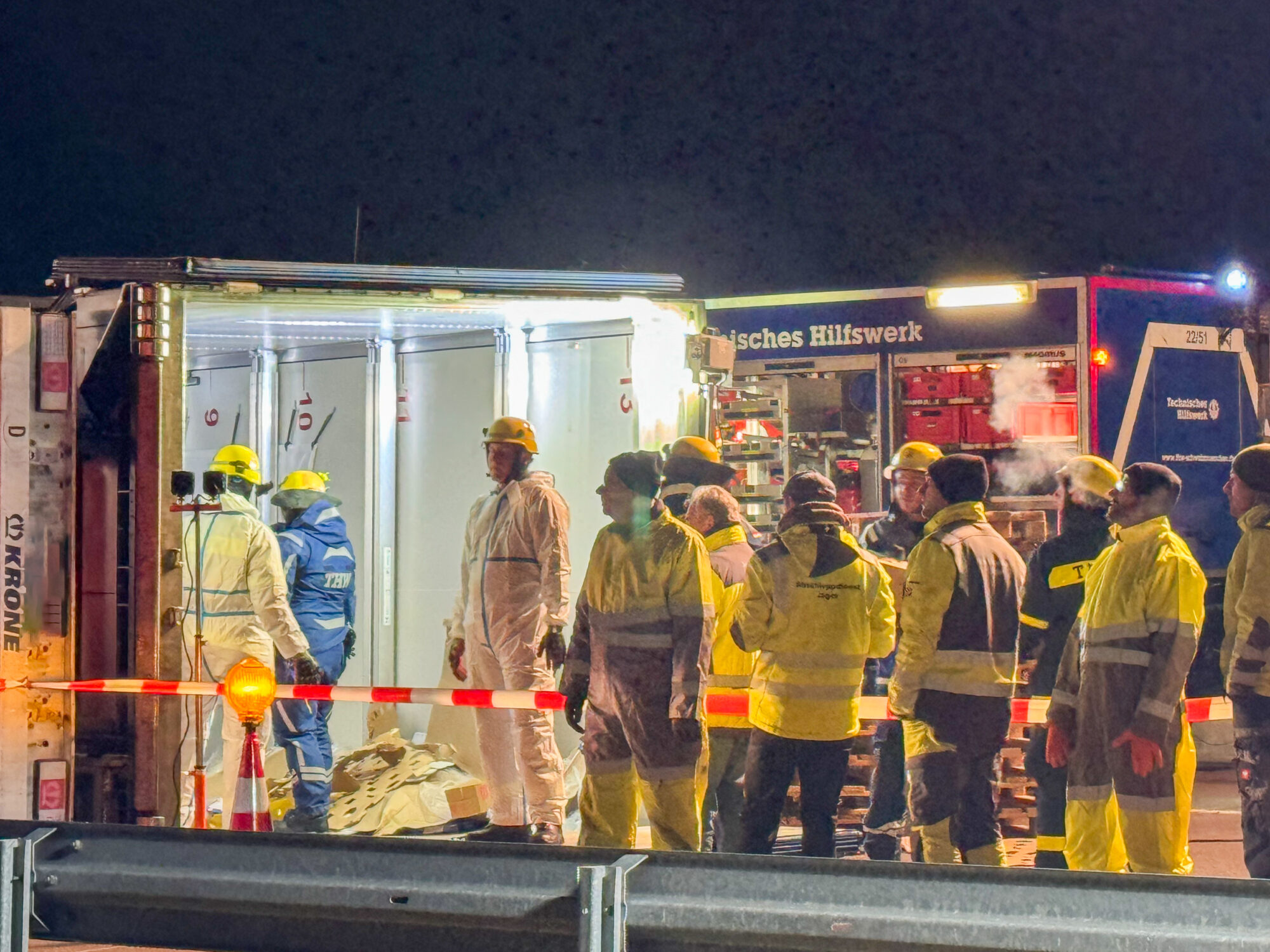 Da der Lastwagen große Mengen an Käse, Milch und weiteren Kühlwaren geladen hatte, mussten Feuerwehr und THW den gesamten Auflieger per Hand ausräumen, bevor ein Kran das Wrack bergen konnte. Die Arbeiten dauerten bis tief in die Nacht.