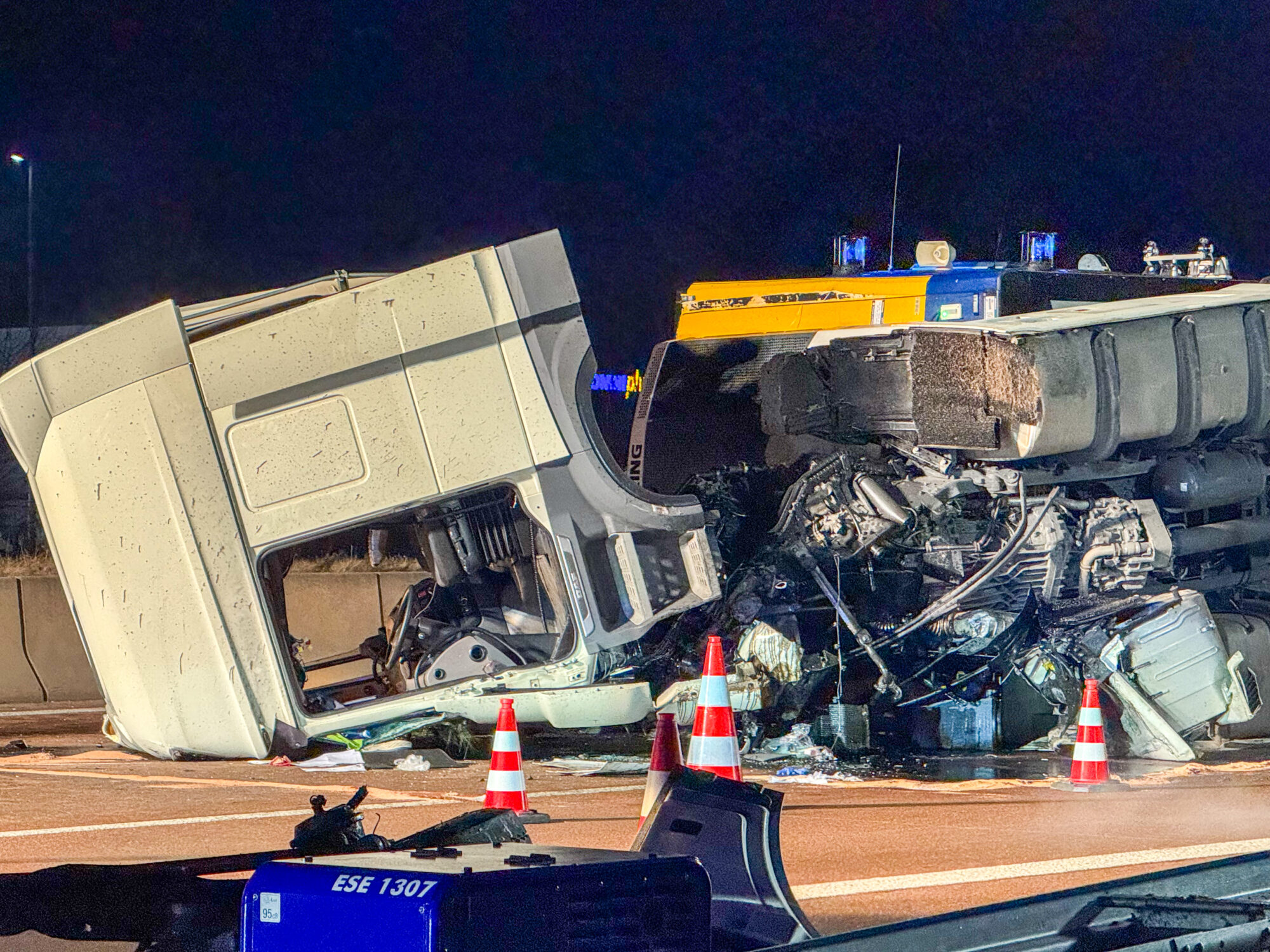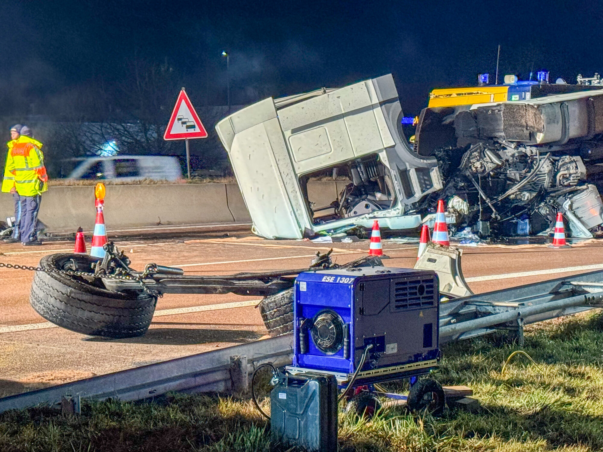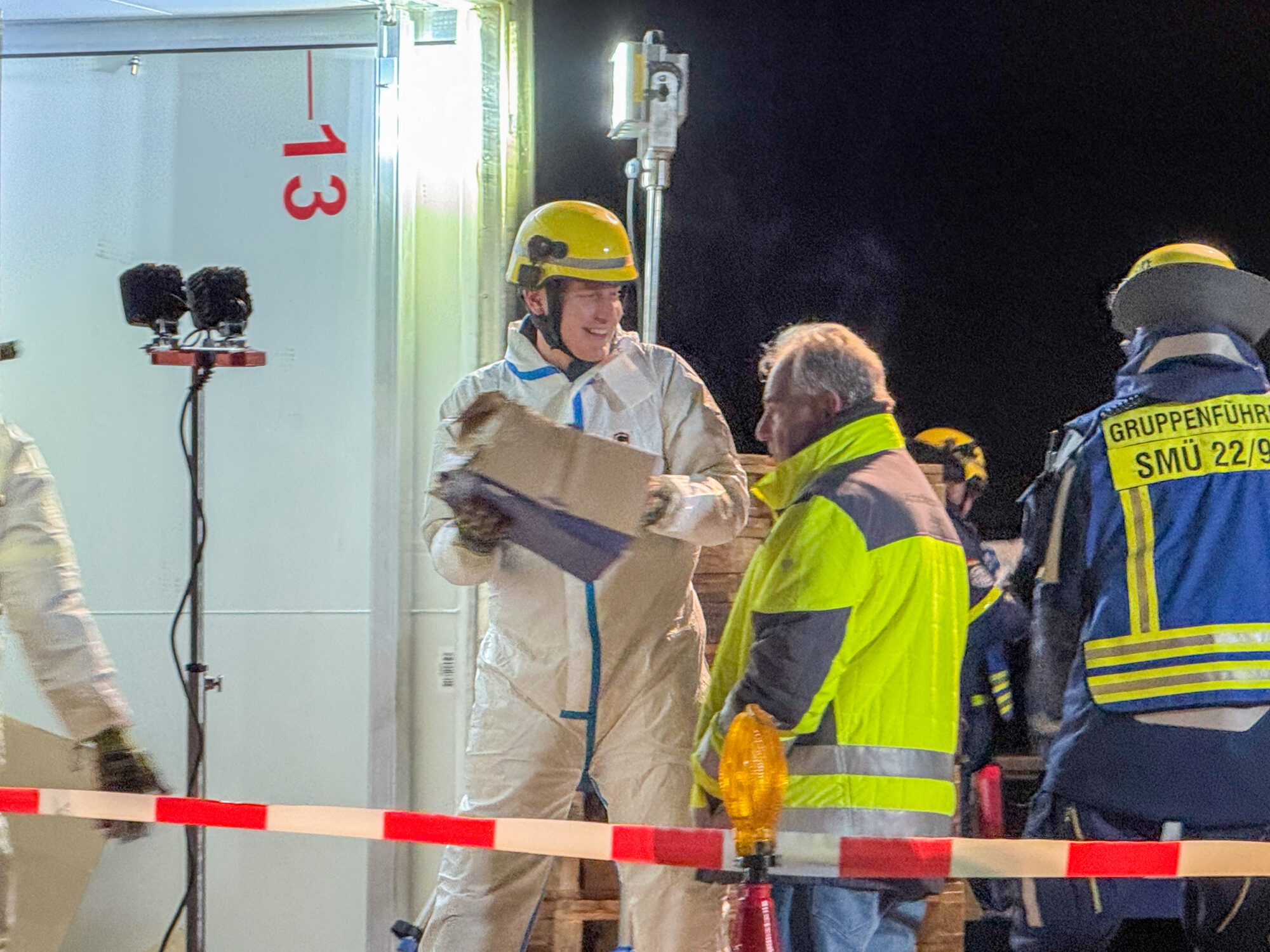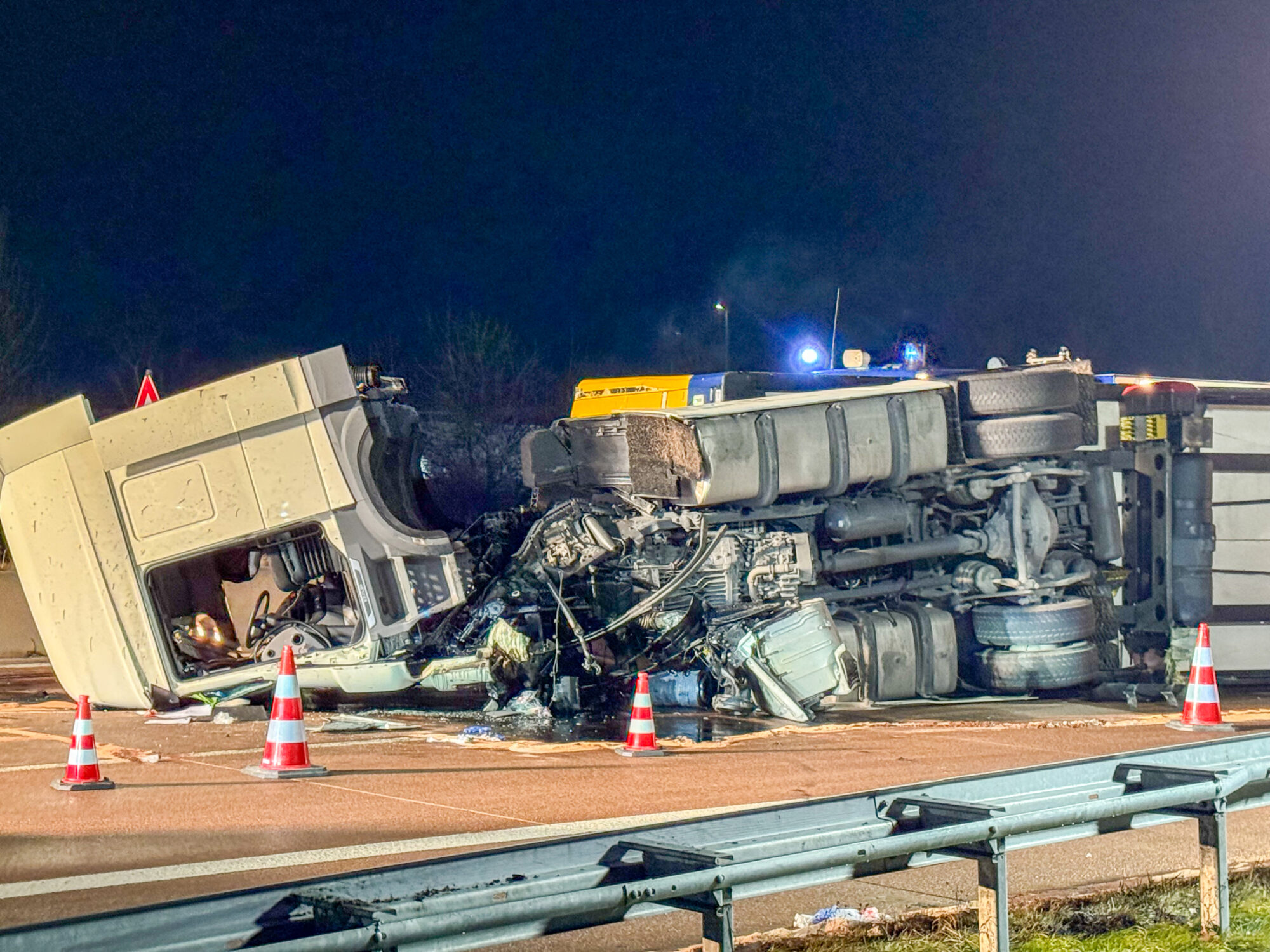 Da der Lastwagen große Mengen an Käse, Milch und weiteren Kühlwaren geladen hatte, mussten Feuerwehr und THW den gesamten Auflieger per Hand ausräumen, bevor ein Kran das Wrack bergen konnte. Die Arbeiten dauerten bis tief in die Nacht.