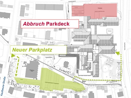 Am kommenden Freitag, dem 08. März gehen die ersten großen Vorabmaßnahmen nun in Betrieb, um in der Folge das Parkdeck abreißen und somit die Baugrube für den Funktionsneubau schaffen zu können. Das Parkdeck mitsamt Tiefgarage, welches an der Krankenhausstraße liegt, wird in den nächsten Wochen für Autos gesperrt und dann abgerissen.