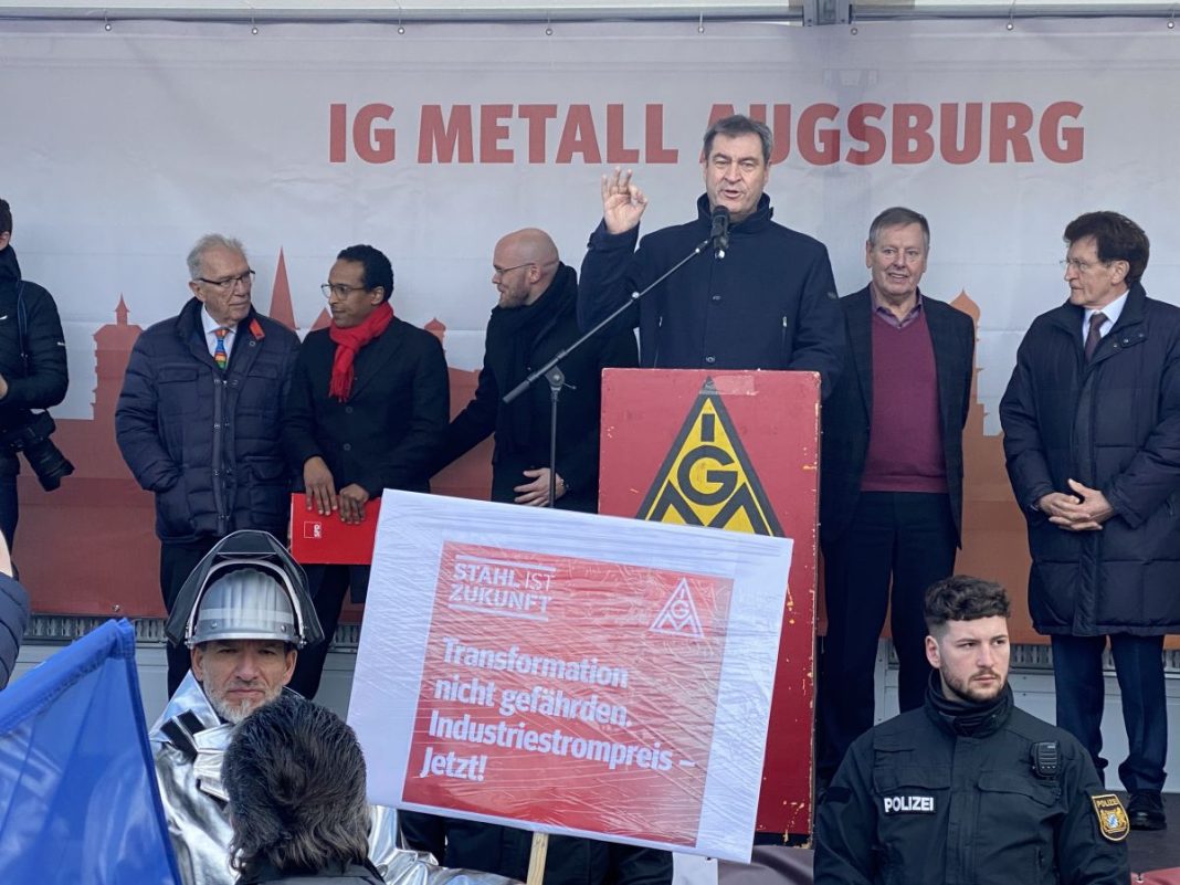 Neben Max Aicher von der gleichnamigen Unternehmensgruppe, zu der die Meitinger Lechstahlwerke gehören, zahlreichen Abgeordneten der Region war auch Markus Söder gekommen. Der Ministerpräsident sprach auch zu den Teilnehmenden, die einen eigenen Strompreis für energieintensiven Branchen forderten. Ich möchte, dass Leute die arbeiten, auch von dieser Arbeit leben können. Und deswegen haben die Beschäftigten mich an Ihrer Seite. Ja – zum Industriestrompreis und Ja- zur besseren Energiepolitik und Ja- zu eurem Engagement!“., so Söder.