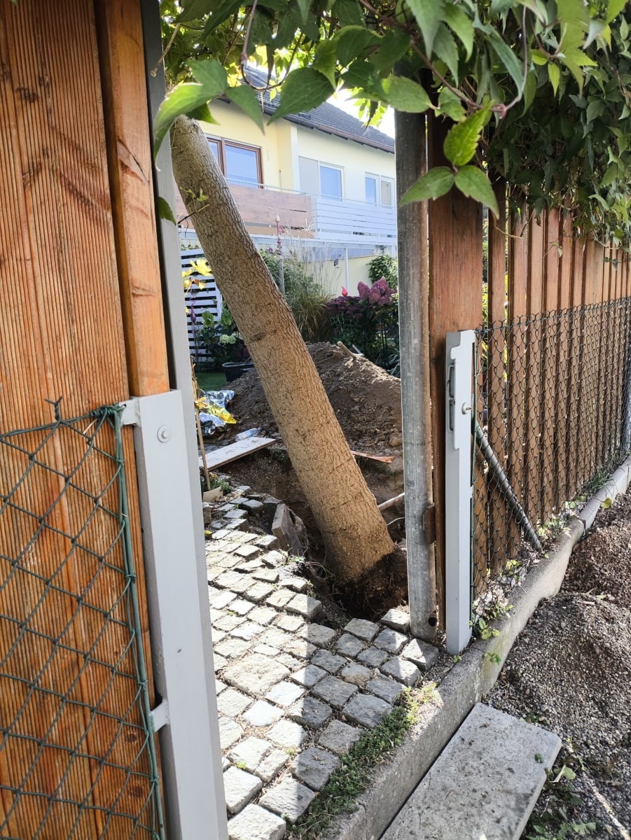 Nach einer schnellen Lageerkundung durch die Einsatzkräfte wurde beschlossen, den Baumstamm samt Wurzelteller mit vereinten Kräften zu bewegen. Dank des Einsatzes der Feuerwehrleute konnte der Gärtner ohne den Einsatz technischer Hilfsmittel aus seiner misslichen Lage befreit werden.