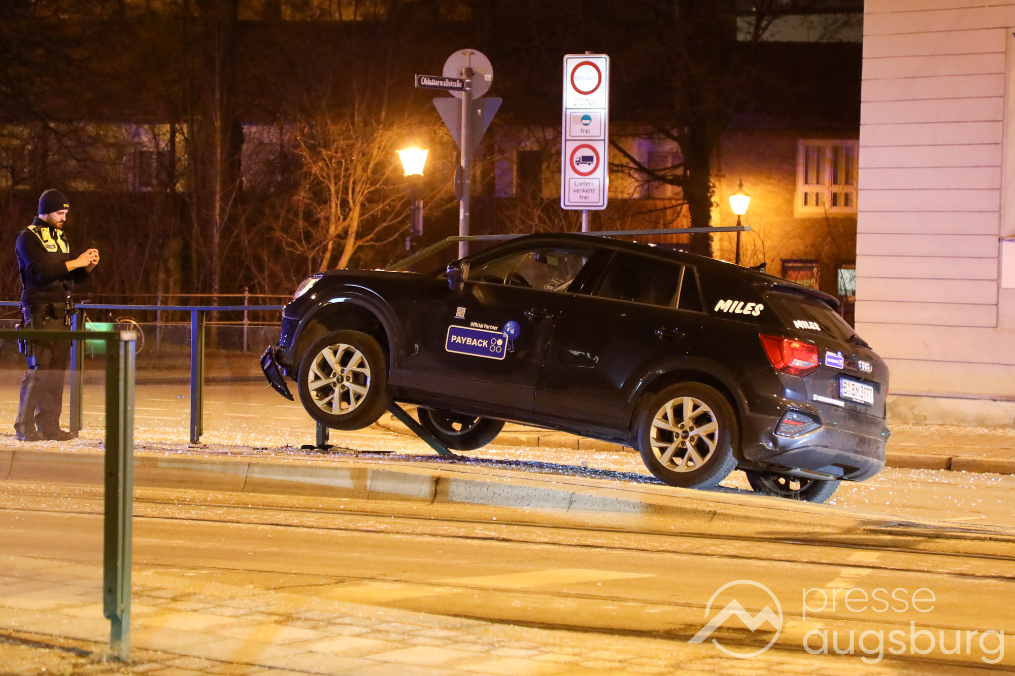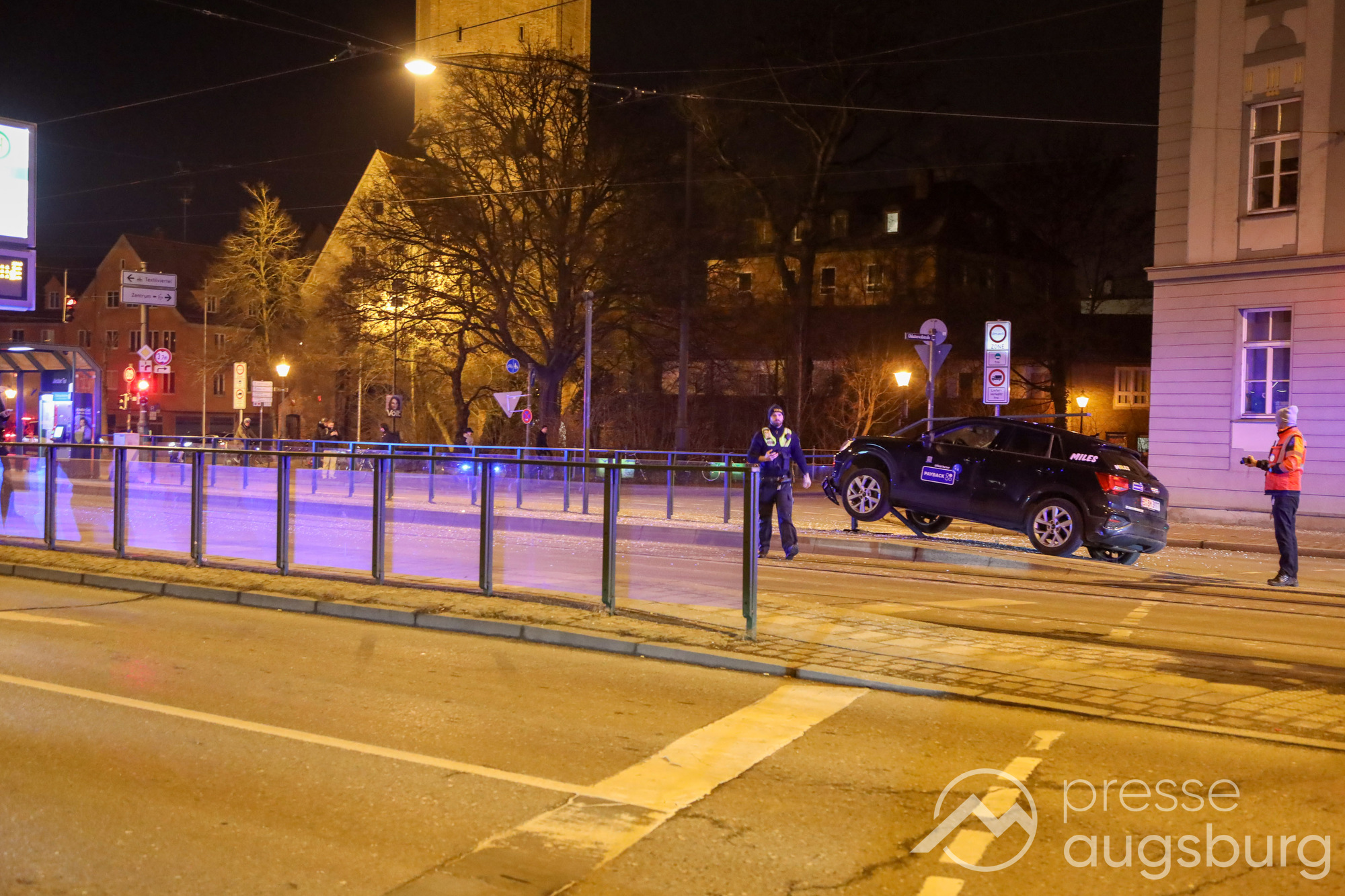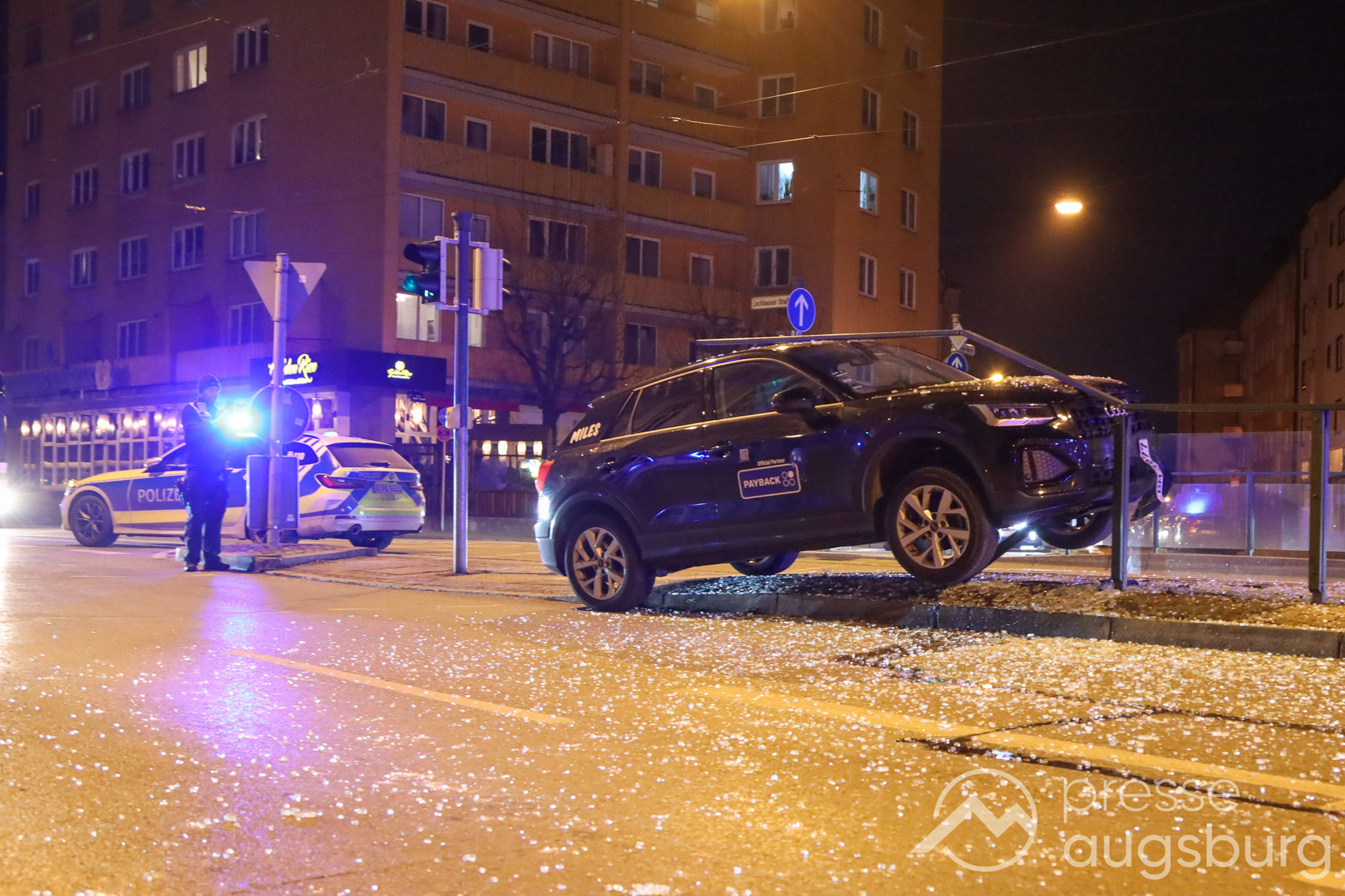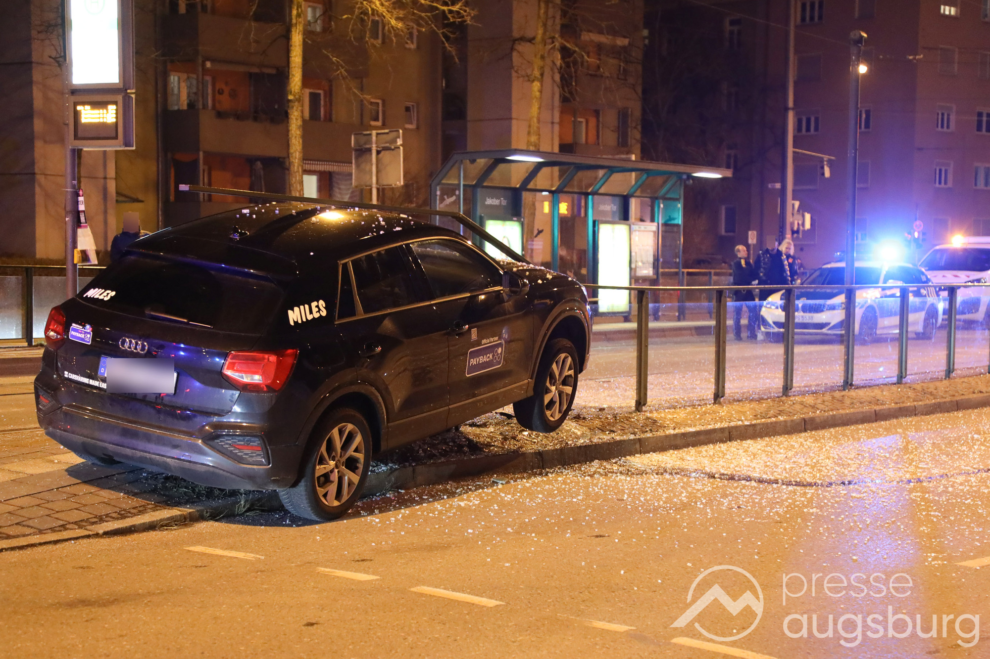 Am Freitagabend gegen 22:45 Uhr ereignete sich ein spektakulärer Verkehrsunfall in der Augsburger Jakobervorstadt, bei dem ein Pkw offenbar alleinbeteiligt auf ein Geländer mit Glasfeldern an einer Straßenbahn- und Bushaltestelle auffuhr und darauf zum Liegen kam. Der Fahrer des Mietwagens konnte sich selbst aus dem Fahrzeug befreien.