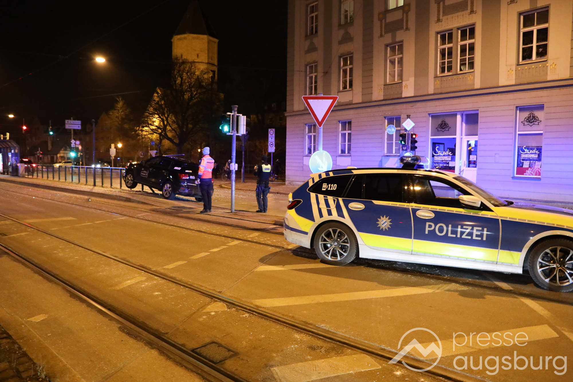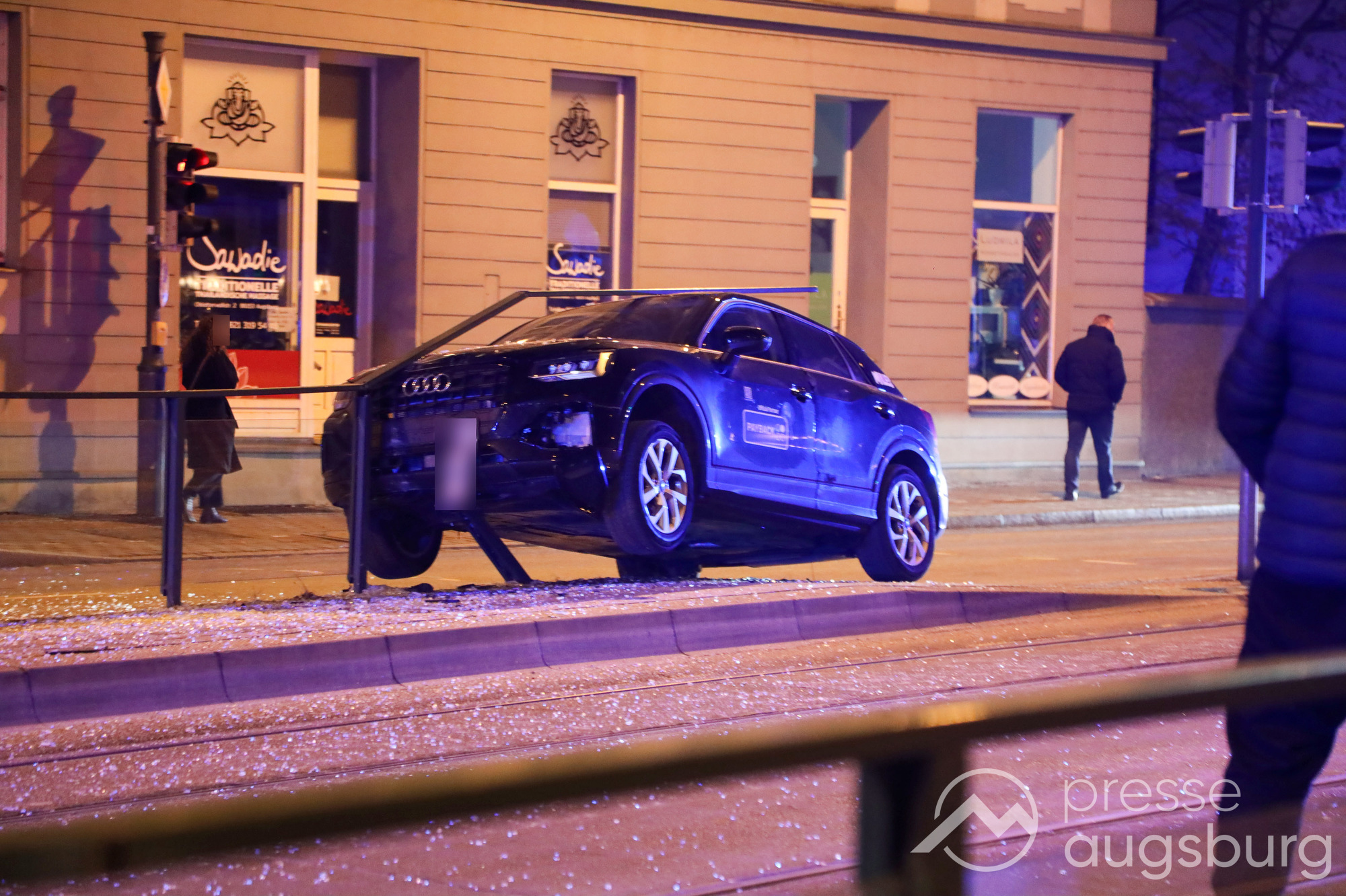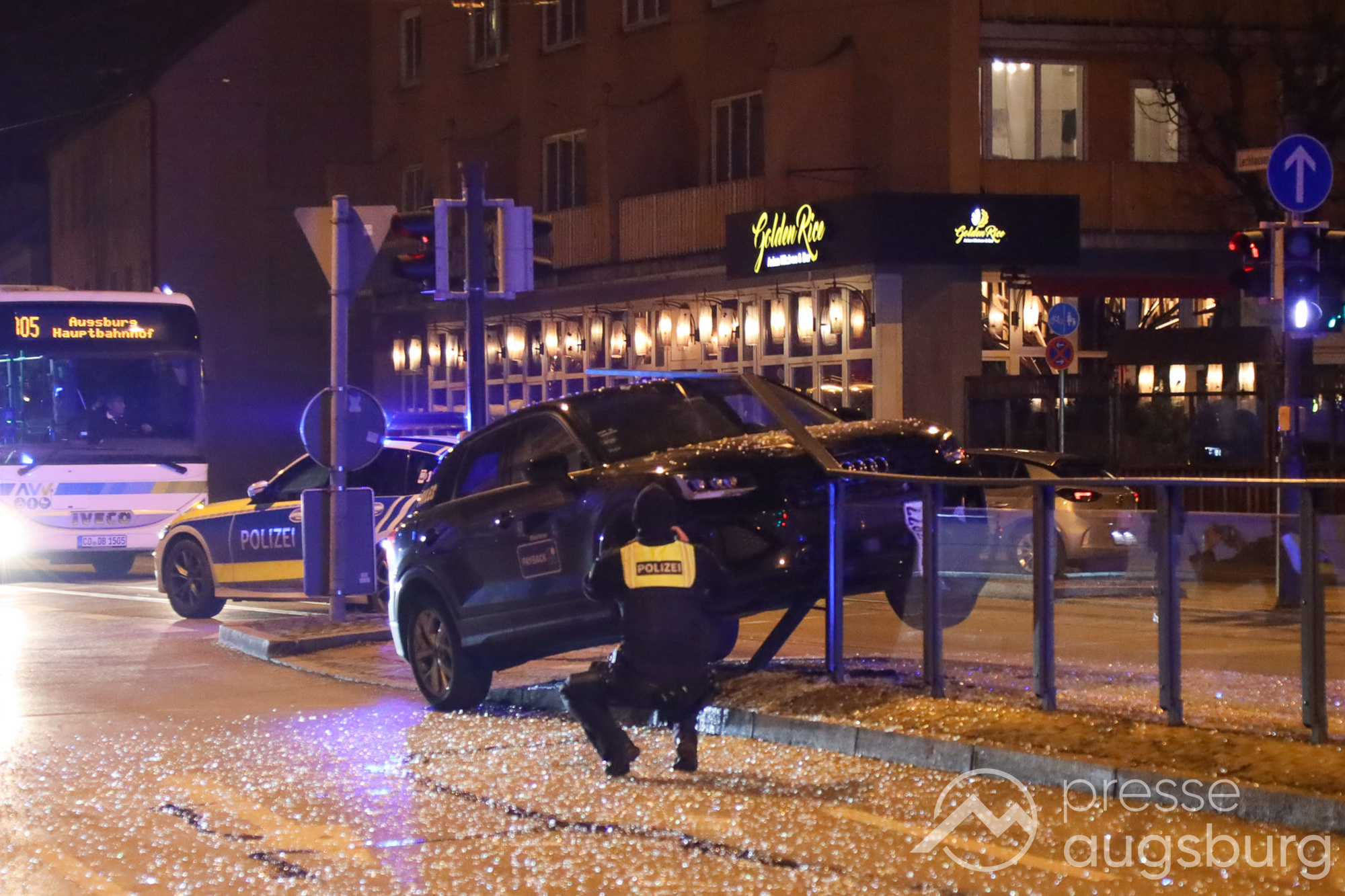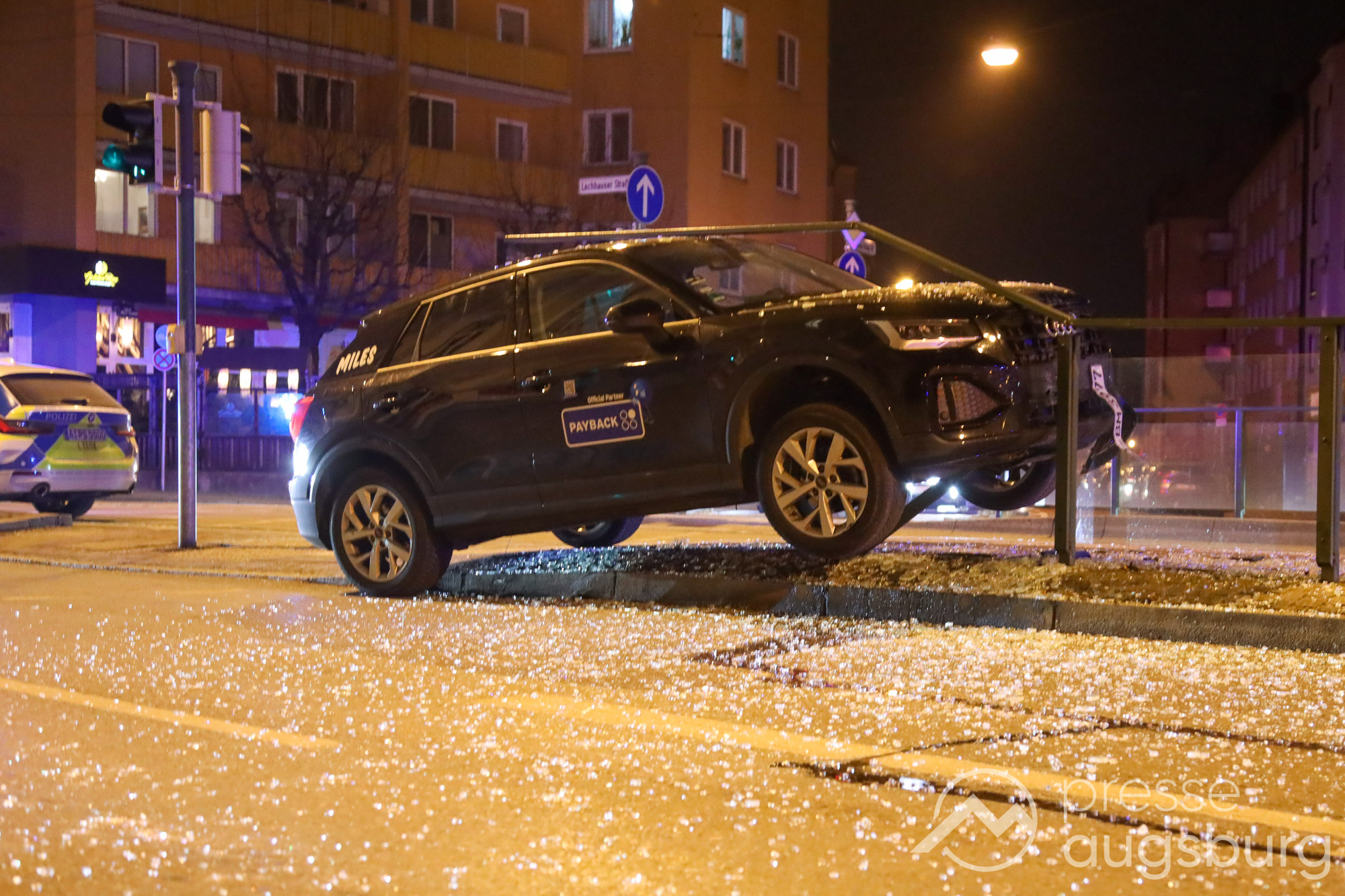 Am Freitagabend gegen 22:45 Uhr ereignete sich ein spektakulärer Verkehrsunfall in der Augsburger Jakobervorstadt, bei dem ein Pkw offenbar alleinbeteiligt auf ein Geländer mit Glasfeldern an einer Straßenbahn- und Bushaltestelle auffuhr und darauf zum Liegen kam. Der Fahrer des Mietwagens konnte sich selbst aus dem Fahrzeug befreien.