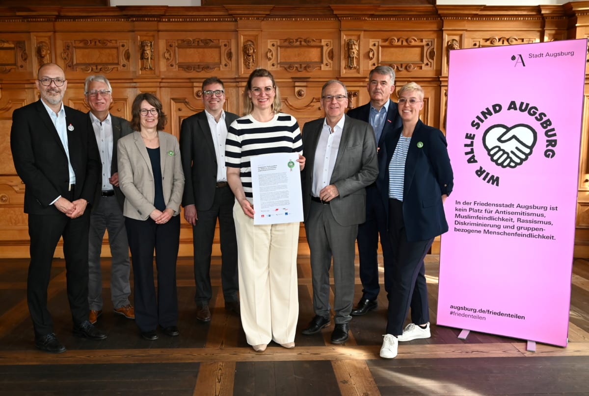 In der stadtweit sichtbaren Kampagne „Wir alle sind Augsburg“ zeigt die Stadt Augsburg ihr Bekenntnis für ein friedvolles Miteinander und setzt sich für Vielfalt und gegen Antisemitismus, Muslimfeindlichkeit, Rassismus, Diskriminierung und jede Form gruppenbezogener Menschenfeindlichkeit ein.