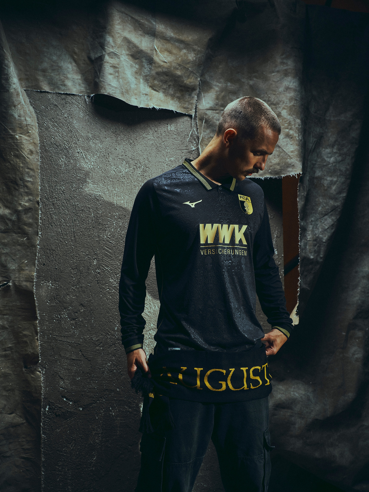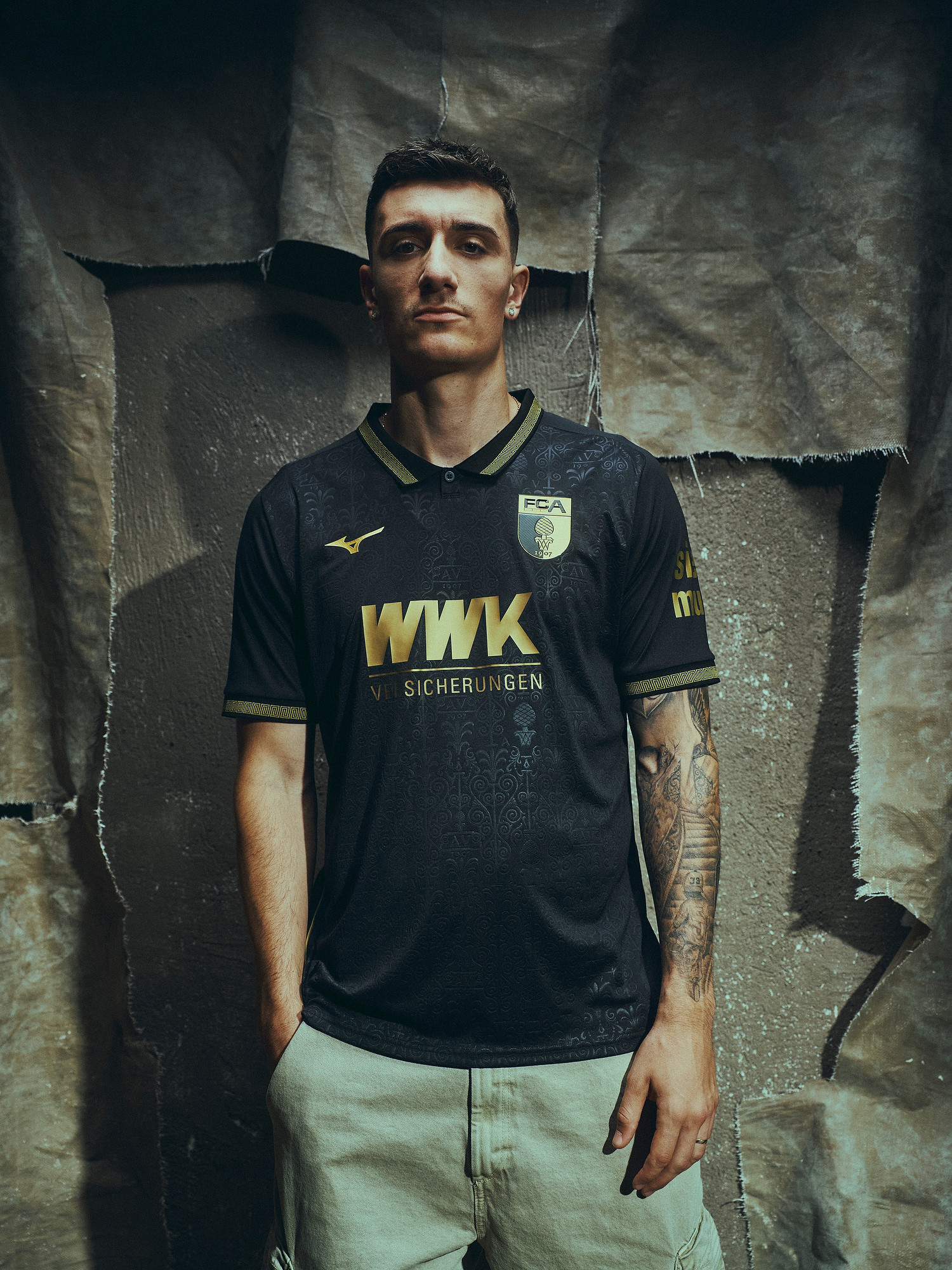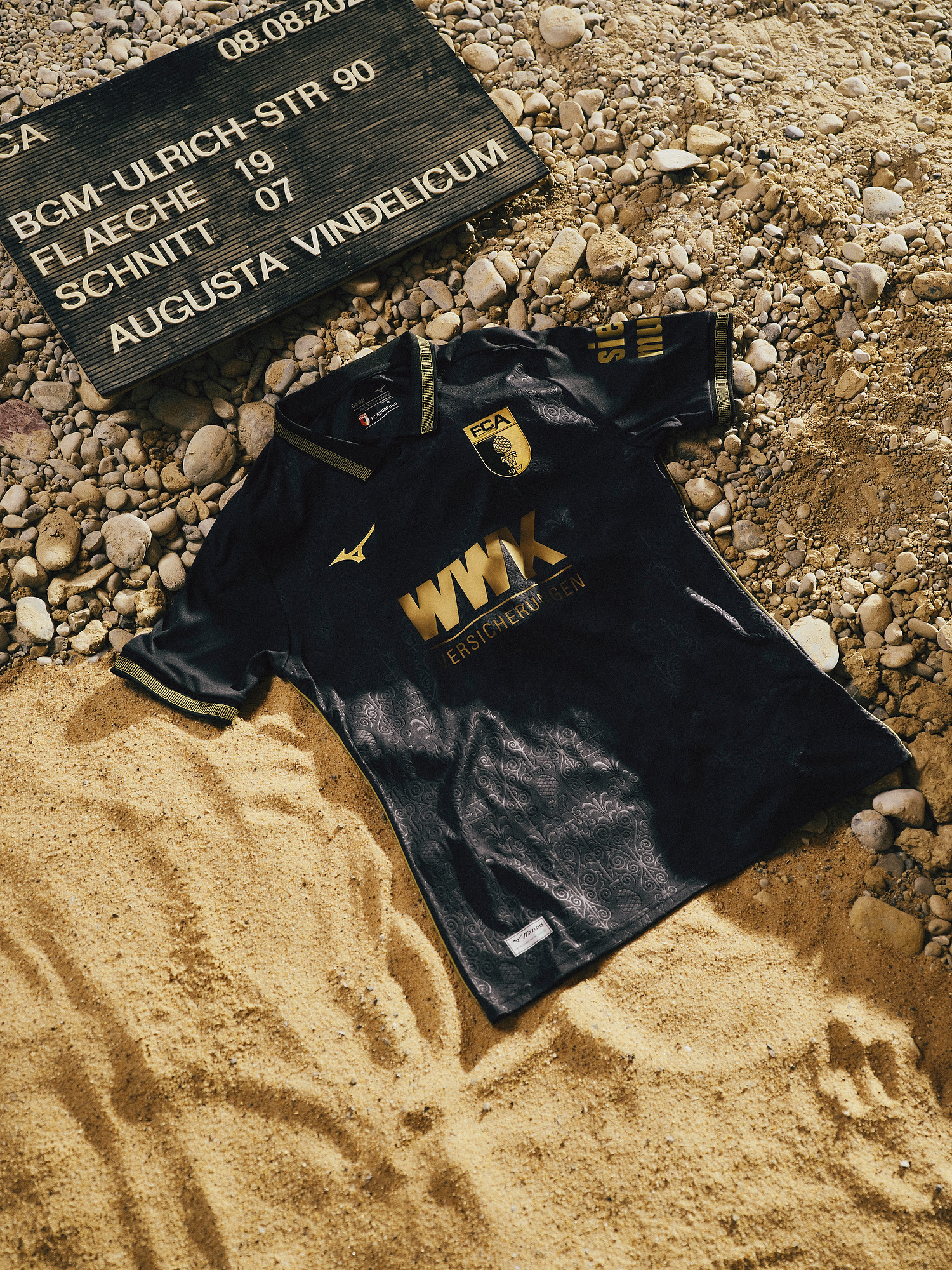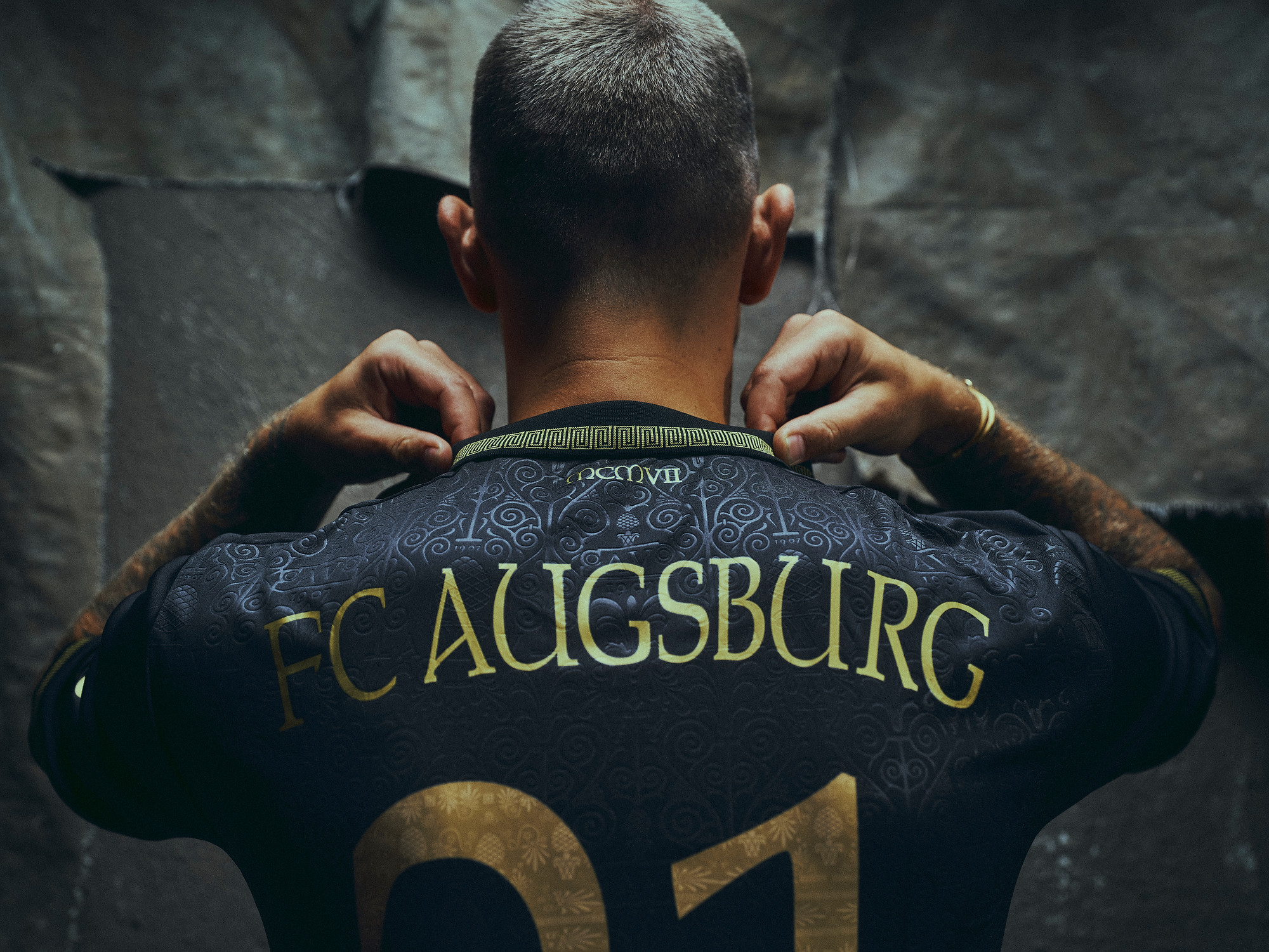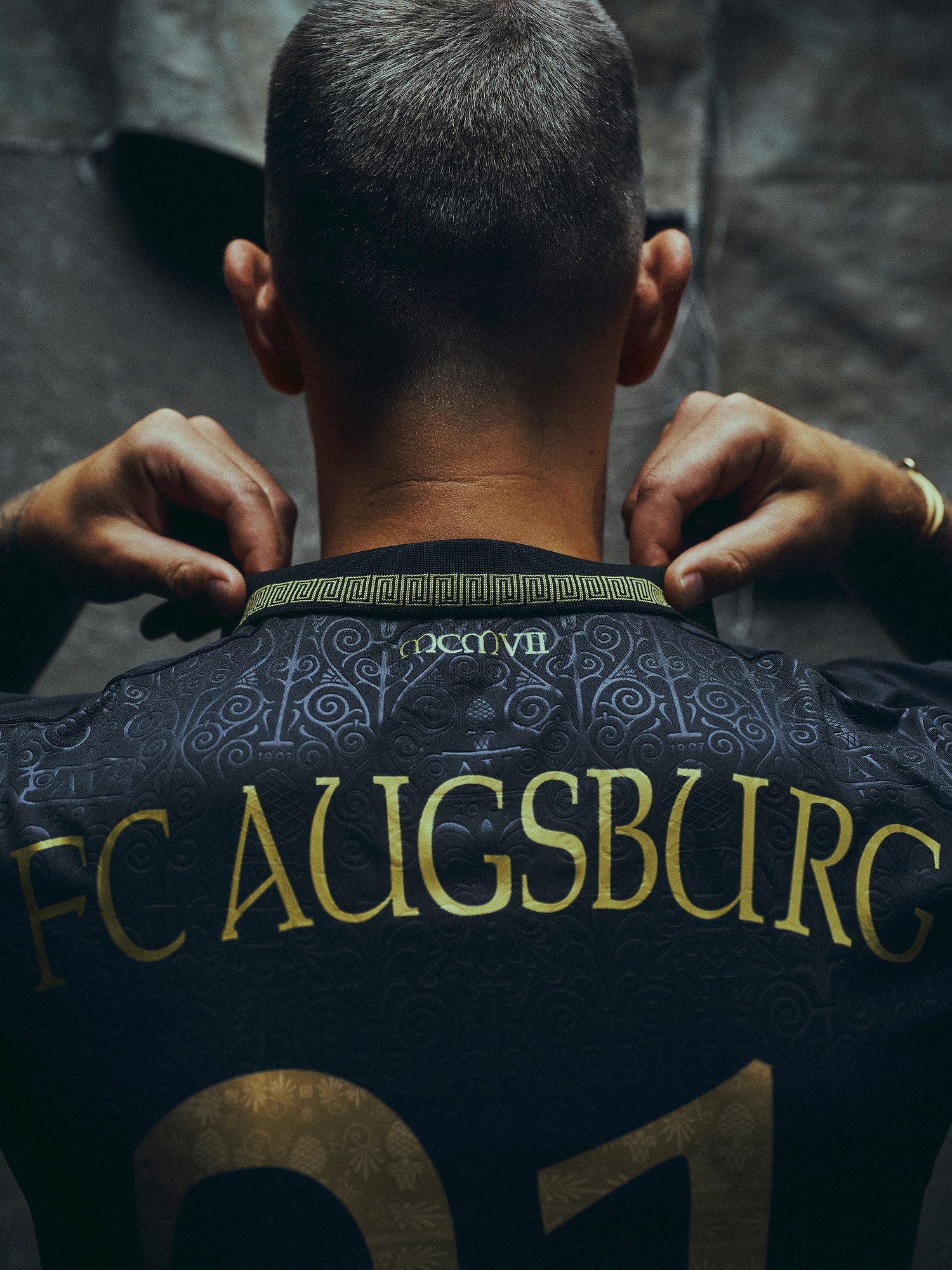 Das schwarze Trikot aus recyceltem Polyester besticht durch eine vollflächig geprägte Vorder- und  Rückseite. Das Design orientiert sich an Fundstücken aus der römischen Antike, wie sie teilweise noch  in Augsburg sichtbar sind, und wird mit Wappen- sowie Zirbelnuss-Elementen kombiniert. Sowohl  das FCA-Wappen als auch die Ausrüster- und Partnerlogos sind in Gold gehalten und verleihen dem  Trikot einen edlen Touch. Gold findet sich zudem an den Bündchen der Ärmel sowie am Kragen  wieder. Jedes Trikot ist im Nacken mit dem Gründungsjahr 1907 in römischen Ziffern und einem  vorgeflockten „FC Augsburg“-Schriftzug auf dem Rücken ausgestattet. Als besonderes Highlight  tragen alle Trikots mit Spielernamen oder individueller Beflockung Nummern im römischen Stil mit  Matt-Glanz-Effekten.