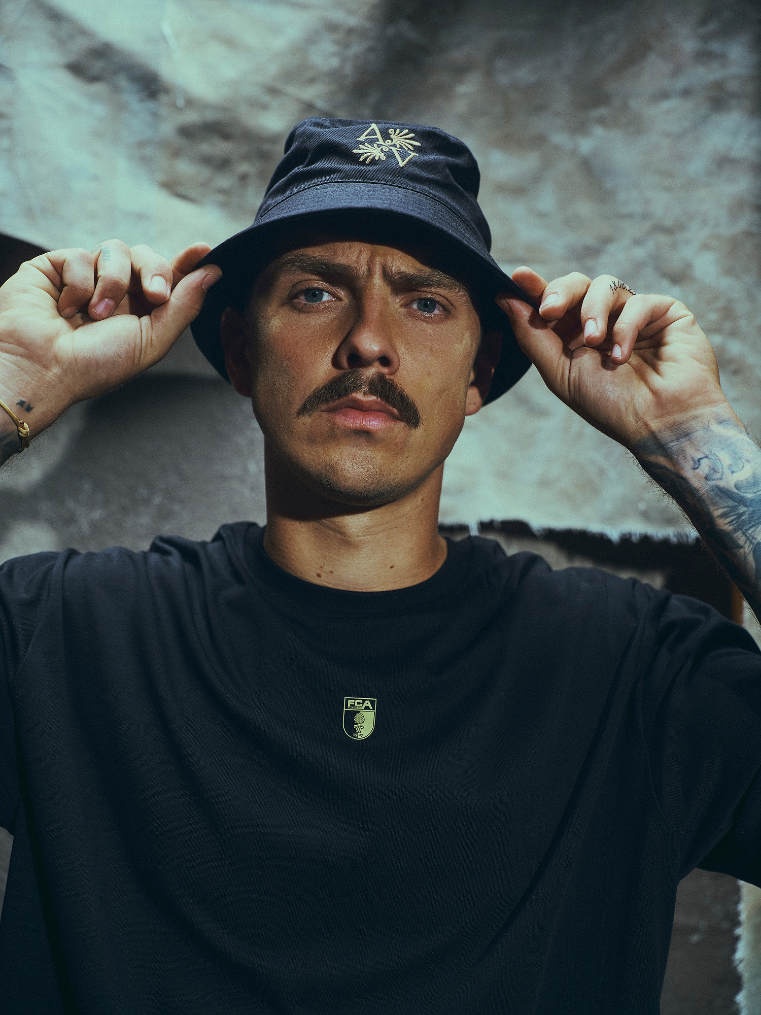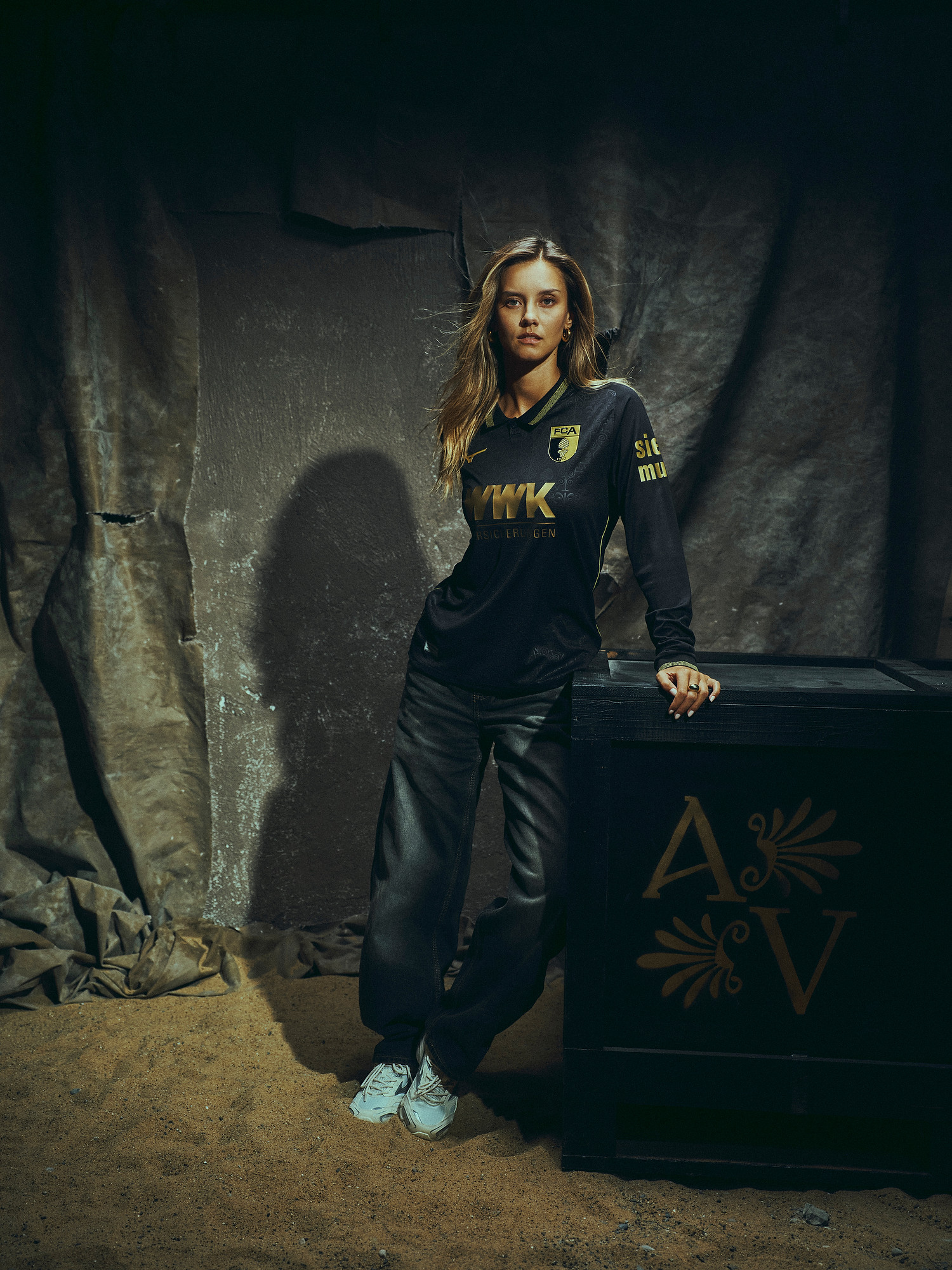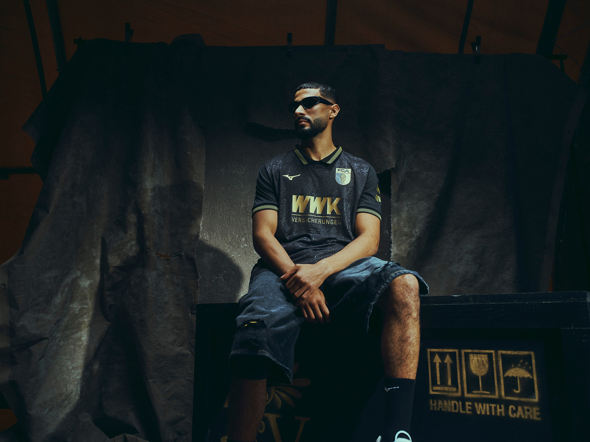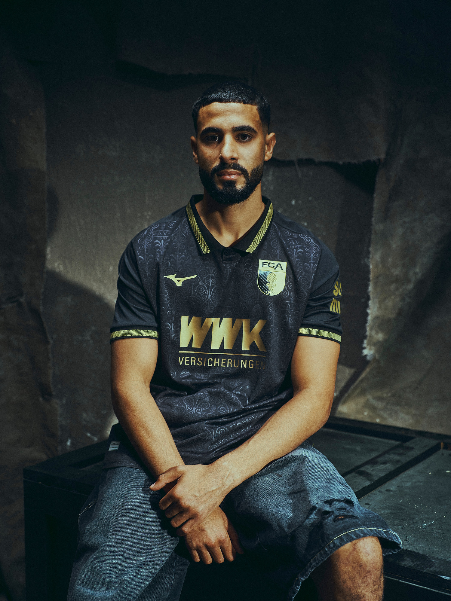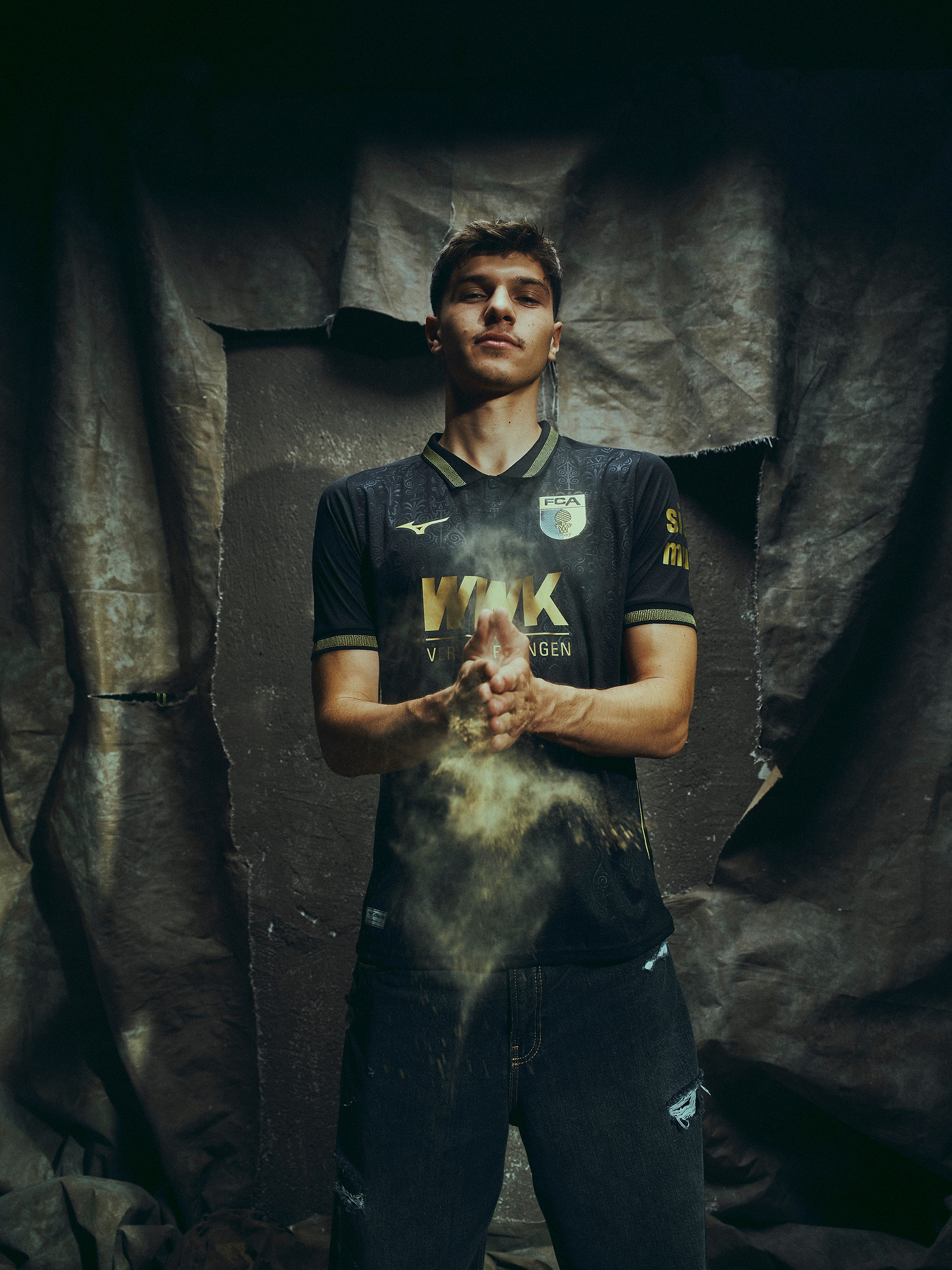 Das schwarze Trikot aus recyceltem Polyester besticht durch eine vollflächig geprägte Vorder- und  Rückseite. Das Design orientiert sich an Fundstücken aus der römischen Antike, wie sie teilweise noch  in Augsburg sichtbar sind, und wird mit Wappen- sowie Zirbelnuss-Elementen kombiniert. Sowohl  das FCA-Wappen als auch die Ausrüster- und Partnerlogos sind in Gold gehalten und verleihen dem  Trikot einen edlen Touch. Gold findet sich zudem an den Bündchen der Ärmel sowie am Kragen  wieder. Jedes Trikot ist im Nacken mit dem Gründungsjahr 1907 in römischen Ziffern und einem  vorgeflockten „FC Augsburg“-Schriftzug auf dem Rücken ausgestattet. Als besonderes Highlight  tragen alle Trikots mit Spielernamen oder individueller Beflockung Nummern im römischen Stil mit  Matt-Glanz-Effekten.