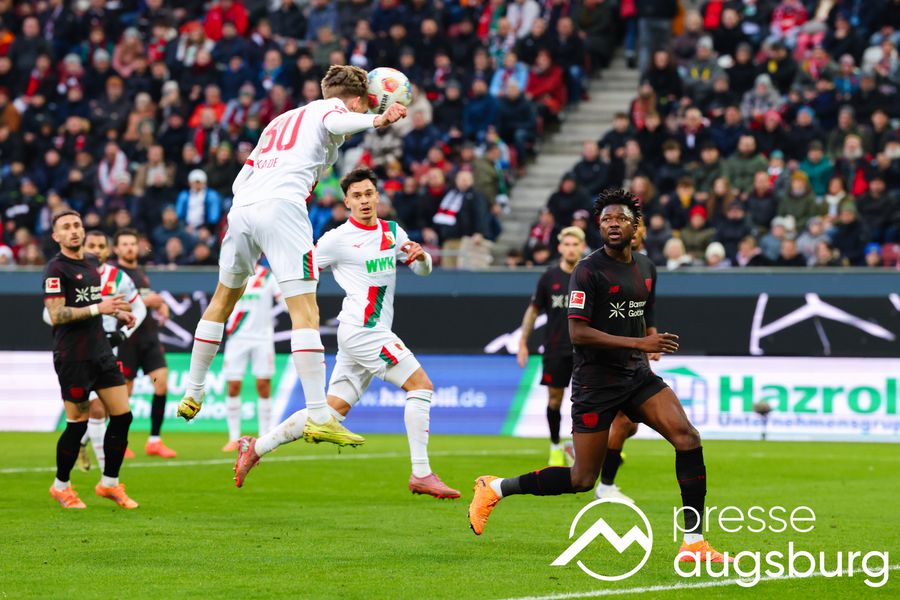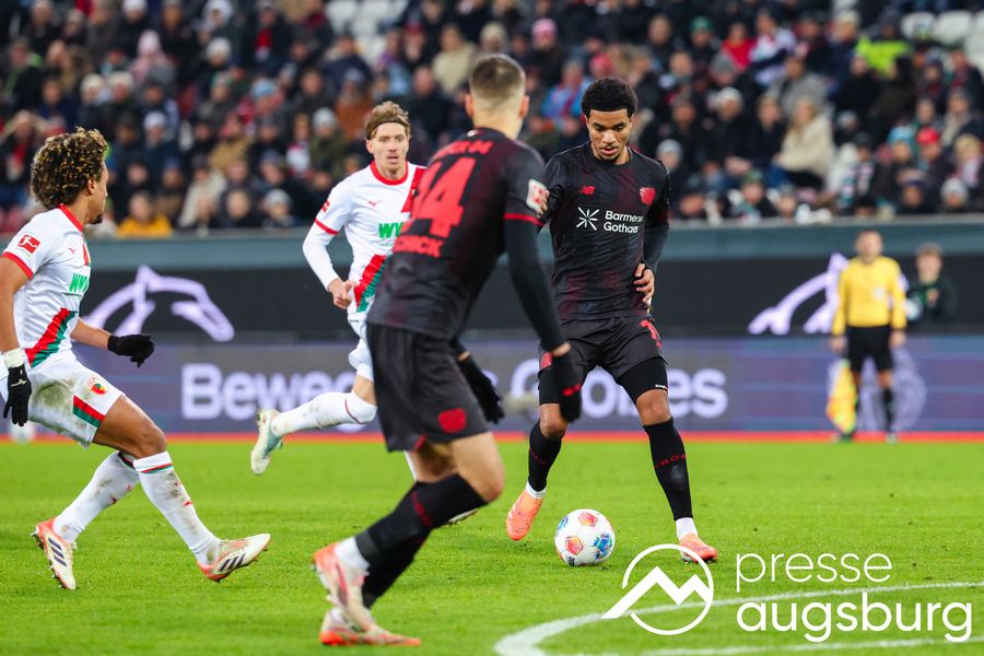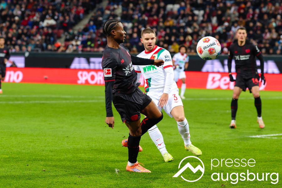 Baums erste Maßnahme: Statt wie bei Wagner hoch zu pressen, wurde versucht, mit einer Fünferdefensive die offensivstarken Leverkusener zu bremsen. Keep it simple. Spiele das, was du kannst. Die neue Devise sollte schon früh aufgehen. Statt bei einem hohen Pressing überrannt zu werden, nutzte der FCA den Raum. Schlotterbeck schickte mit einem langen Ball aus der eigenen Hälfte Giannoulis auf die Reise, der frei stehend vor Flekken zur frühen Augsburger Führung einschieben konnte (6.). Ein Tor wie ein Joker: Die Fuggerstädter konnten nun noch stärker auf das eigene System setzen, Bayer 04 musste kommen. Und natürlich kam die Werkself, doch das nächste Ausrufezeichen trug wieder Rot-Grün-Weiß. Nach einem schnellen Angriff fand eine Giannoulis-Flanke den am Leverkusener Fünfmeterraum freistehenden Kade, der zum 2:0 einköpfen konnte (28.). Schon zwei Minuten zuvor hatte Claude-Maurice einen weiteren Treffer auf dem Schlappen, der Ball landete aber auf der Querlatte.