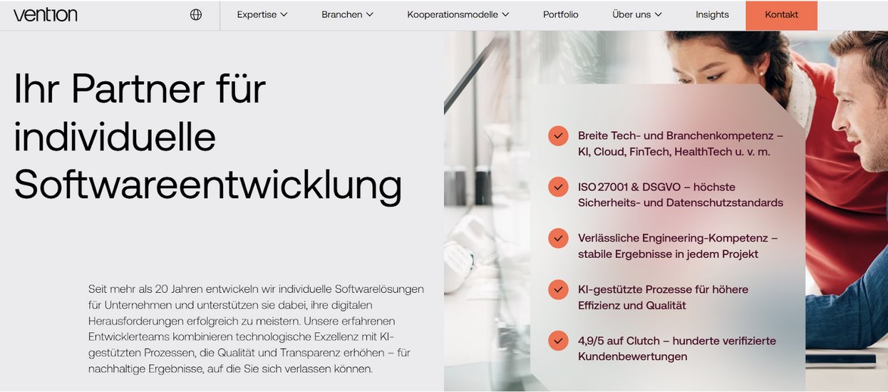 Vention operiert von seinem Engineering-Hub in Berlin aus und konzentriert sich auf generative Künstliche Intelligenz und Produktentwicklung. Die Agentur arbeitet mit Startups und SaaS-Unternehmen zusammen und unterstützt sie bei der Implementierung von Künstliche Intelligenz Funktionen, die die Nutzerinteraktion verbessern und Kernprozesse automatisieren. Mit einem agilen Team kombiniert Vention Geschwindigkeit mit technischer Tiefe für schnelles Prototyping und schnelle Bereitstellung.