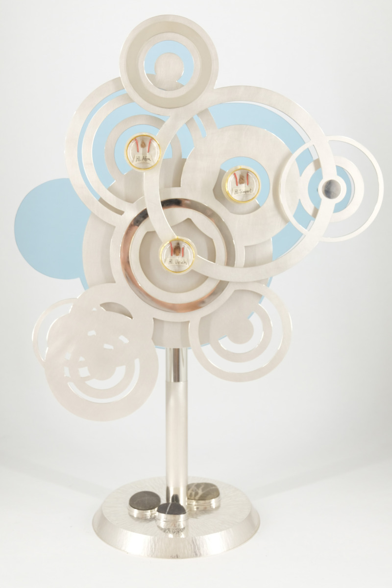 Das Ungewöhnliche an dem Kunstwerk ist, dass es Reliquien aller drei Bistumspatrone enthält. Bei der Gestaltung ließ sich der Künstler von dem Bild inspirieren, das entsteht, wenn Steine ins Wasser geworfen werden und Kreise ziehen – denn jeder der drei Bistumspatrone hat zu seiner Zeit segensreich für die Kirche von Augsburg gewirkt, so dass ihr Glaubenszeugnis bis heute Kreise zieht.