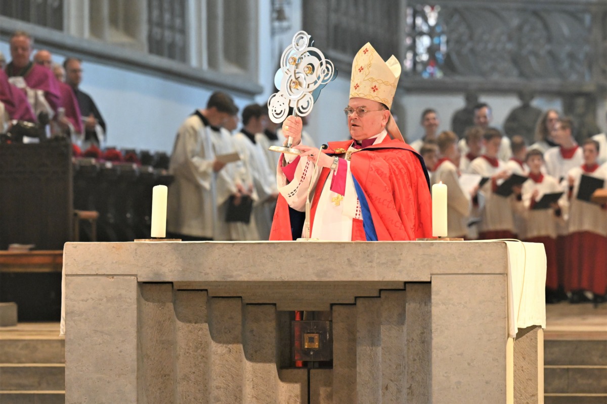 In der Pontifikalvesper am Pfingstsonntag hat Bischof Dr. Bertram Meier den Gläubigen erstmals mit einem neuen Reliquiar den Segen erteilt, das die drei Bistumspatrone Ulrich, Afra und Simpert auf außergewöhnliche Art und Weise vereint. Geschaffen hat das Reliquiar David Wöhrl, Silberschmied und Juniorchef der Firma Dochtermann aus Augsburg.