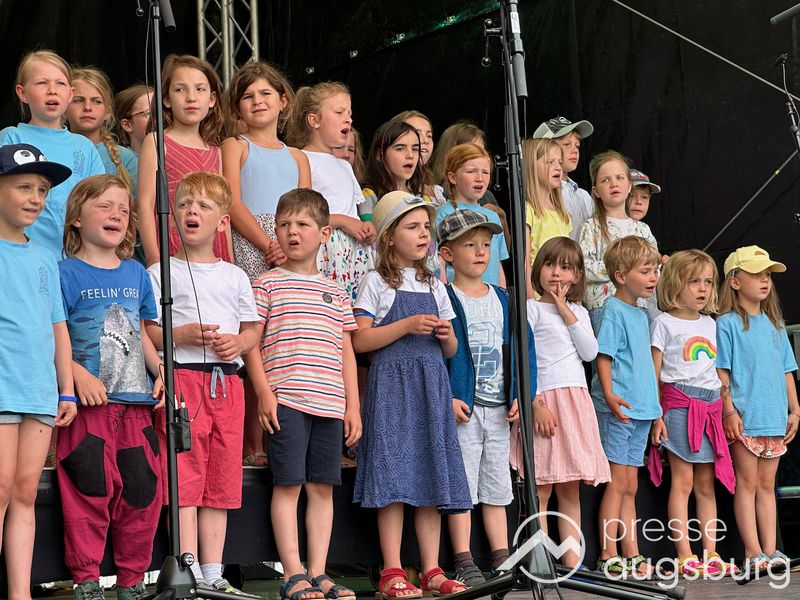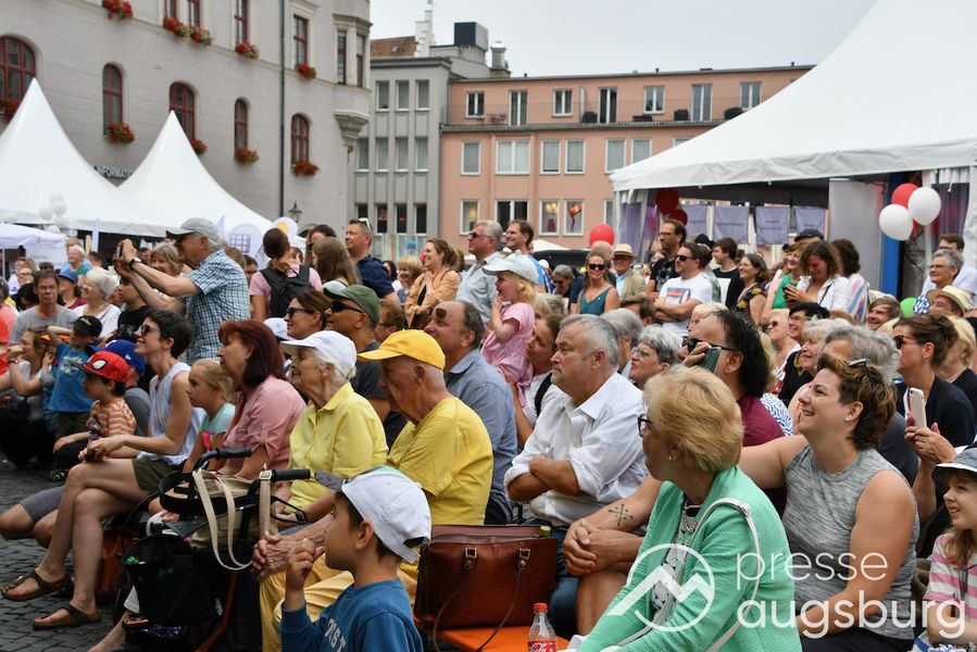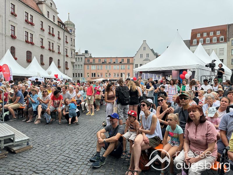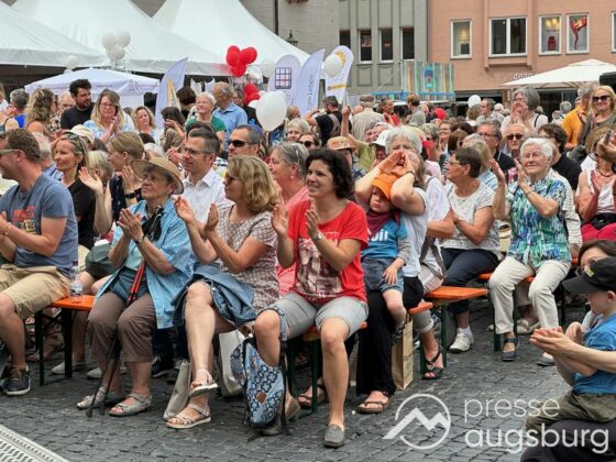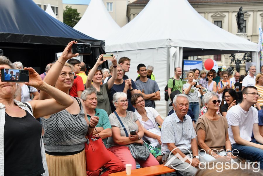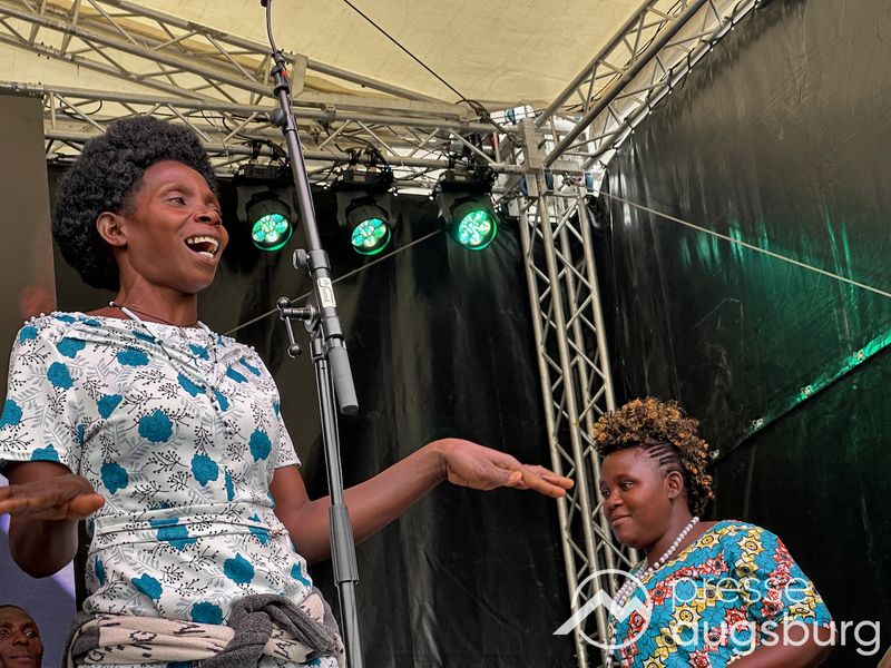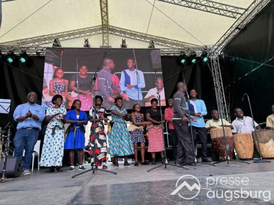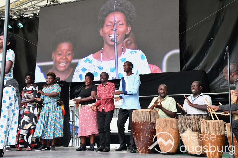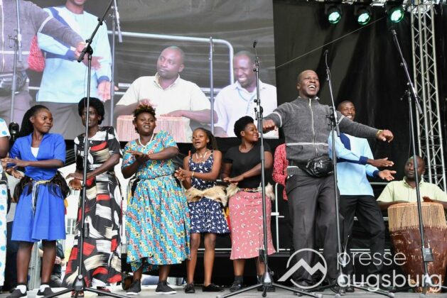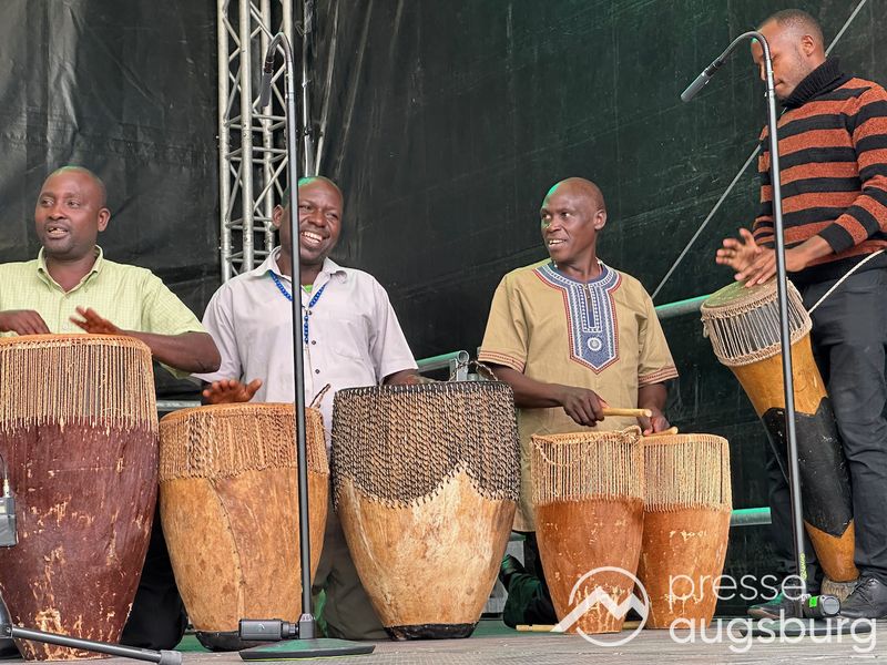 Wer die Ruhe suchte, der war auf dem Rathausplatz beim Auftaktfest an falscher Stelle. Denn still war es den Vormittag über so gut wie nie. So sorgte gleich zu Beginn das eigens komponierte Ulrichslied von Musikkomponist Robert Haas mit Band für gute Stimmung. Auch mehrere Kinderchöre und Chöre sowie ein Blasorchester hatten sich ein abwechslungsreiches musikalisches Programm überlegt. Bunte und weltkirchliche Rhythmen waren spätestens zu hören, als ein Chor aus Uganda auftrat. Ausgerüstet mit Trommeln und bunten Gewändern sorgten die Sängerinnen und Sänger für ein Gefühl von Afrika mitten in Augsburg. Jubelnder Beifall war die Antwort des Publikums.