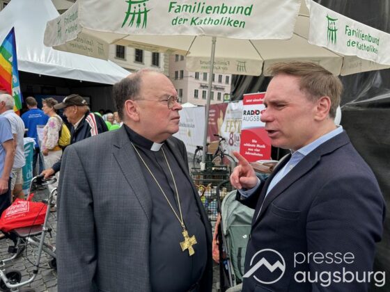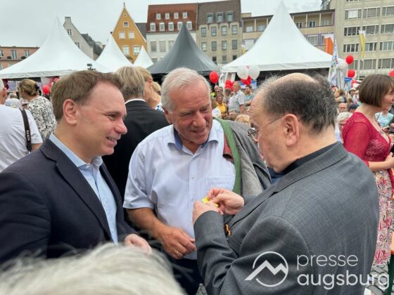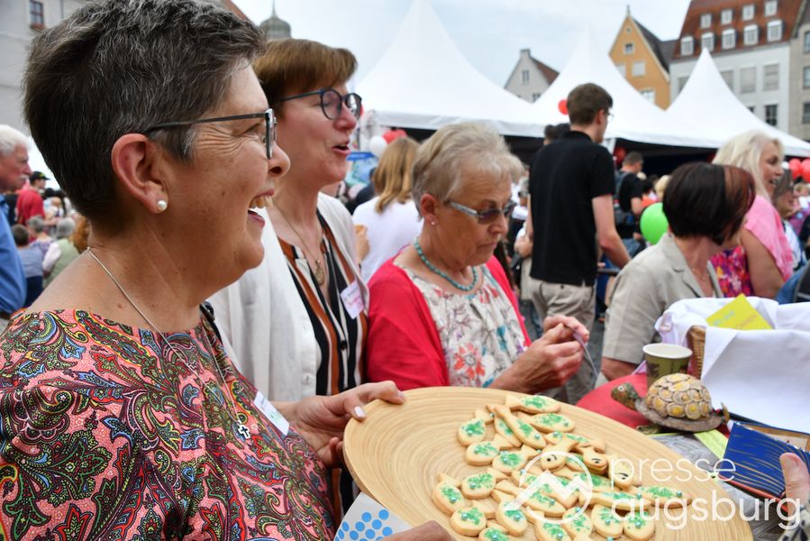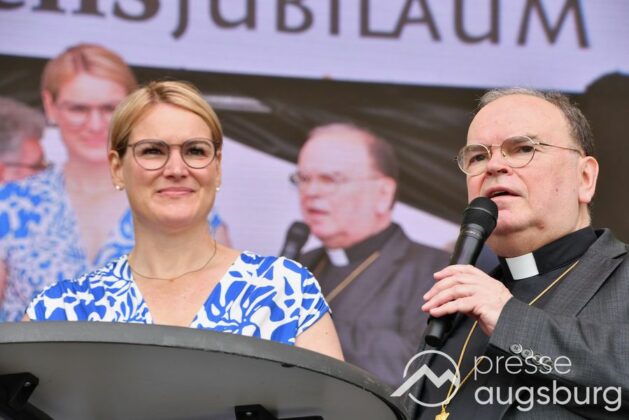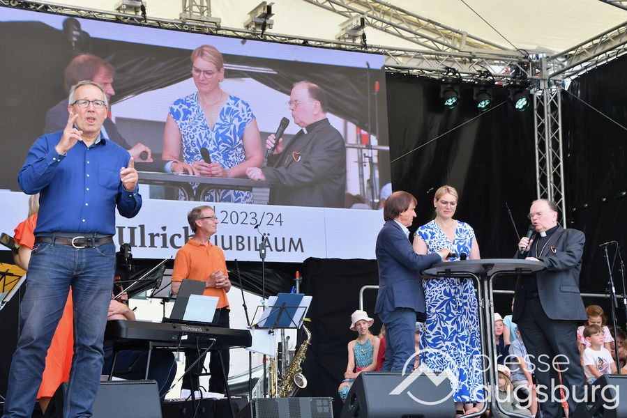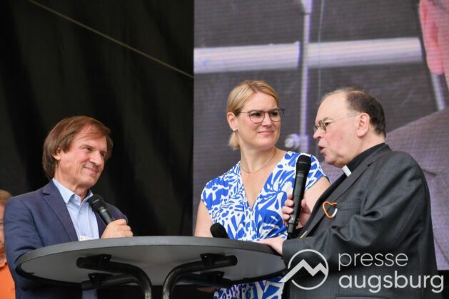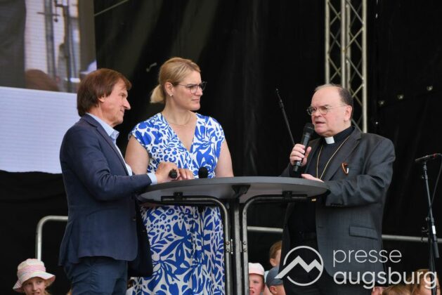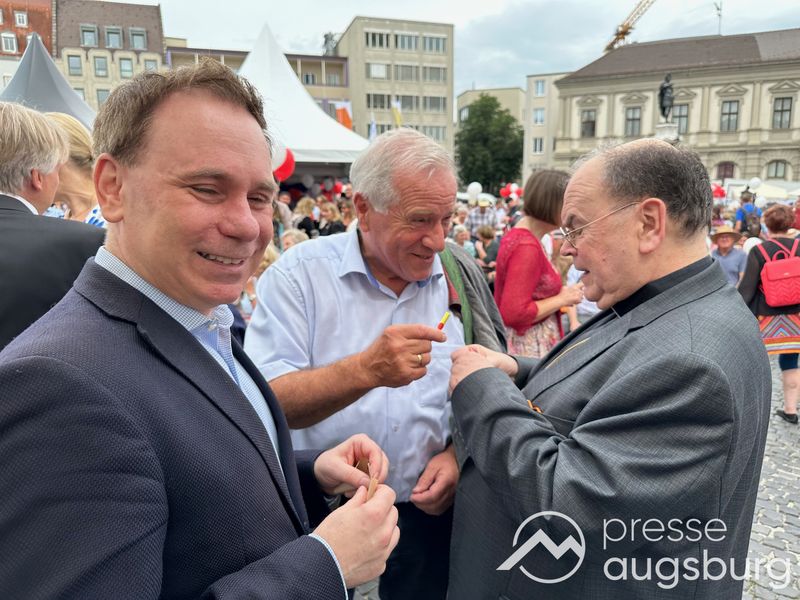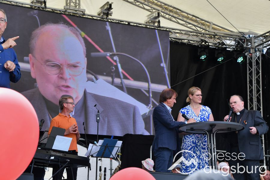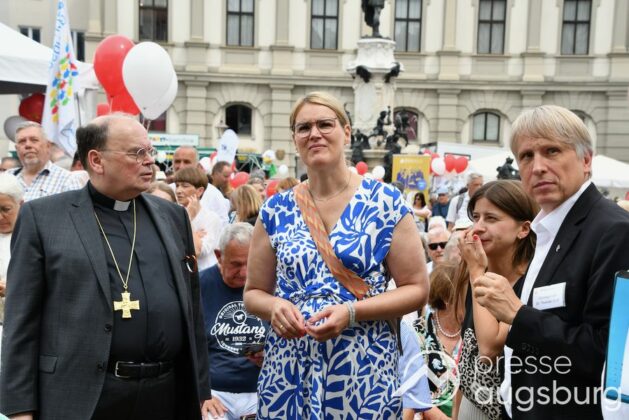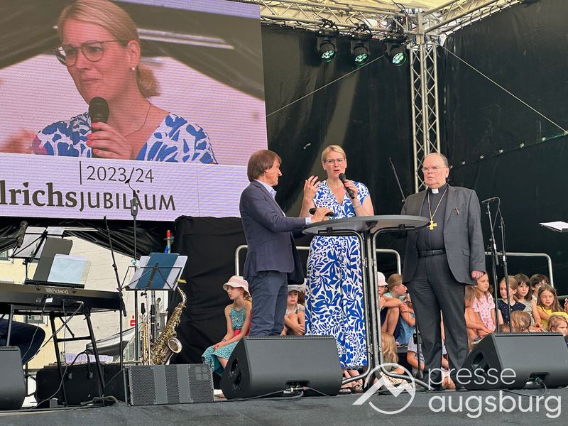 „Feiern können die Augsburger. Dass wir hier ein Familienfest daraus gemacht haben, ist großartig“, zeigte sich auch die Oberbürgermeisterin begeistert von den vielfältigen Ständen und dem bunten Bühnenprogramm. Der hl. Ulrich sei für sie nicht nur Stadtpatron, sondern auch ein Mensch, der Gutes gewirkt habe, zutiefst menschlich gewesen sei und dem man nacheifern könne. „Insofern sind die Werte, die Ulrich verkörperte, auch heute noch hochaktuell“, so Weber. Als „Stachel im Fleisch“ bezeichnete Bischof Bertram den Heiligen, der für ihn Vorbild sei. Ulrich habe gezeigt, dass Glaube erst dann Hand und Fuß habe, wenn er zur Tat werde. Karitatives, Bildung und Soziales hätten deshalb auch im Bistum Augsburg Priorität, betonte der Bischof bei strahlendem Sonnenschein und blauem Himmel.