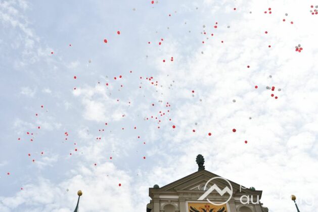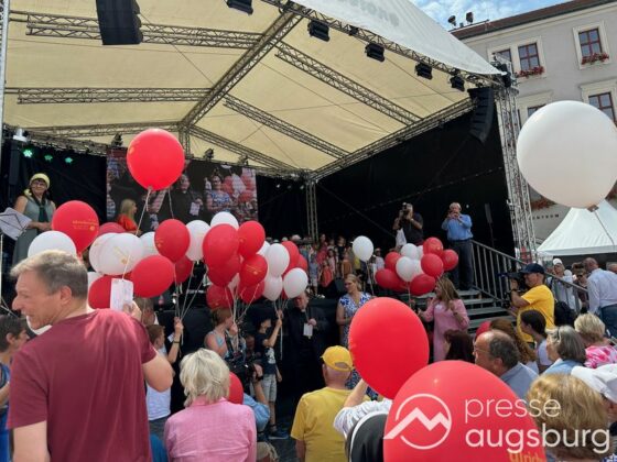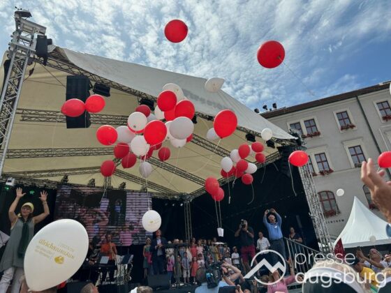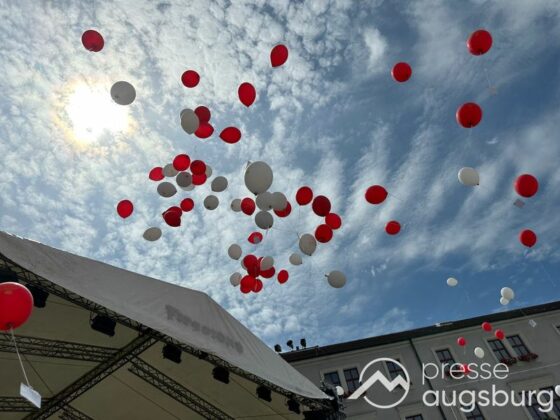 Während der heilige Ulrich den ganzen Vormittag in unterschiedlichen Formaten auf dem Rathausplatz präsent schien, so wurde gleichzeitig auch ein Zeichen in Richtung Himmel geschickt. Bei einem großen Luftballonstart richteten sich Kinder, aber auch Erwachsene mit Wünschen und Bitten an den Heiligen. Auf Zetteln hatten sie diese vorher notiert und an die Luftballonschnur gehängt. Der Himmel über dem Augsburger Rathaus leuchtete für diesen kurzen Moment rot und weiß. Die zahlreichen Menschen, die sich auf dem Platz eingefunden hatten, sahen staunend nach oben.