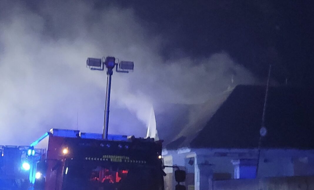 Bereits auf der Anfahrt war eine deutliche Rauchentwicklung sichtbar. Nach einer ersten Erkundung stellten die Einsatzkräfte einen Brand in der Zwischendecke des Gebäudes fest, der sich bereits auf den Dachstuhl auszudehnen drohte. Um eine weitere Brandausbreitung zu verhindern, wurde das Feuer im sogenannten Zangenangriff von zwei Seiten bekämpft.