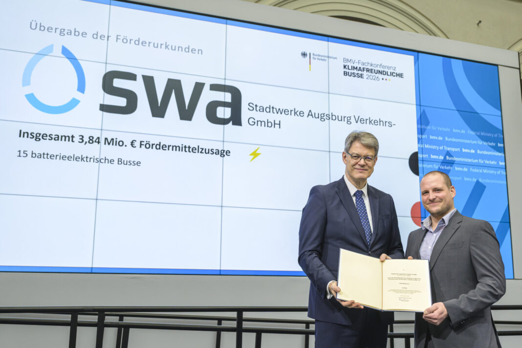 Im Rahmen einer Fachkonferenz in Berlin überreichte der Bund die Förderurkunde. Projektleiter Johannes Jung nahm diese entgegen und betonte: „Wir freuen uns sehr, dass wir die Förderung für die eBusse erhalten haben und damit einen sehr wichtigen Schritt für die Transformation der Mobilität in Augsburg leisten können.“