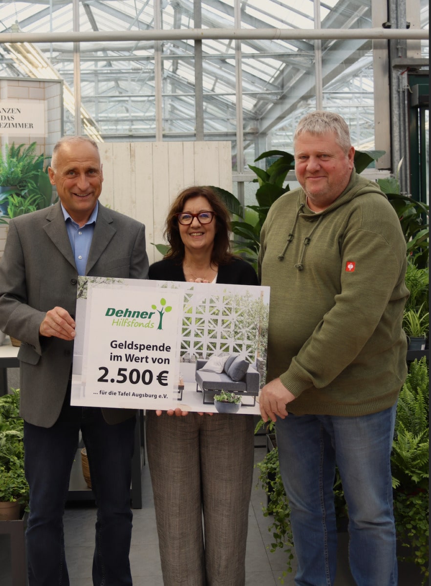 Rain am Lech – Die gemeinnützige Stiftung Dehner Hilfsfonds für Menschen in Notunterstützt dieses Jahr die Tafel Augsburg mit 2.500 Euro. Robert Engelhard, Marktleiter des Dehner Garten-Centers in Augsburg (Lechhausen), überreichte in diesem Zuge einen Spendenscheck an Susanne Ohnesorg und Gerhard Graf von der Tafel Augsburg. Damit setzt Dehner ein Zeichen gegen Armut. Denn gerade bei den Tafeln ist die Notlage in der Gesellschaft jeden Tag deutlich spürbar.