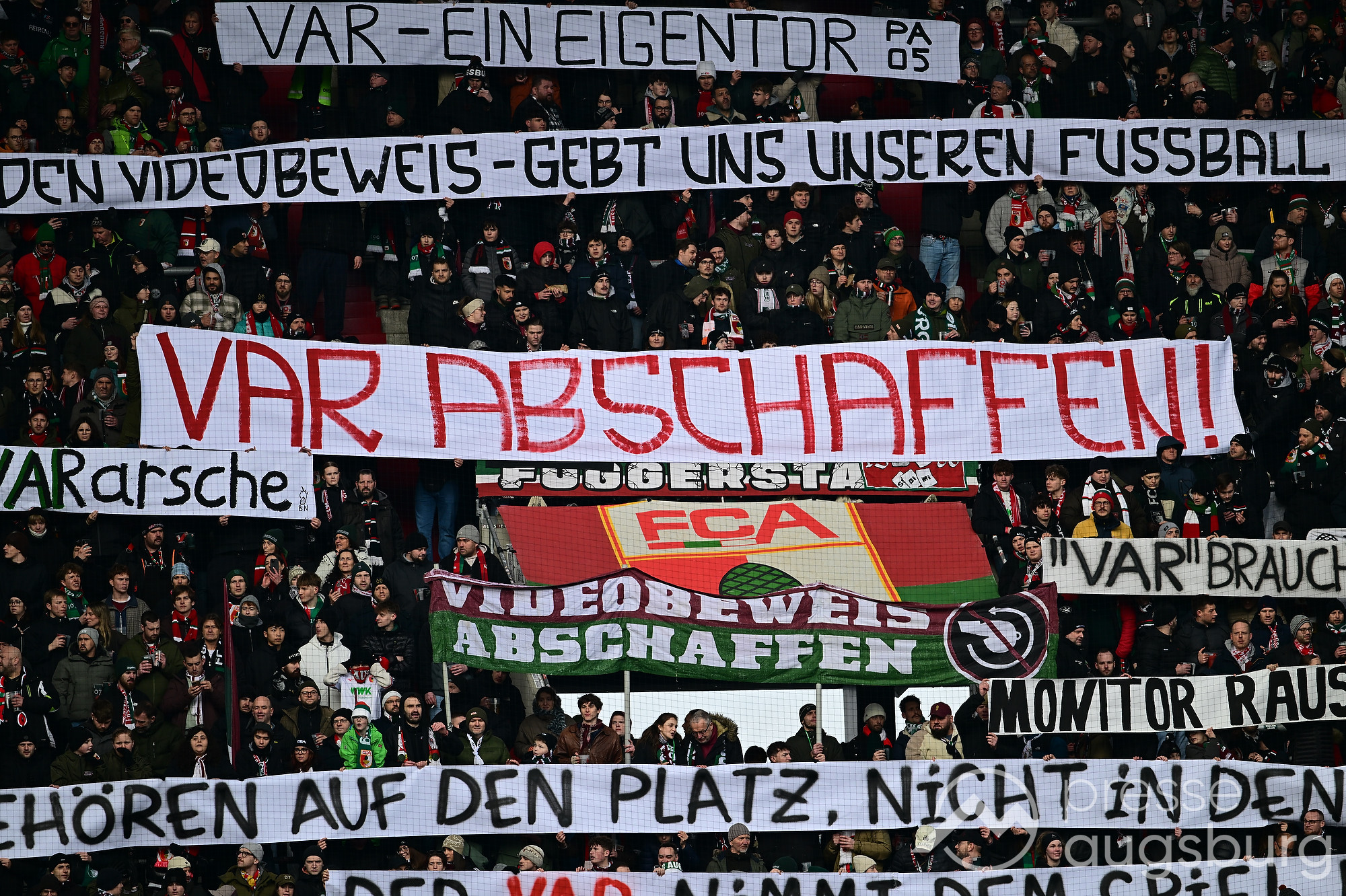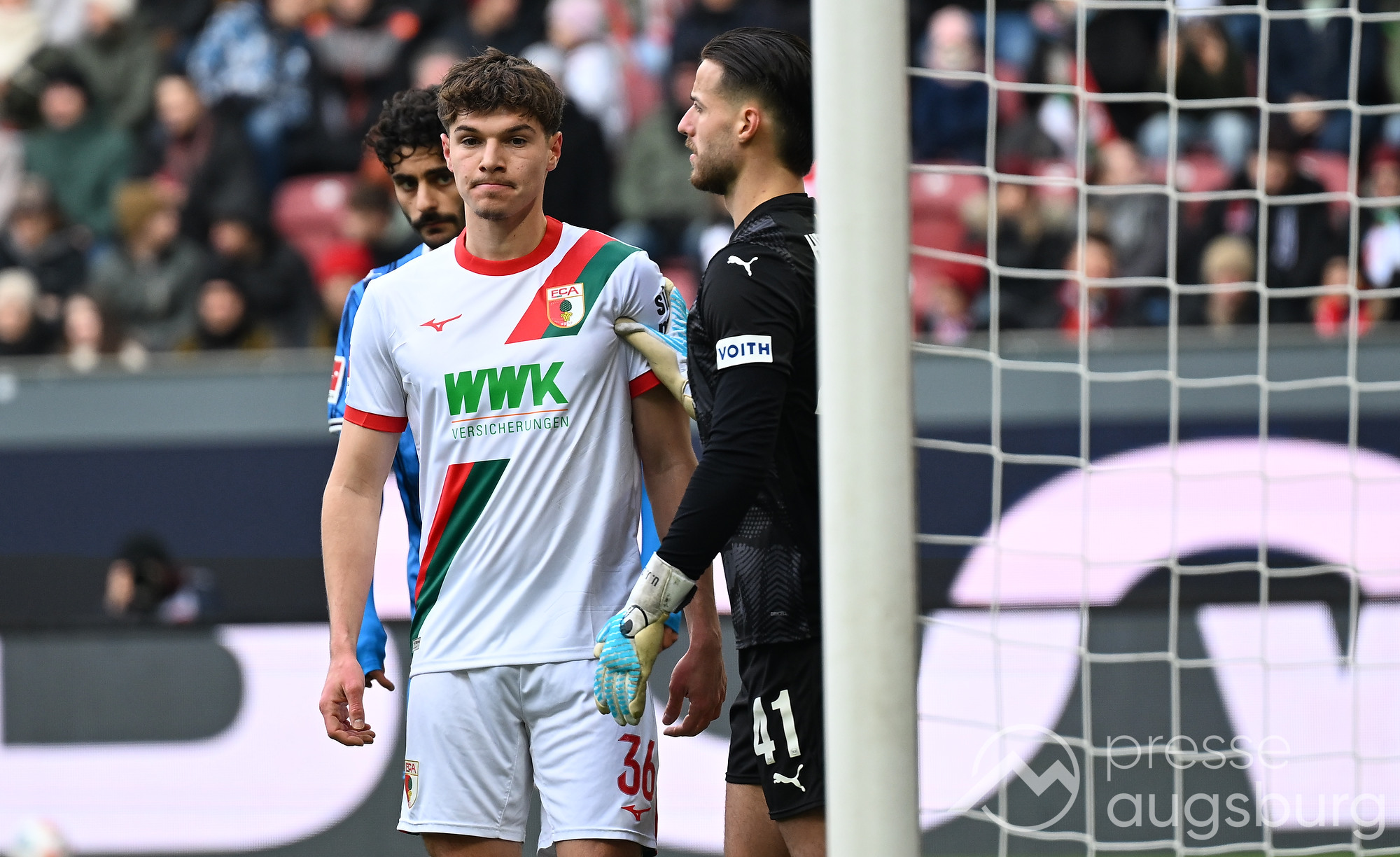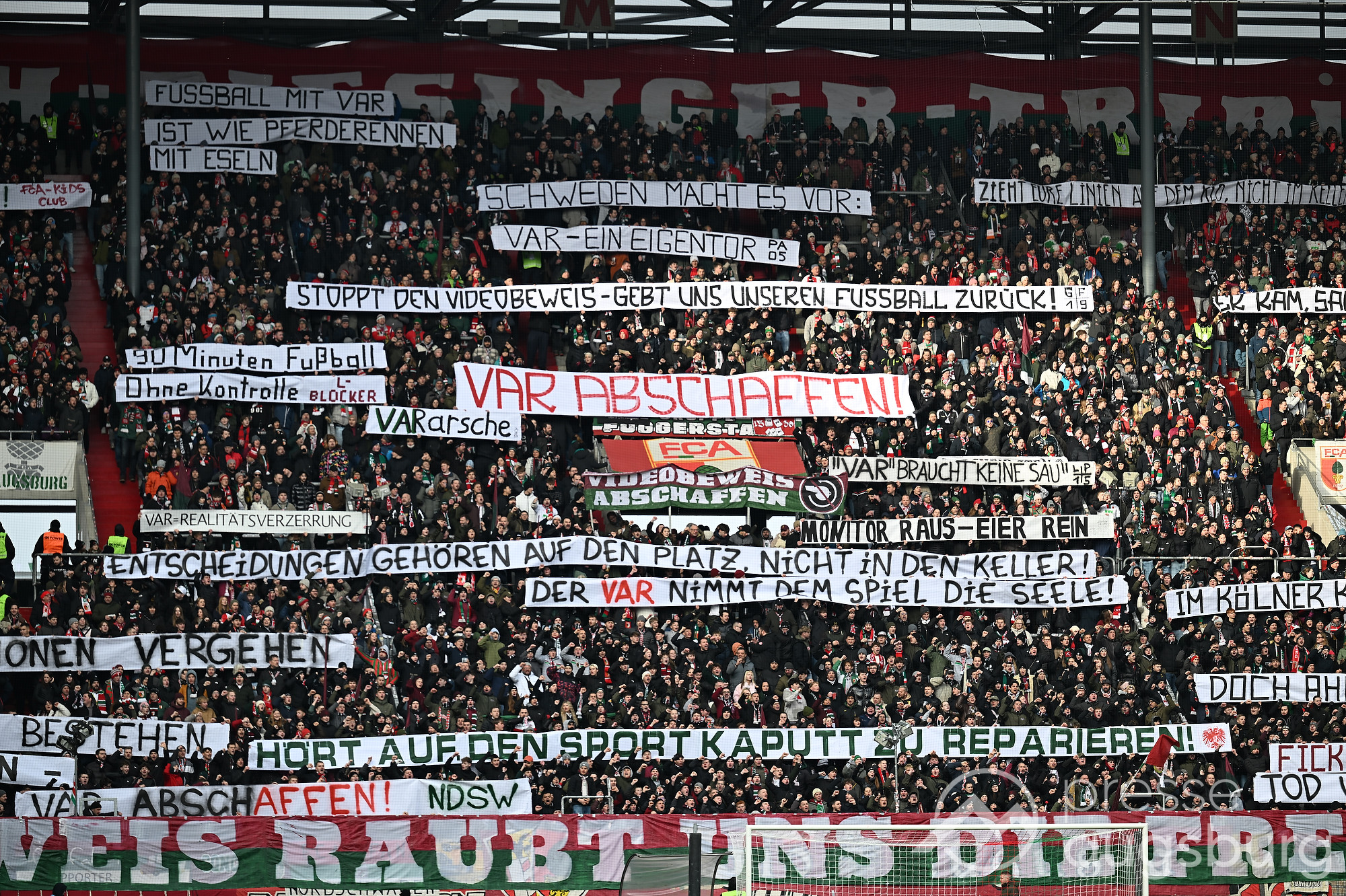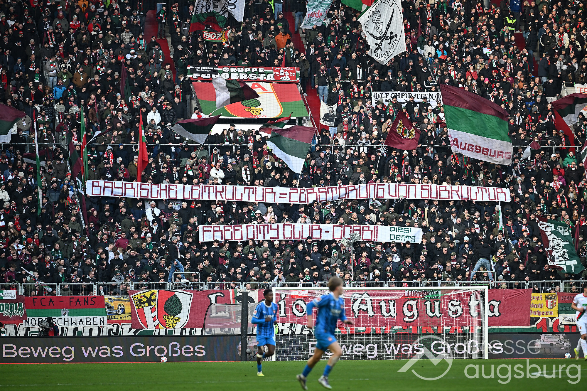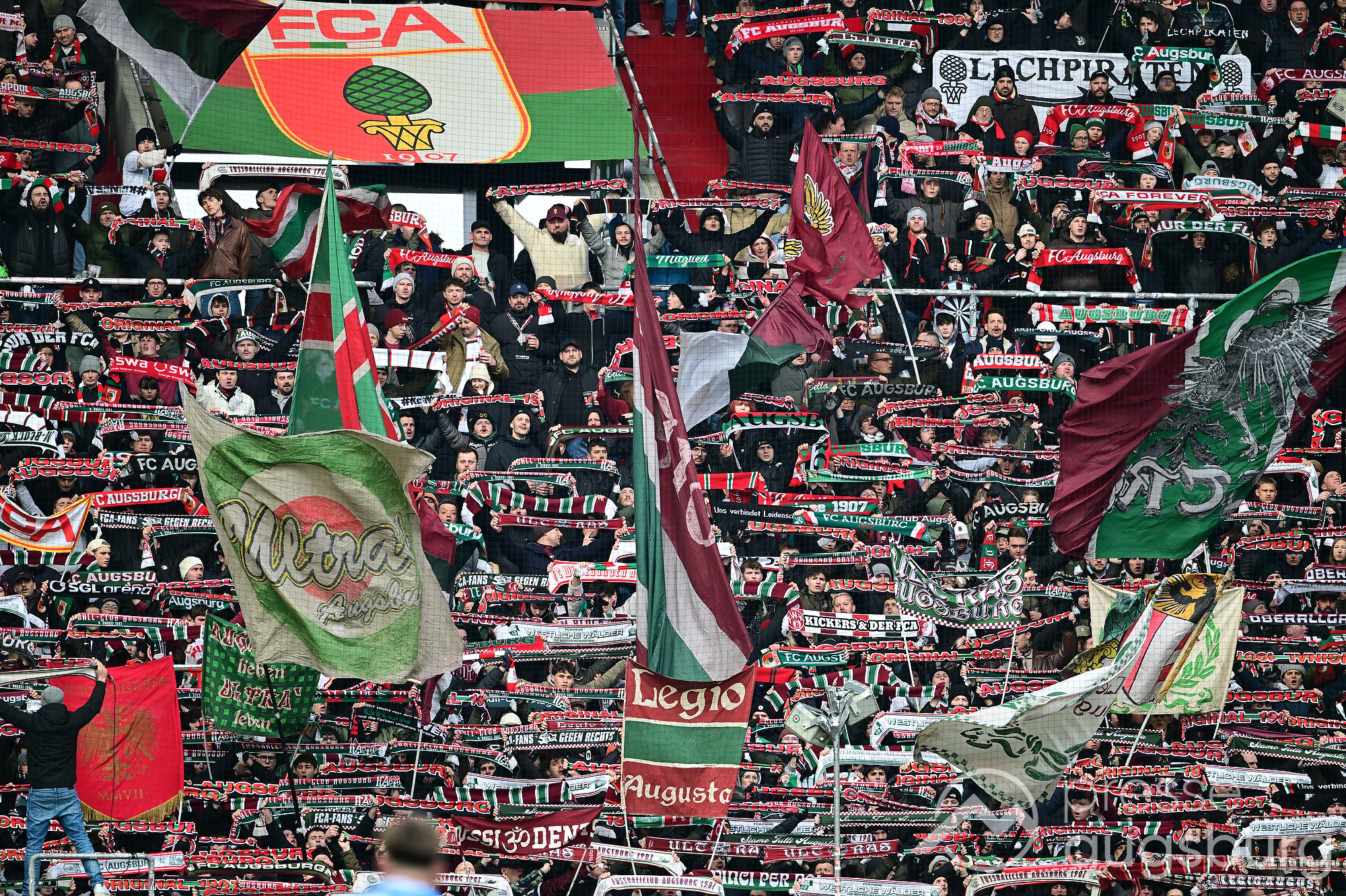 Kurz vor der Pause drückte der FCA das Spiel noch etwas weiter nach vorne, zwingende Möglichkeiten blieben jedoch Mangelware. Ein weiter Einwurf der Gäste brachte ebenso wenig Gefahr wie mehrere Standardsituationen auf beiden Seiten. Der Schiedsrichter pfiff pünktlich zur Halbzeit – in einem Spiel, das bis dahin kaum Höhepunkte geboten hatte. Auf den Rängen sorgten die Augsburger Fans mit zahlreichen Plakaten für Stimmung, während auf dem Platz vor allem Kampf statt Glanz dominierte.