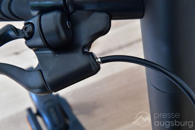 Bremsen kann man den STREETBOOSTER Two auf zwei Arten. Beim Bremsen mit der elektronischen Bremse (linke Seite am Lenker) gewinnt der Scooter via Rekuperation Energie zurück. Neben der elektronischen Bremse ist aber auch noch eine klassische Trommelbremse mit Bremshebel verbaut (rechte Seite am Lenker).