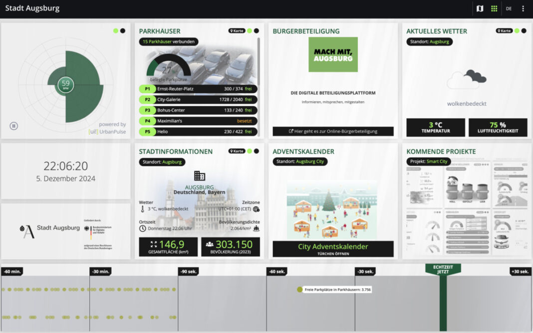 Das Smart City Dashboard bündelt zentrale Informationen zur Verkehrssituation in Echtzeit. In einem ersten Schritt stehen Daten zur Auslastung der Parkhäuser, zum Wetter, zum Adventskalender in der Augsburger Innenstadt und zur Plattform der Stadt machmit.augsburg.de zur Verfügung. In den anstehenden Wochen und Monaten wird das Angebot stetig erweitert. Es folgen Daten zum ÖPNV, Fahrrad- und Personenzähler, zu Leihsystemen, Lademöglichkeiten für E-Autos, Umwelt- und Klimathemen sowie zu Besucherströmen in der Innenstadt.