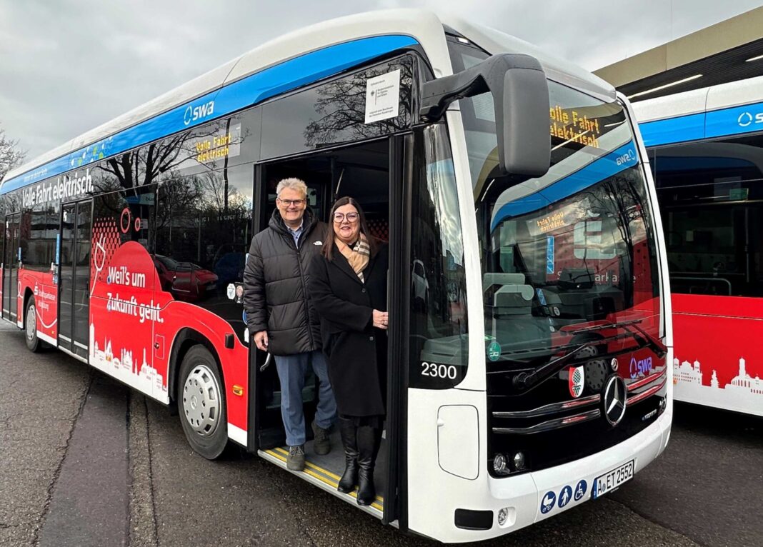 Die Stadtwerke Augsburg (swa) starten in eine neue Ära des emissionsfreien Nahverkehrs. Dazu haben sie jetzt zwei eBusse vorgestellt, die demnächst in den Linienbetrieb gehen werden. Beim Testbetrieb der beiden batterieelektrischen Fahrzeuge des Herstellers Mercedes gilt es unter anderem, herauszufinden, wie sich die Busse im Stadtverkehr bei unterschiedlichen Temperaturbedingungen verhalten, wie viele Kilometer die Busse im Augsburger Linienbetrieb mit einer Akkuladung tatsächlich zurücklegen können und worauf bei der Instandhaltung geachtet werden muss. Zudem werden Fahrerinnen und Fahrer für die eFahrzeuge geschult und können das Fahrverhalten testen.