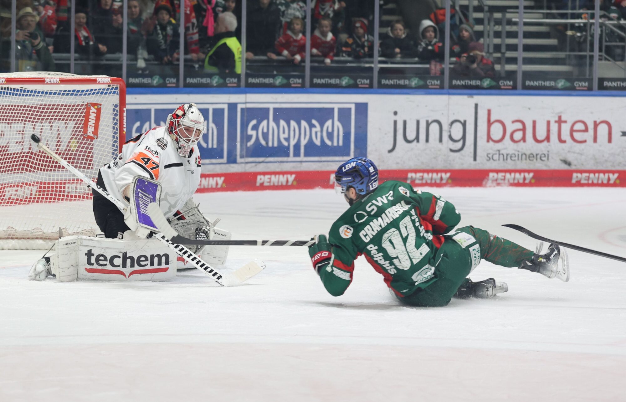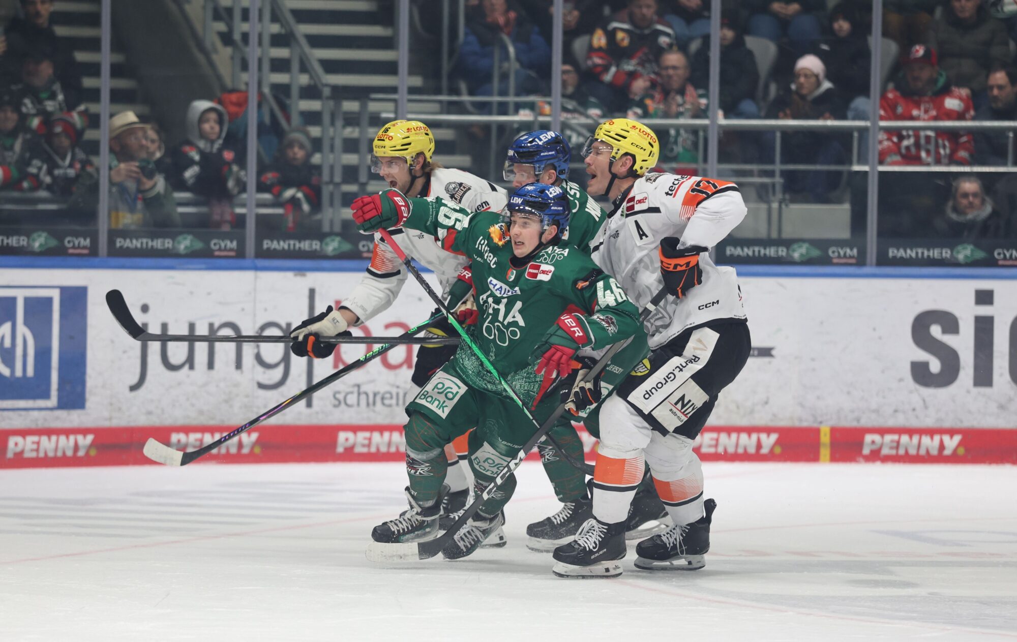 Nach vier Spielen ohne Sieg ging es für die Augsburger Panther am Freitagabend gegen den Vorletzten aus Frankfurt darum, endlich wieder voll zu punkten. Vor ausverkauftem Haus musste Trainer Bill Peters auf seinen Topstürmer Alex Grenier verzichten. Der Kanadier war nach einer Tätlichkeit gegen einen der Linienrichter im Spiel gegen Köln nachträglich für sechs Partien gesperrt worden – ein Bärendienst für seine Mannschaft, denn Grenier steht somit die nächsten Wochen nicht zur Verfügung. Mit Trevelyan und Busdeker kehrten zwei weitere, zuletzt angeschlagene Trümpfe zurück ins Lineup, was sich schon bald auszahlen sollte.