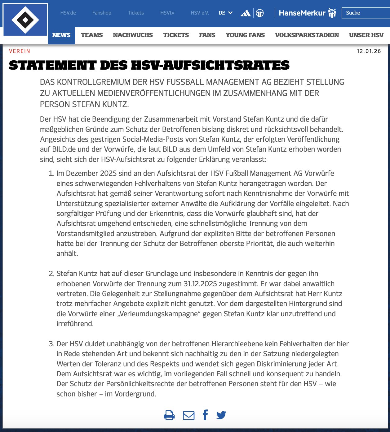 - Im Dezember 2025 sind an den Aufsichtsrat der HSV Fußball Management AG Vorwürfe eines schwerwiegenden Fehlverhaltens von Stefan Kuntz herangetragen worden. Der Aufsichtsrat hat gemäß seiner Verantwortung sofort nach Kenntnisnahme der Vorwürfe mit Unterstützung spezialisierter externer Anwälte die Aufklärung der Vorfälle eingeleitet. Nach sorgfältiger Prüfung und der Erkenntnis, dass die Vorwürfe glaubhaft sind, hat der Aufsichtsrat umgehend entschieden, eine schnellstmögliche Trennung von dem Vorstandsmitglied anzustreben. Aufgrund der expliziten Bitte der betroffenen Personen hatte bei der Trennung der Schutz der Betroffenen oberste Priorität, die auch weiterhin anhält.