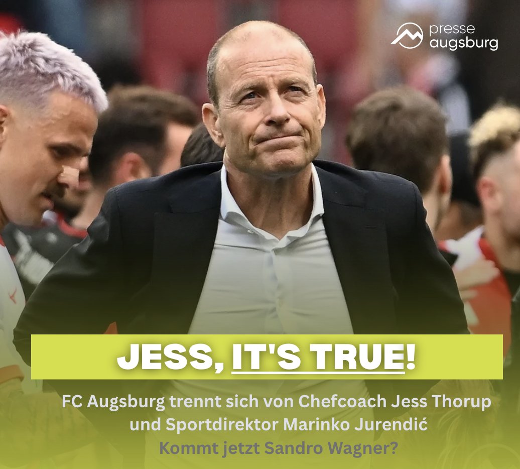 Was Presse Augsburg bereits am Mittwochabend exklusiv berichtete, ist nun offiziell: Der FC Augsburg leitet einen tiefgreifenden personellen Umbruch in der sportlichen Führung ein. Cheftrainer Jess Thorup und Sportdirektor Marinko Jurendić müssen den Verein verlassen. Wer Thorups Nachfolge antreten wird, wurde am frühen Freitagabend noch nicht bekannt gegeben. Nach Informationen von Presse Augsburg soll jedoch Sandro Wagner als neuer Cheftrainer bereitstehen.