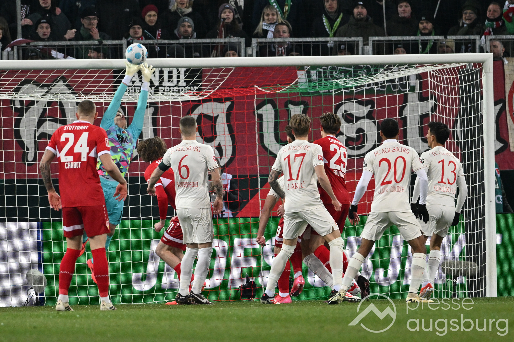 Angetrieben von rund siebentausend Schlachtenbummlern drückte der VfB schon früh auf das von Dahmen statt Labrovic gehütete Augsburger Tor. Die beste von mehreren guten Stuttgarter Torchancen in der Anfangsphase hatte ausgerechnet Demirovic. Der letztjährige FCA-Captain köpfte aus kurzer Distanz wenige Zentimeter am Pfosten vorbei (20.). Zu diesem Zeitpunkt waren Augsburger Chancen noch so selten wie Gold am Wertachstrand. Dies sollte sich aber schon bald ändern.