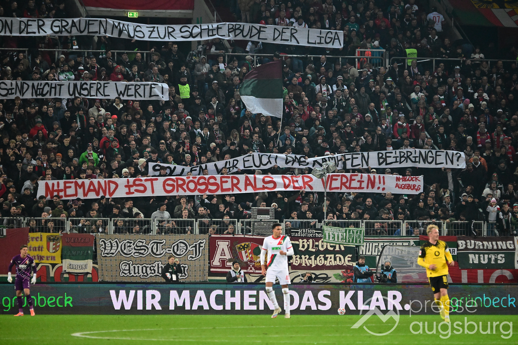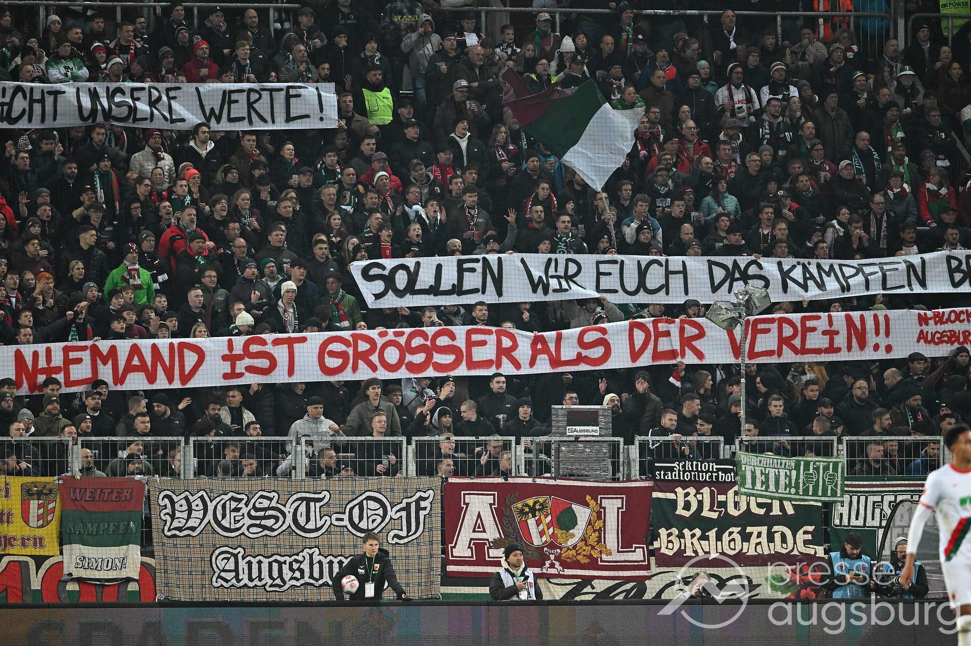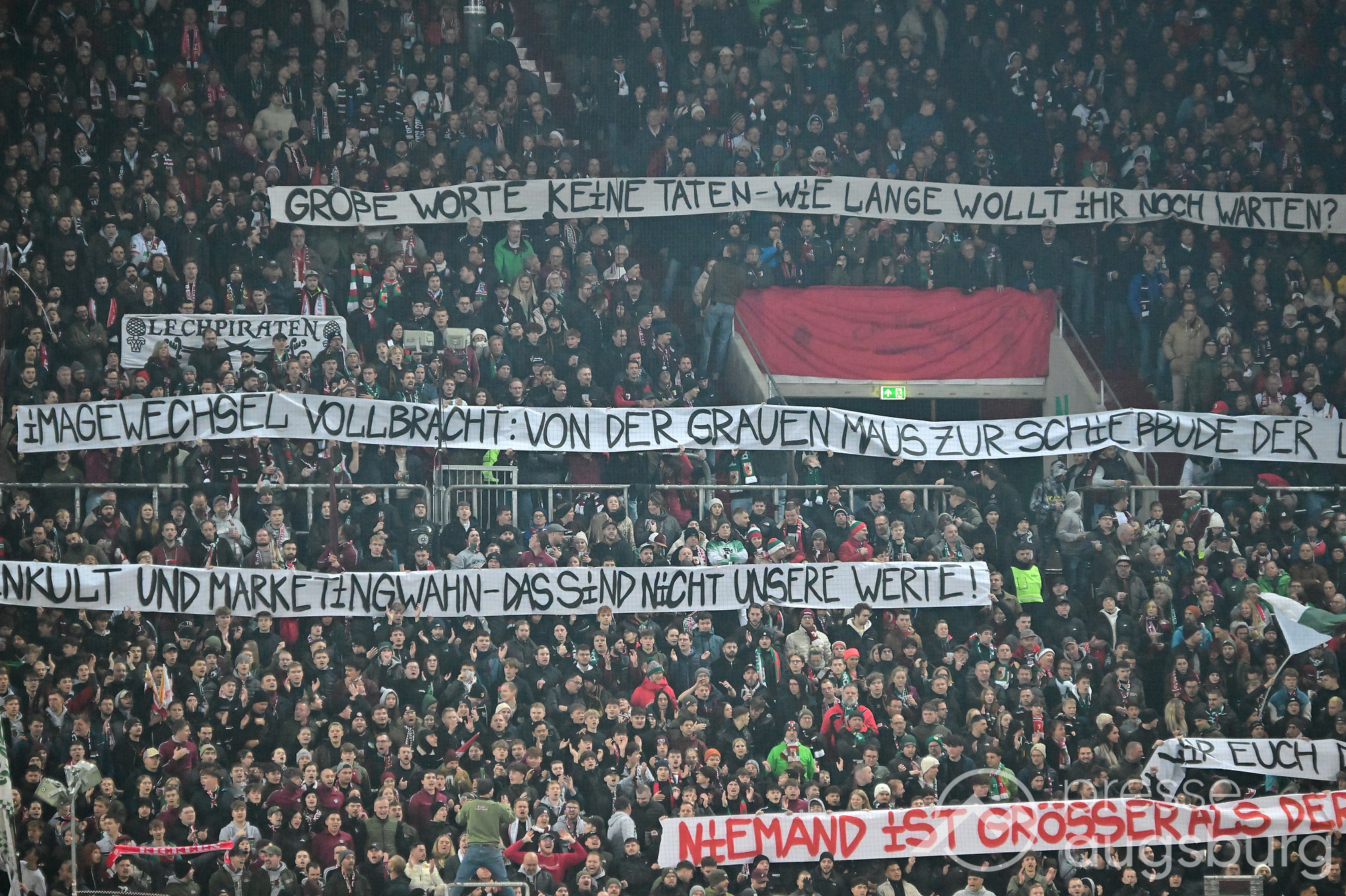 Mit Sprüchen wie „Große Worte, keine Taten – wie lange wollt ihr noch warten?“, „Imagewechsel vollbracht: von der grauen Maus zur Schießbude der Liga“ und „Personenkult und Marketingwahn – das sind nicht unsere Werte“ kritisierten die Fans die aktuelle Entwicklung des Vereins. Sie stören sich besonders daran, dass immer mehr Wagner im Mittelpunkt steht – und nicht der FCA selbst.