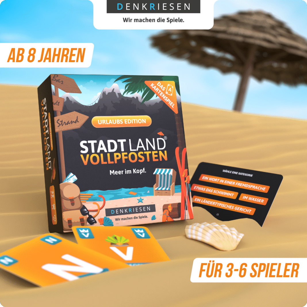 Die Urlaubs Edition ist in zwei Varianten erhältlich: Als klassischer DIN A4-Spielblock mit 50 Blättern für alle, die gern schreiben und Punkte zählen. Oder als handliches Kartenspiel, das besonders für unterwegs, im Koffer oder am Strand praktisch ist. Hier stehen spontane Wortduelle im Vordergrund – kompakt, flexibel und schnell erklärt. Beide Versionen basieren auf dem bewährten Stadt Land Vollpfosten-Prinzip und bieten Sommerfeeling pur – drinnen wie draußen, allein zu zweit oder in großer Runde.