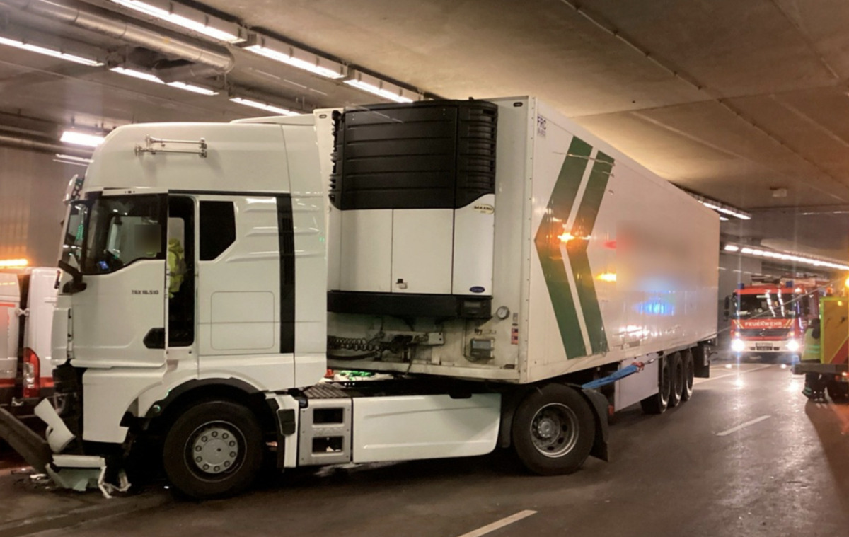 Kurz vor 6 Uhr kam es in Fahrtrichtung Osten zu einem Unfall, als ein weißer Kühltransporter bei der Abfahrt zur Passauer Straße mit dem Fahrbahntrenner kollidierte. Der Fahrer blieb dabei unverletzt. Die Polizei stellte auslaufenden Diesel am Lkw fest, woraufhin die Tunnelröhre komplett gesperrt wurde und die Feuerwehr alarmiert wurde.