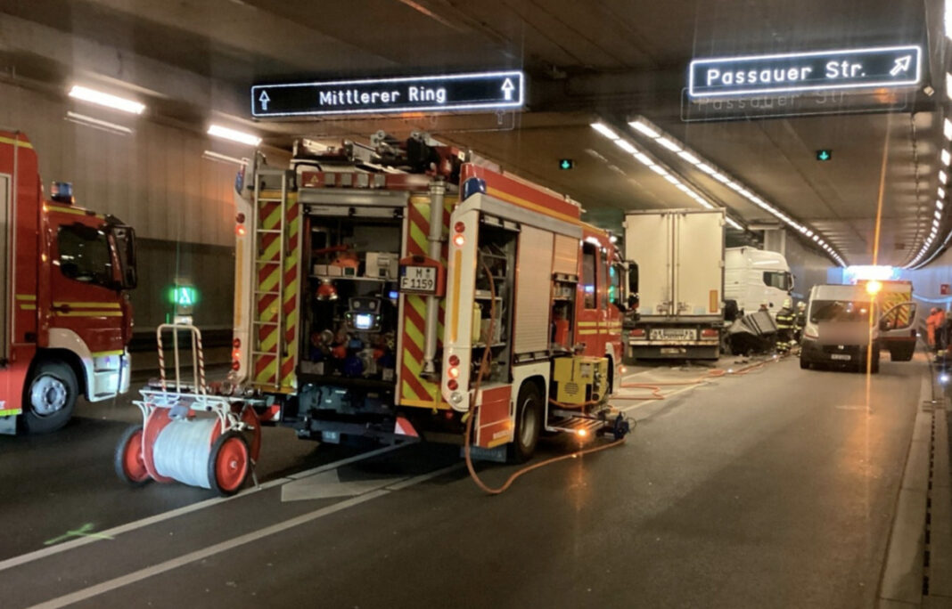 Am Sonntagmorgen wurde die Feuerwehr München mehrfach zu einem Unfall im Heckenstallertunnel gerufen. Die aufwendigen Bergungsmaßnahmen führten dazu, dass die Südröhre des Tunnels bis in den späten Vormittag blockiert blieb.