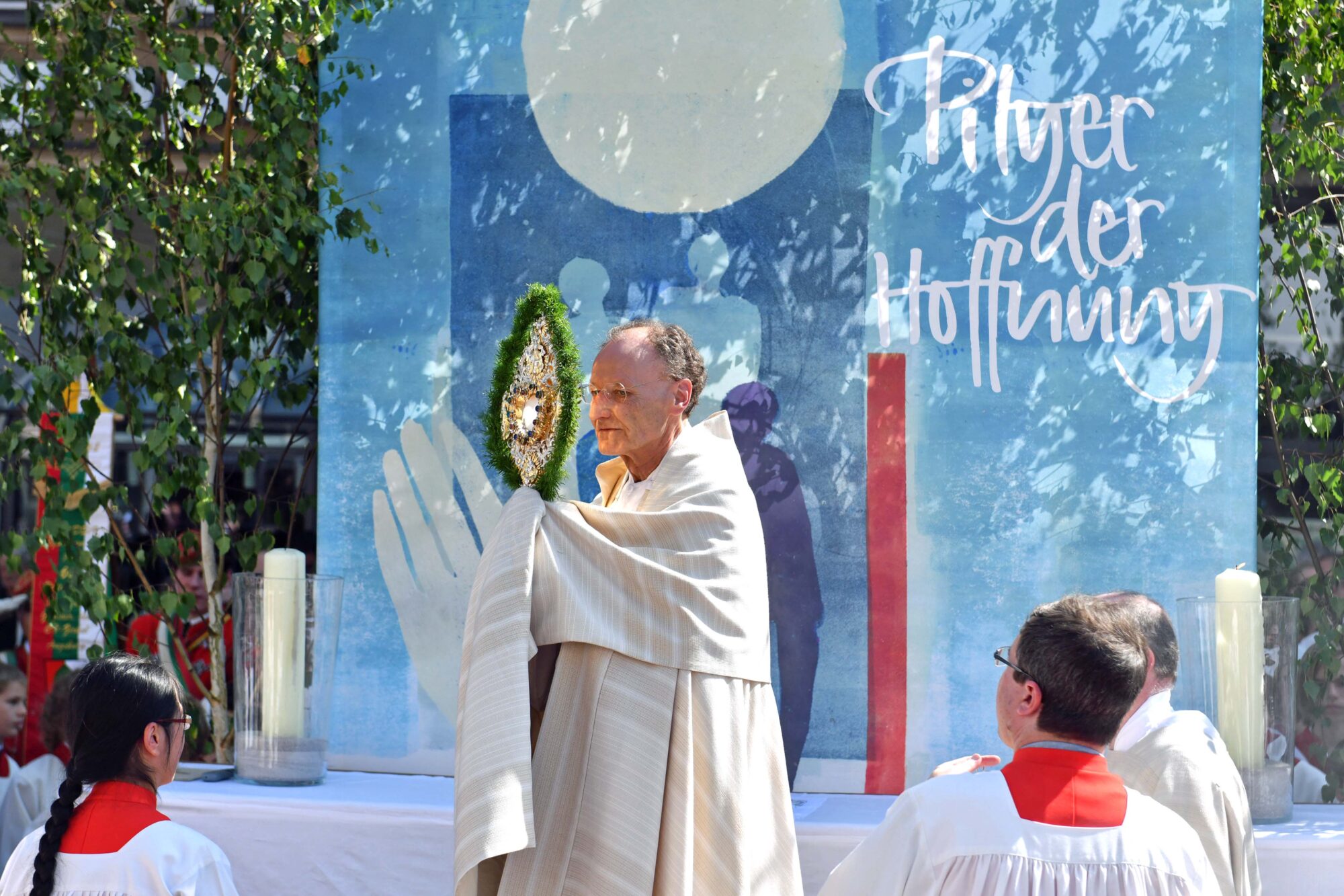 „Deshalb zeigen wir die Hostie als Brot für die Welt, als Angebot für unsere Stadt“, sagte der Bischof. „Wenn wir heute auf die Straße gehen, wollen wir uns nicht selbst präsentieren, sondern wir zeigen den Herrn.“