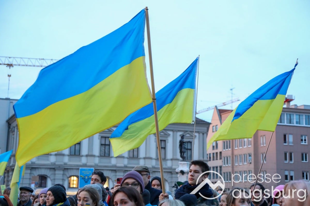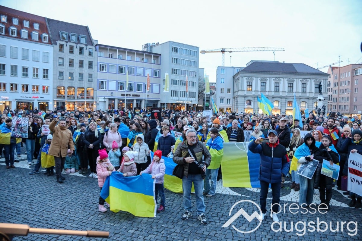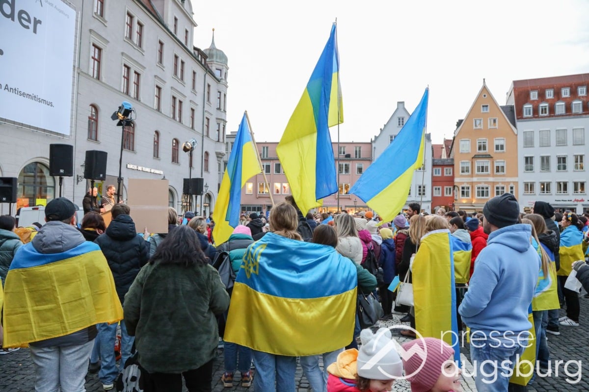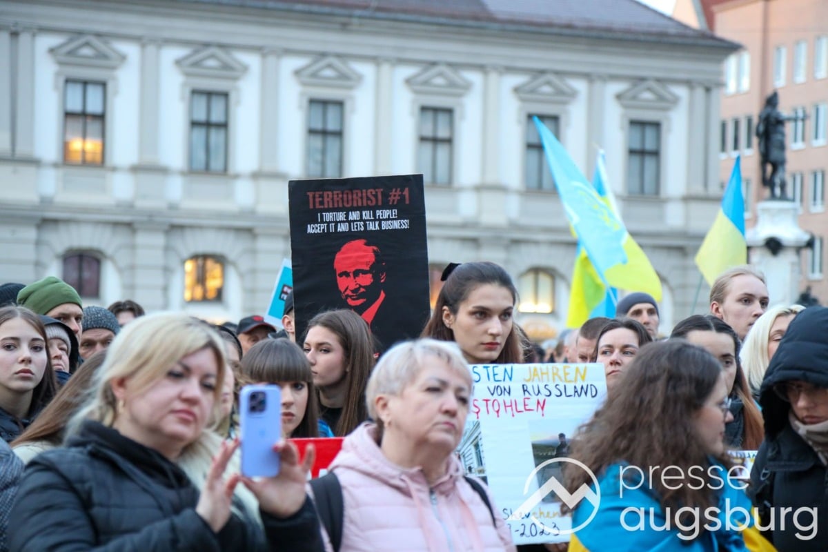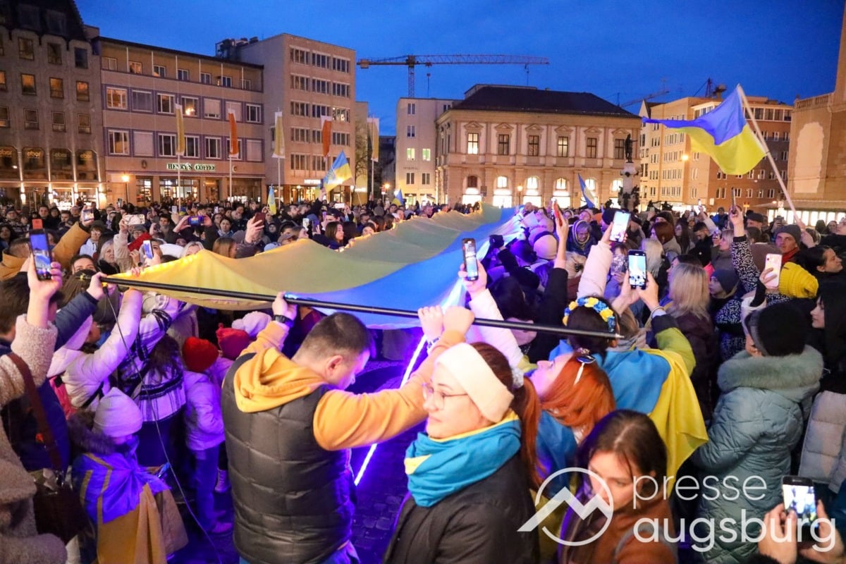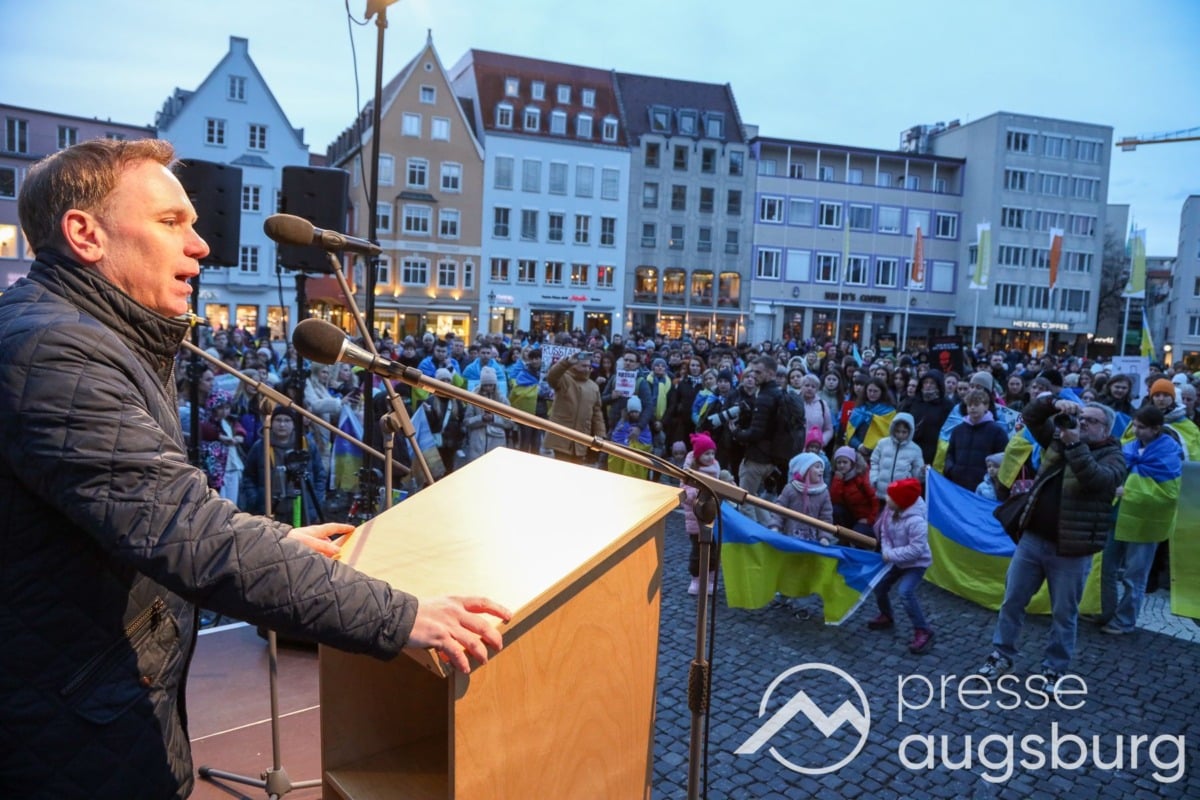 Laut ersten Schätzungen nahmen am Samstag etwa 400 Teilnehmer an einer Solidaritätskundgebung auf dem Augsburger Rathausplatz zum Jahrestag des Überfalls der Ukraine durch Russland teil. Neben Politikern verschiedenster Parteien kam unter anderem der Bürgermeister der Augsburger Projektpartnerstadt Oleh Demchenko zu Wort.