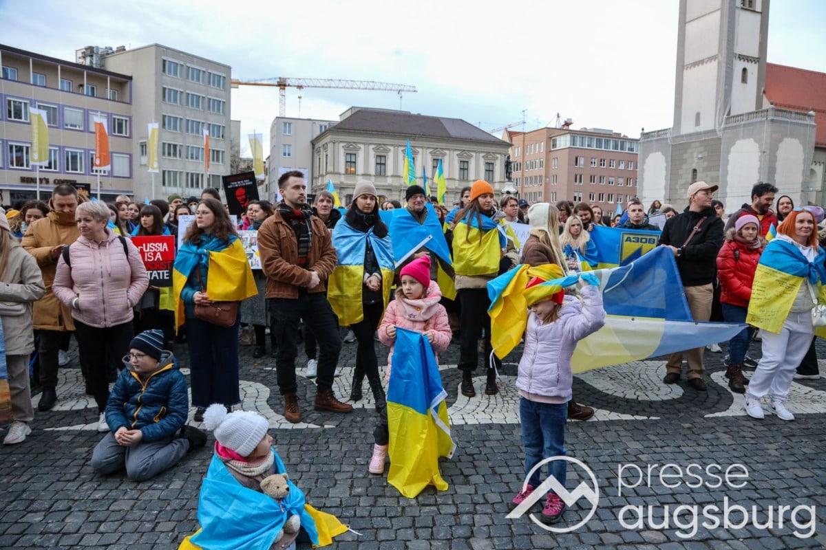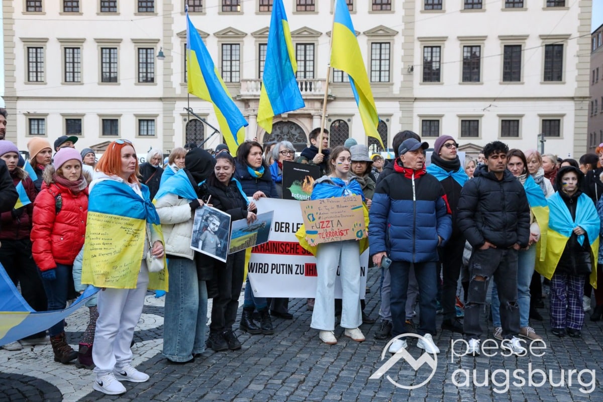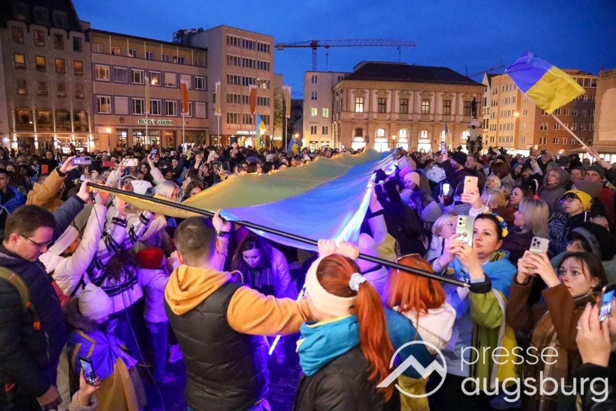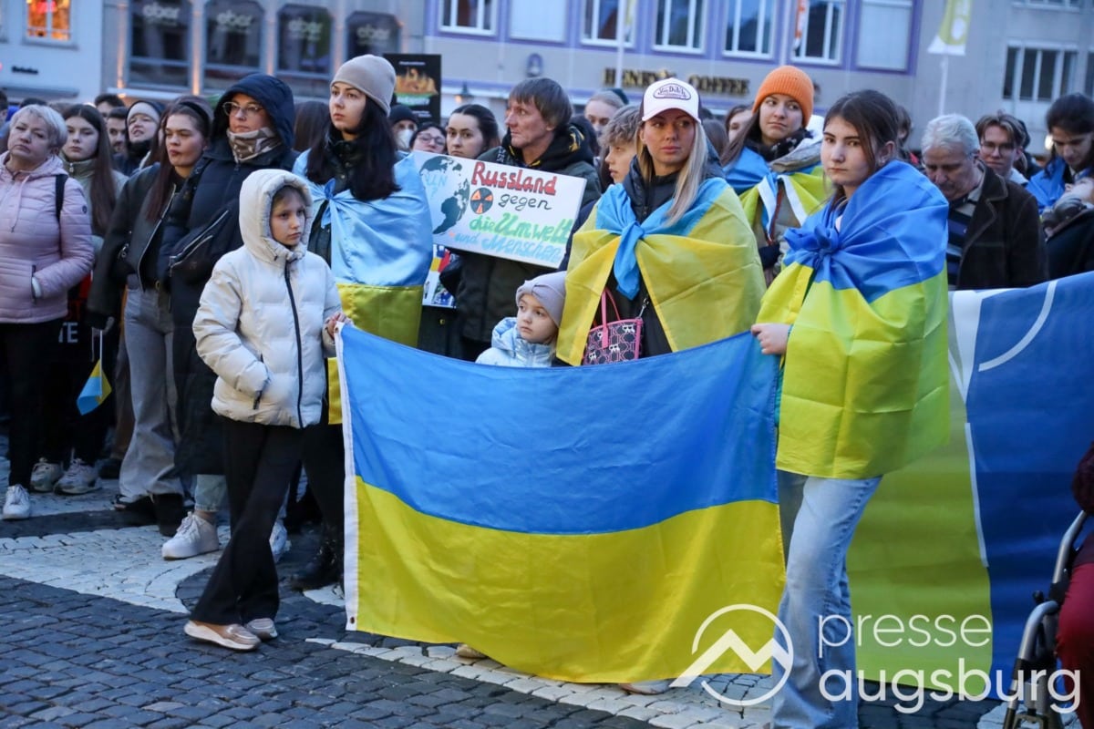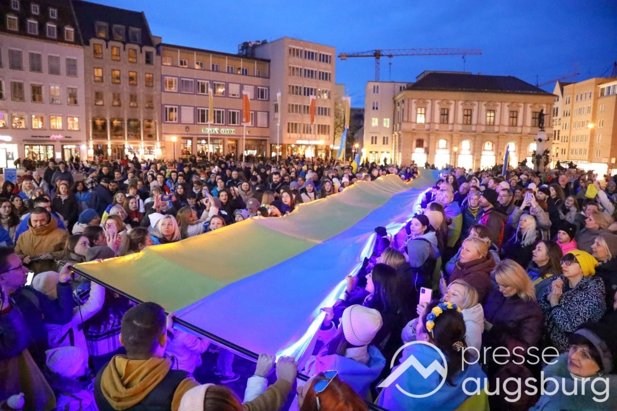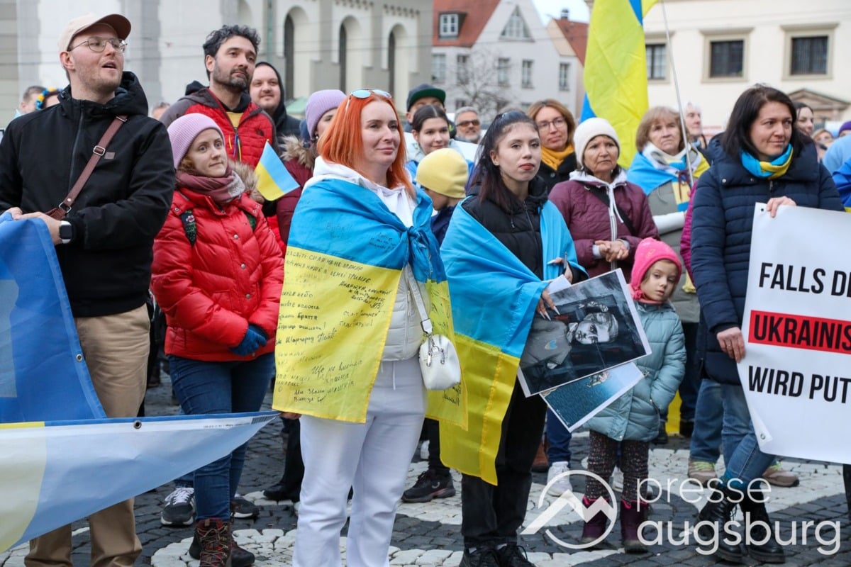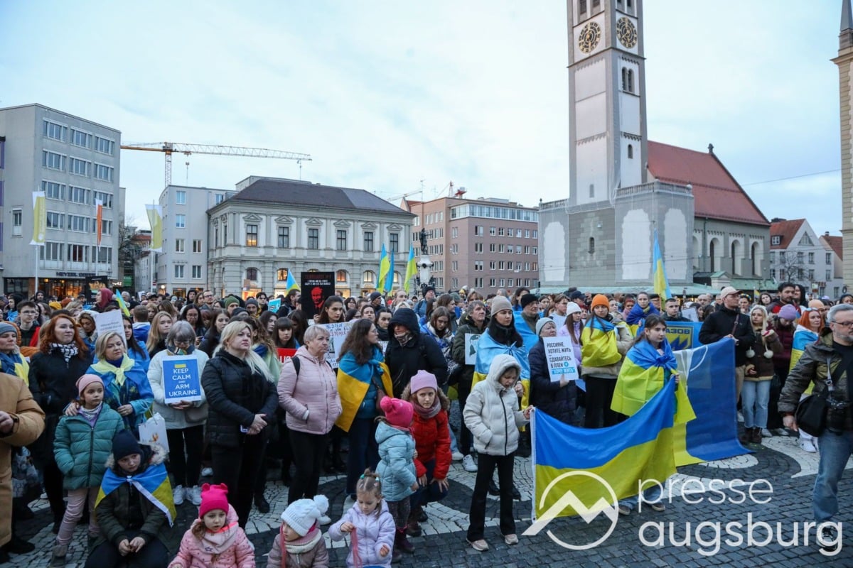 Laut ersten Schätzungen nahmen am Samstag etwa 400 Teilnehmer an einer Solidaritätskundgebung auf dem Augsburger Rathausplatz zum Jahrestag des Überfalls der Ukraine durch Russland teil. Neben Politikern verschiedenster Parteien kam unter anderem der Bürgermeister der Augsburger Projektpartnerstadt Oleh Demchenko zu Wort.