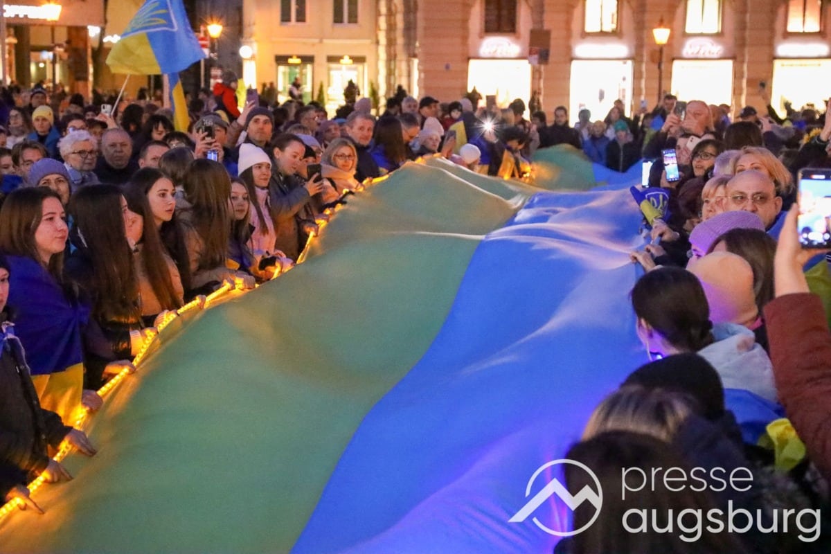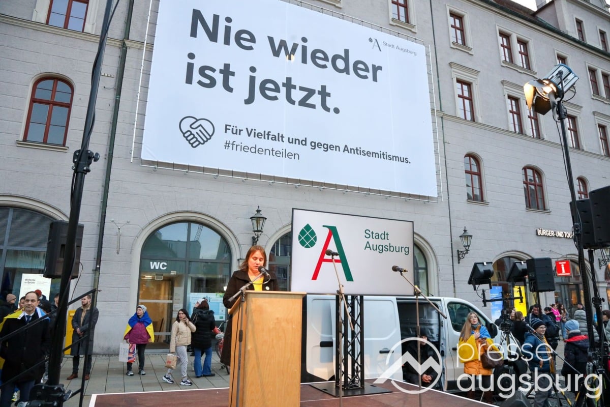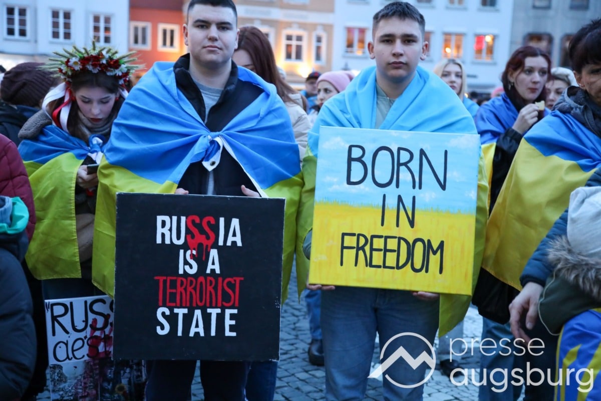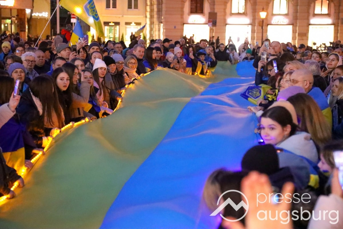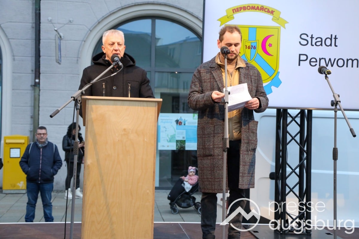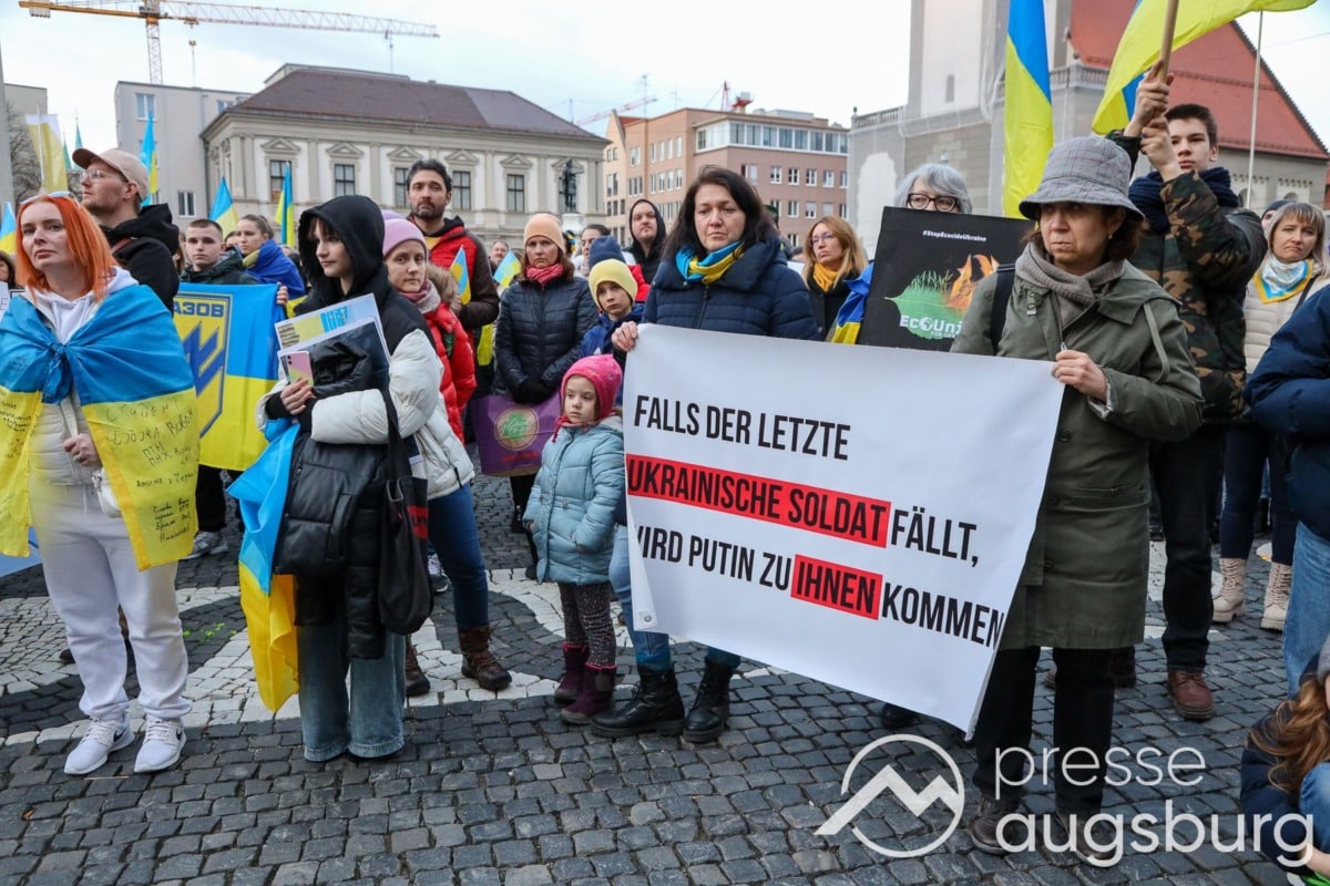 Laut ersten Schätzungen nahmen am Samstag etwa 400 Teilnehmer an einer Solidaritätskundgebung auf dem Augsburger Rathausplatz zum Jahrestag des Überfalls der Ukraine durch Russland teil. Neben Politikern verschiedenster Parteien kam unter anderem der Bürgermeister der Augsburger Projektpartnerstadt Oleh Demchenko zu Wort.