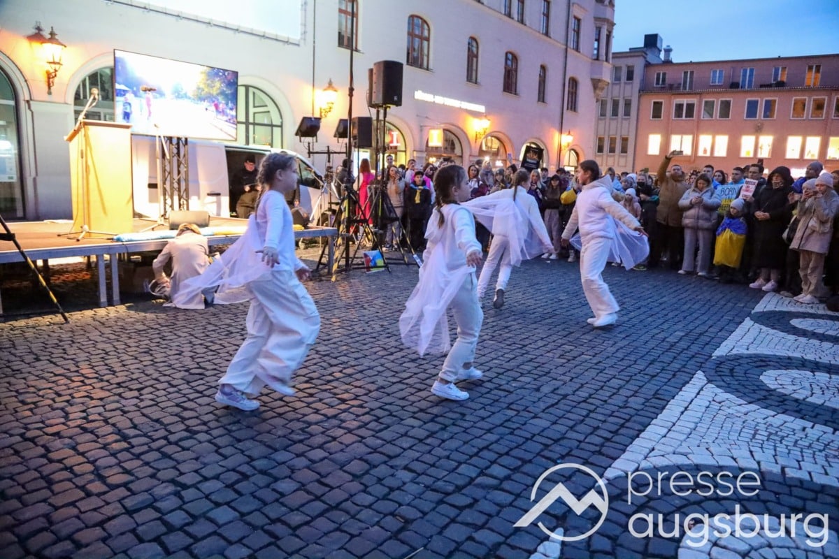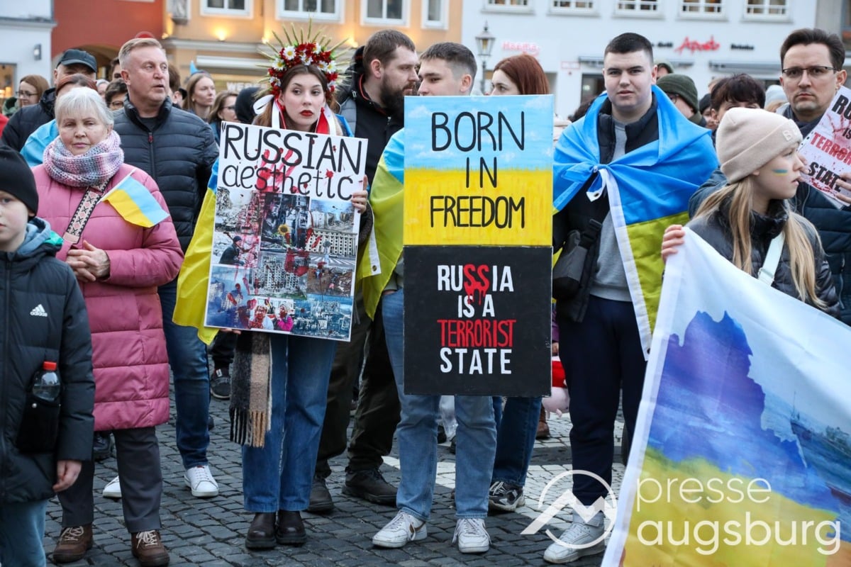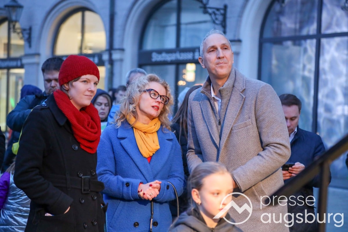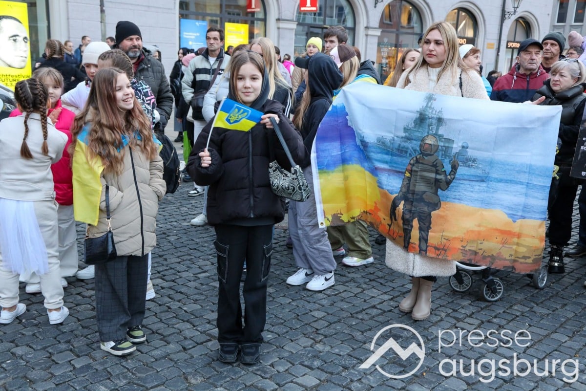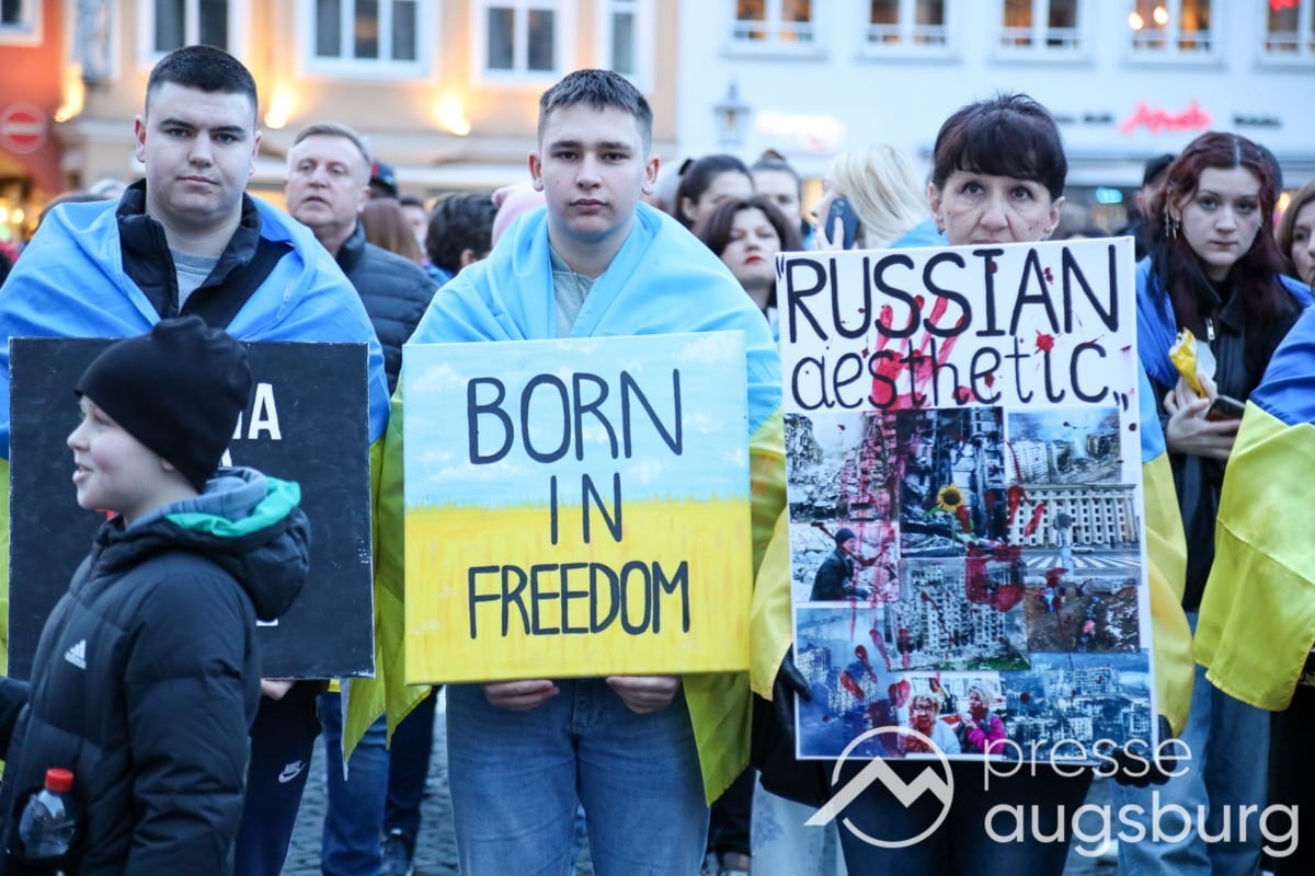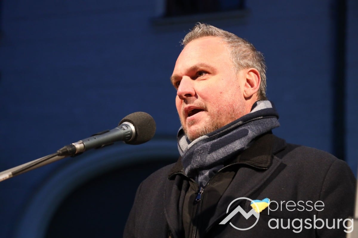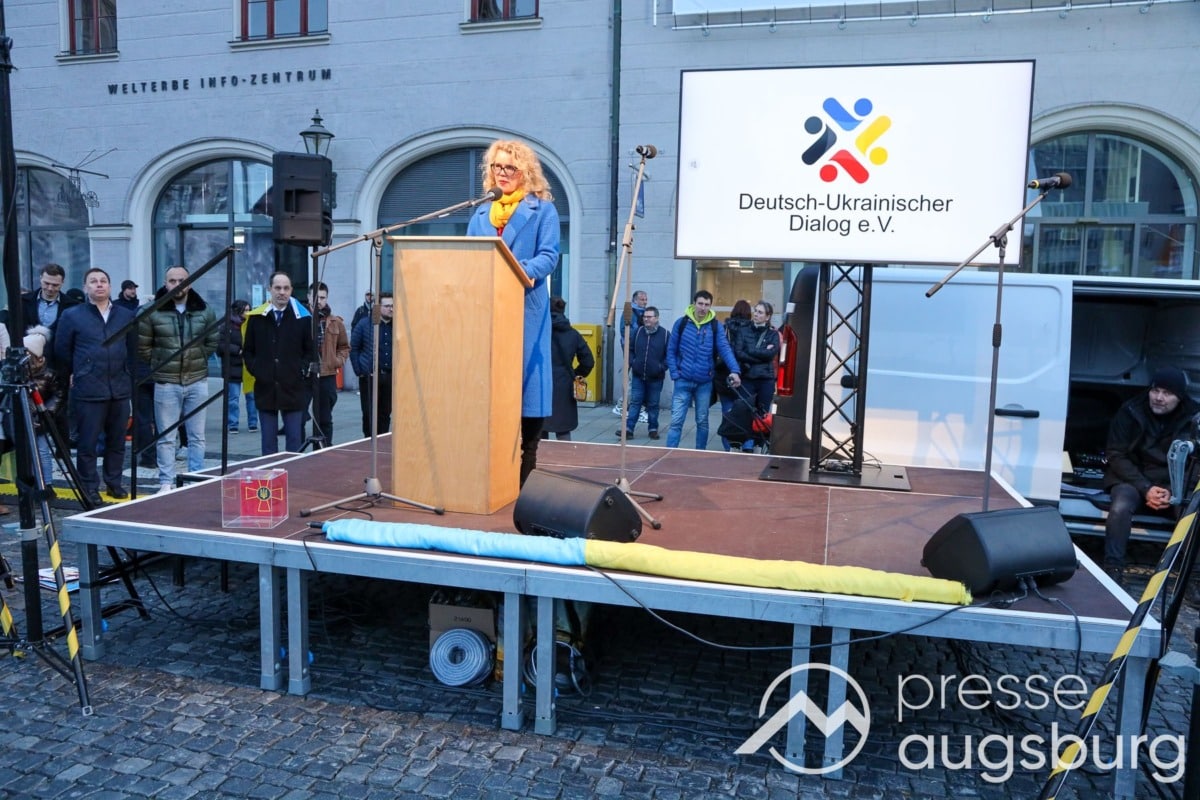 Laut ersten Schätzungen nahmen am Samstag etwa 400 Teilnehmer an einer Solidaritätskundgebung auf dem Augsburger Rathausplatz zum Jahrestag des Überfalls der Ukraine durch Russland teil. Neben Politikern verschiedenster Parteien kam unter anderem der Bürgermeister der Augsburger Projektpartnerstadt Oleh Demchenko zu Wort.