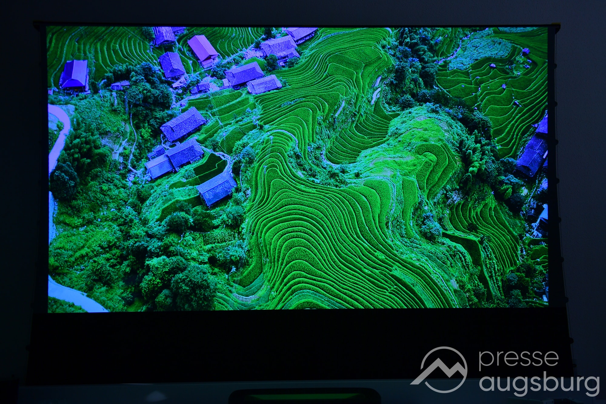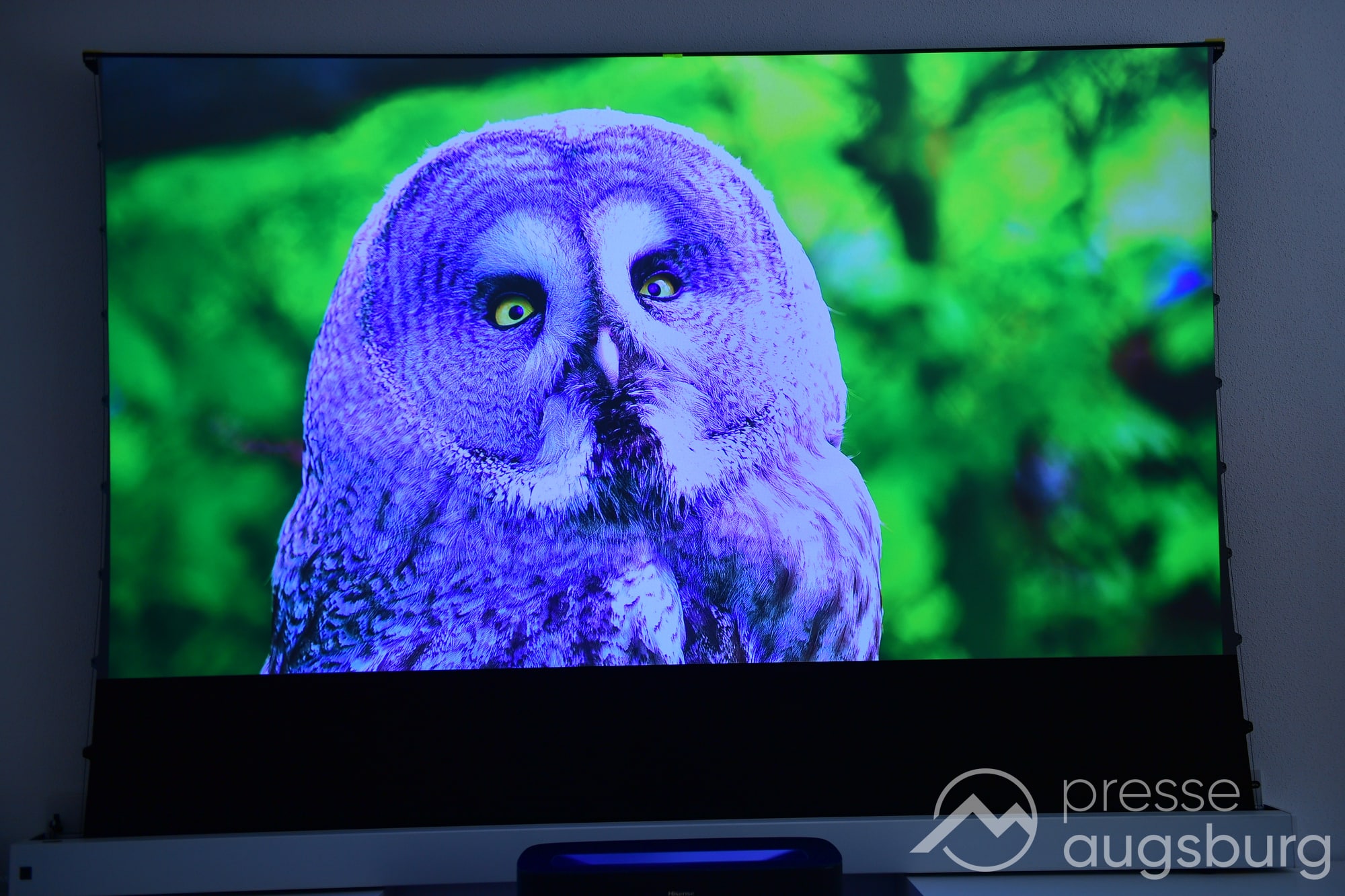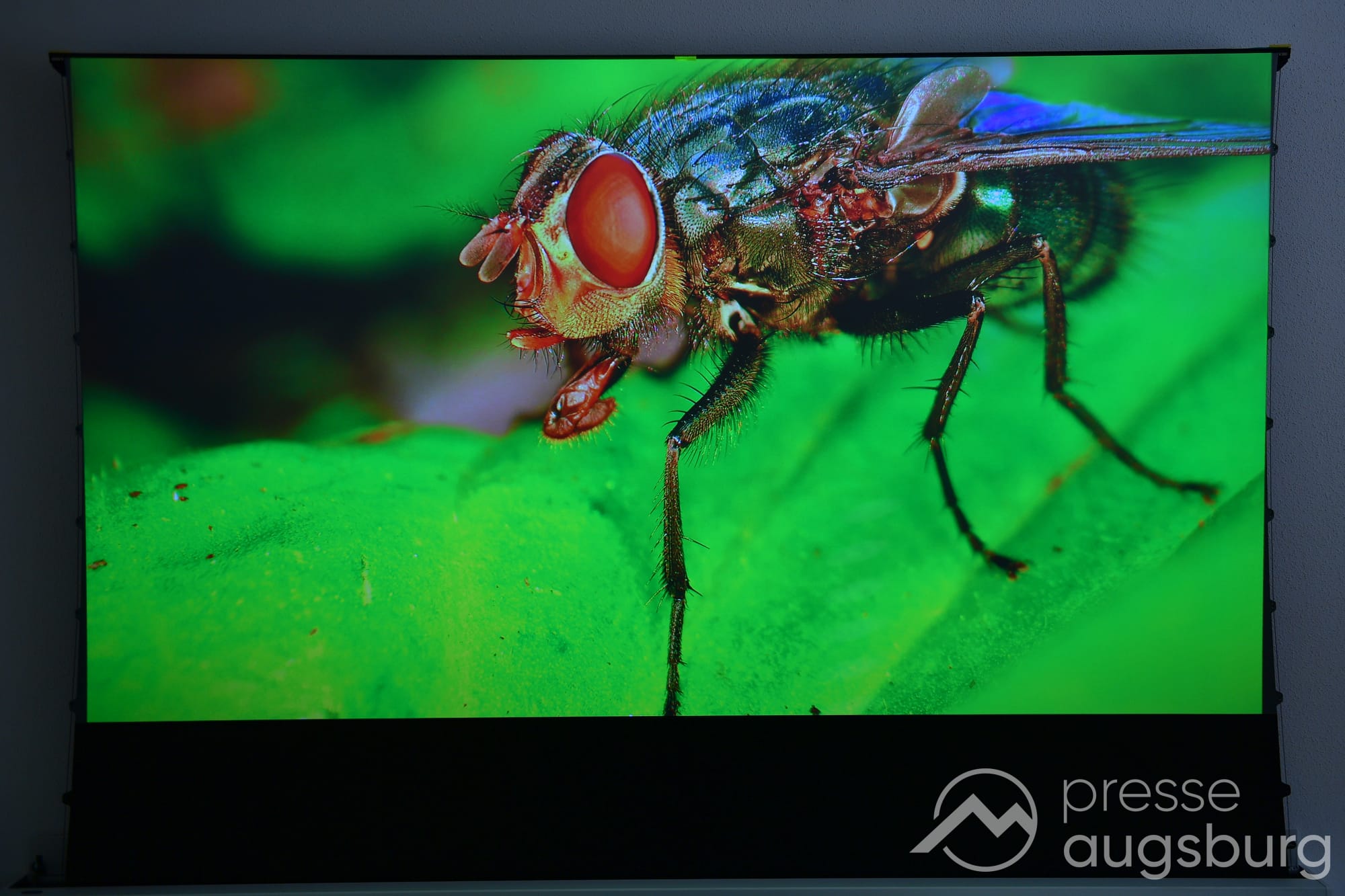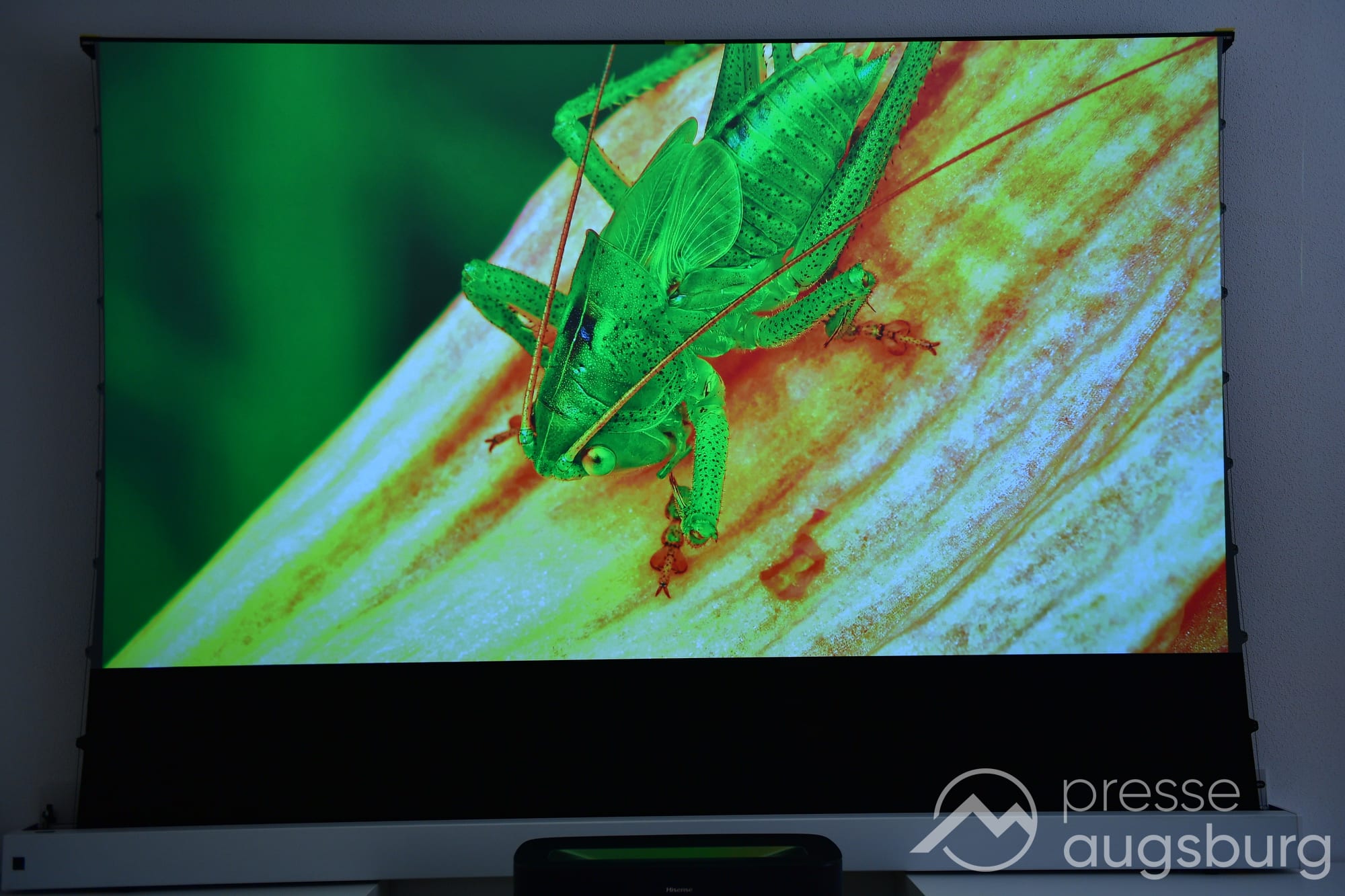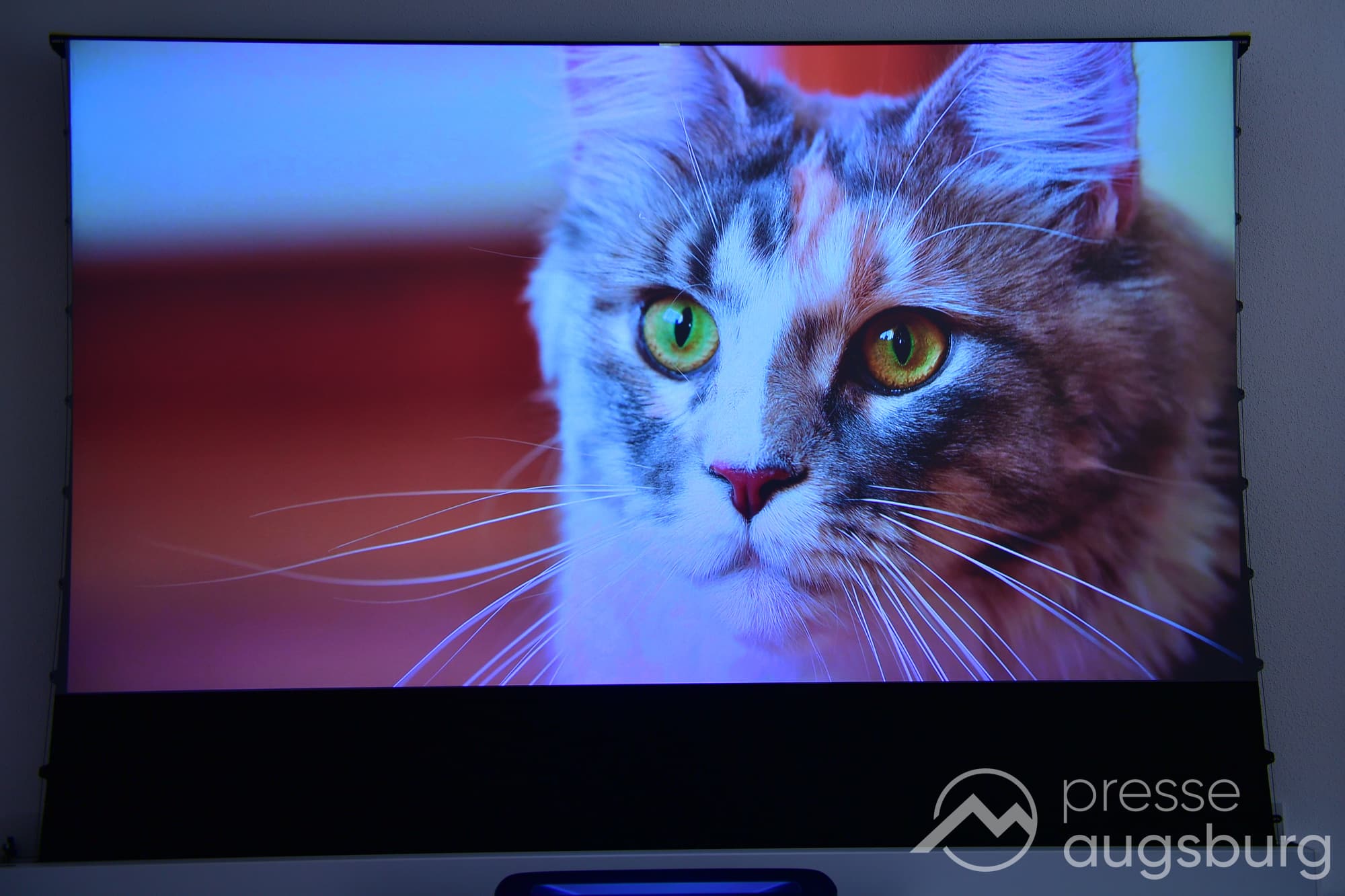 Dabei hat der Hersteller die Anzahl der richtreflektierenden Lamellen auf dem Tuch nochmals deutlich erhöht. Welche enorme Verbesserung das Bild durch die Nutzung der Leinwand erfuhr, können Sie auf den folgenden Bildern sehen. Wir haben dabei die Leinwand teilweise bewusst nur halb ausgefahren, um den Unterschied zwischen einer normalen, weißen Wand und der HomeCinema Plus Leinwand von Celexon zu zeigen. Als Laser-TV kam hier der Hisense PL1 zum Einsatz. Aber auch mit dem Hisense PX1, LG HU715QW sowie LG HU85LS erzielten wir perfekte Ergebnisse.