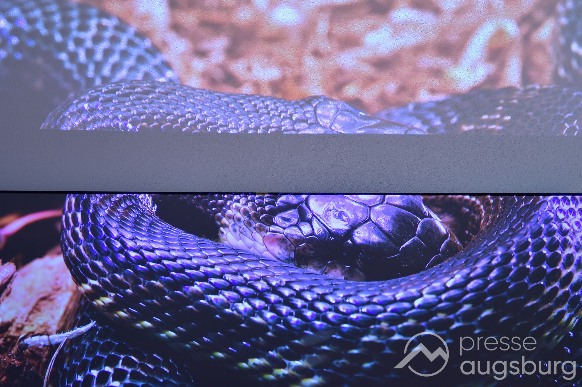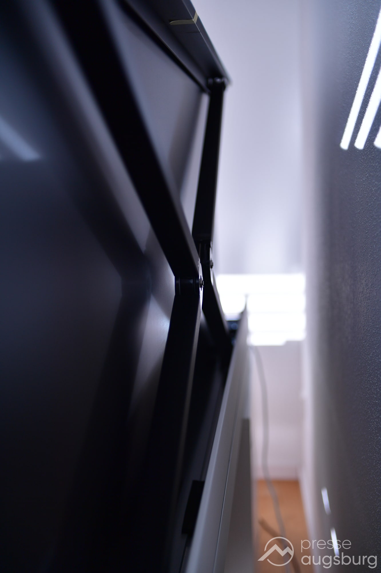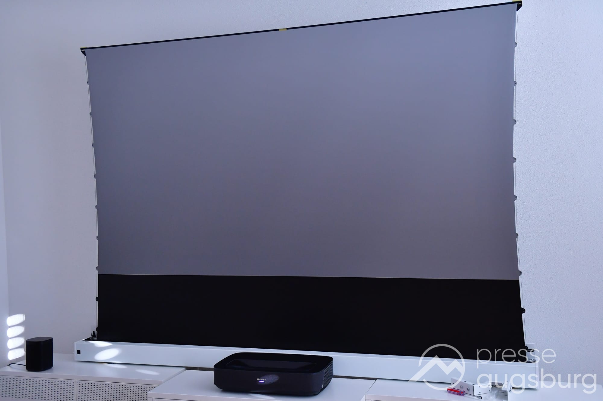 Die Leinwand verbessert das Bild des UST (Ultra Short Throw) Beamers entscheidend. Das einzigartige, mehrschichtige Tuchdesign erhöht sichtbar den Schwarzwert und reduziert effektiv den „Grauschleier“ bei Fremdlicht im Raum. Umgebungslicht wird aktiv von der Oberfläche abgelenkt oder absorbiert, wodurch auch bei Restlicht-Bedingungen, wie Lampen oder Tageslicht, ein kontrastreiches Bild sichtbar ist. In unserem Test wurde die HomeCinema Plus-Leinwand damit zu einem echten Gamechanger.