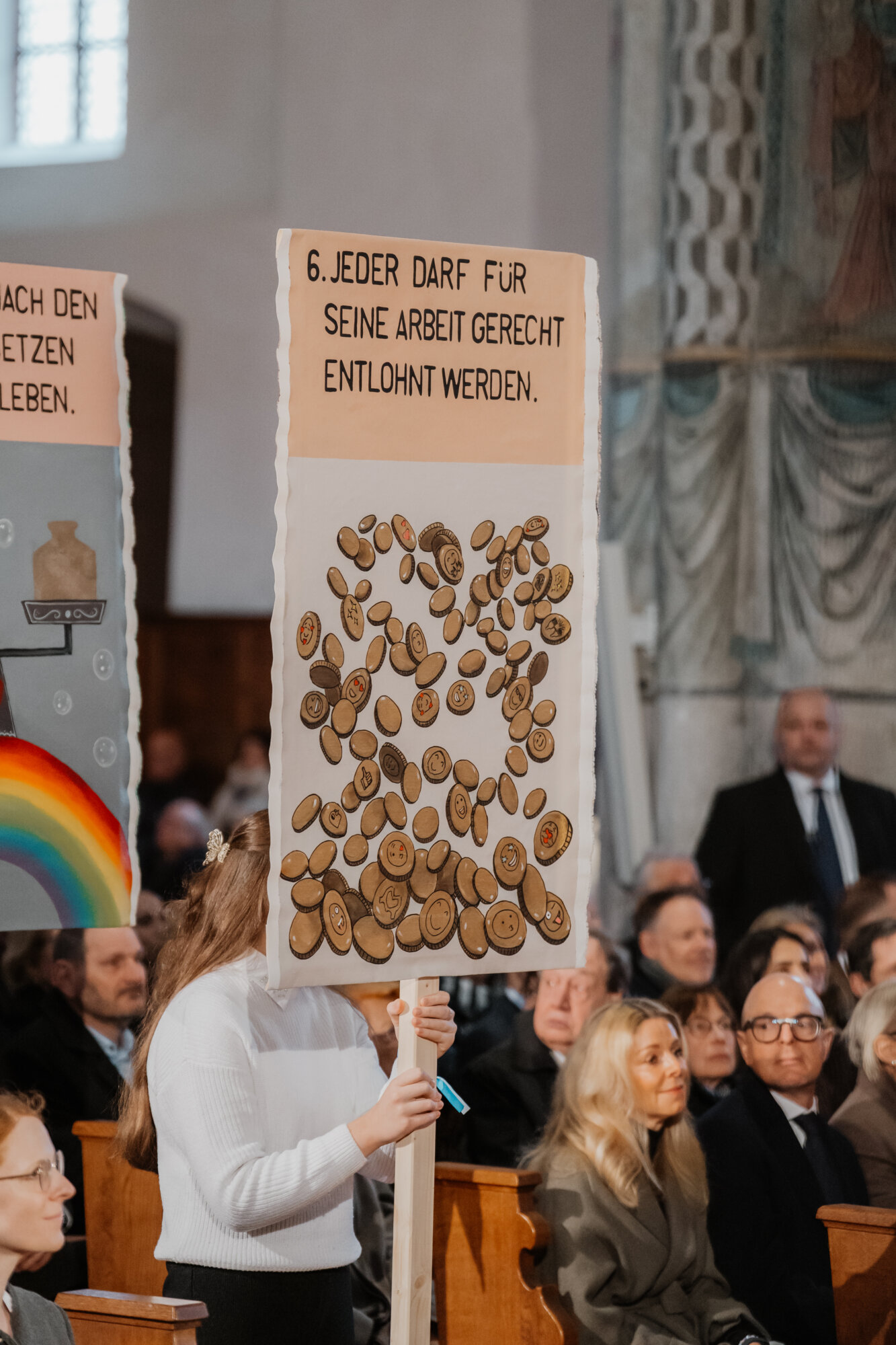 Ein besonderes Highlight war die Präsentation des Schulprojekts „Freiheitsrechte reloaded“ der Lindenschule. Die Schülerinnen und Schüler im Alter von zwölf bis 18 Jahren hatten die Zwölf Artikel in moderne Sprache übersetzt und auf heutige gesellschaftliche Herausforderungen angewandt. Beispiele ihrer Neufassungen lauteten unter anderem: „Jeder darf in der Gesellschaft mitbestimmen“, „Jeder darf für seine Arbeit gerecht entlohnt werden“ und „Jeder darf nach den gleichen Gesetzen und Rechten leben“. Begleitet wurde das Projekt durch Plakate mit Symbolen, die sie gemeinsam mit der Memminger Künstlerin Pia Kaltenbrunn gestalteten.