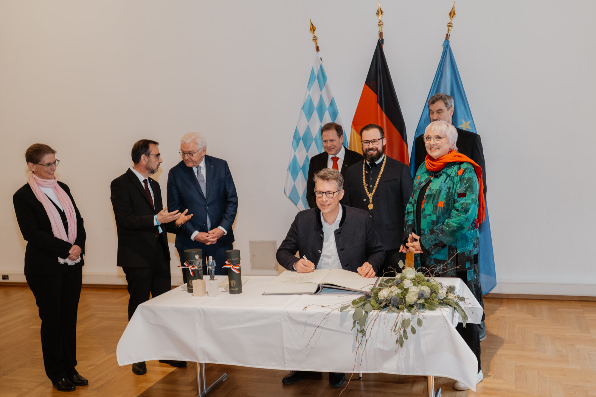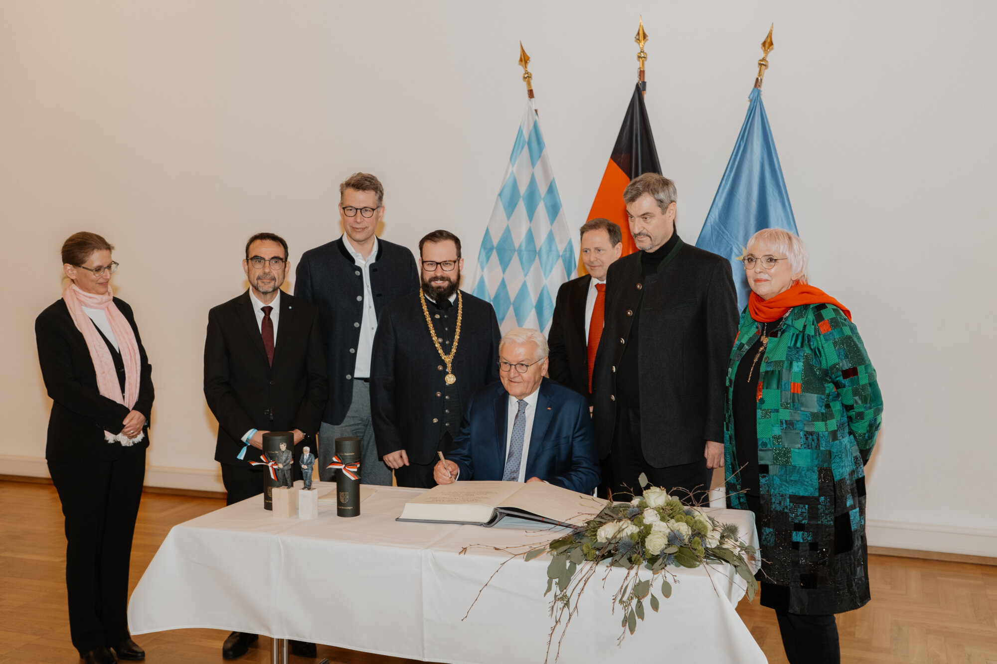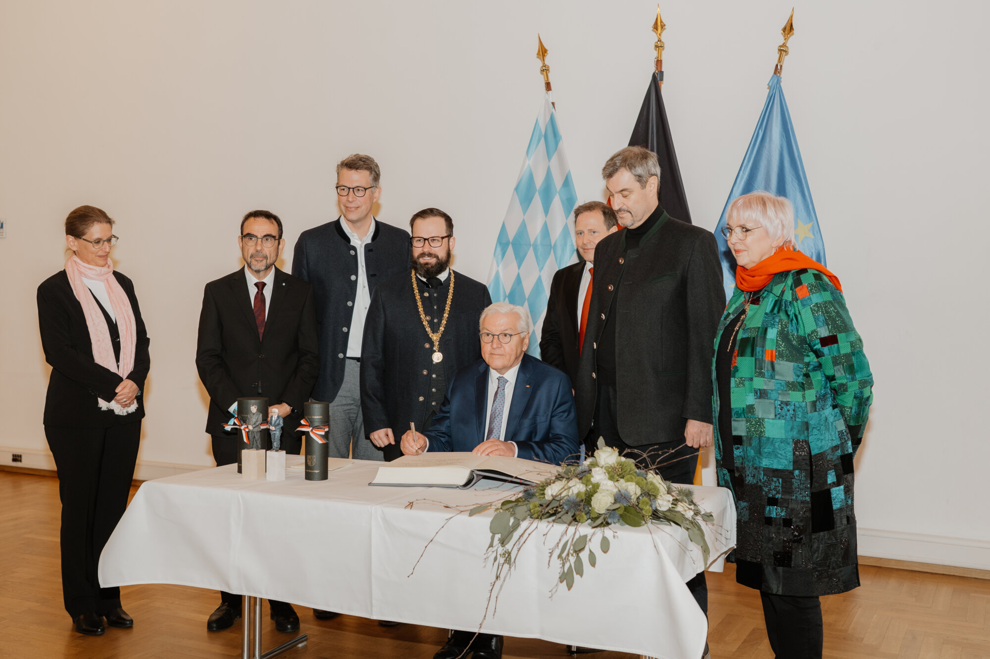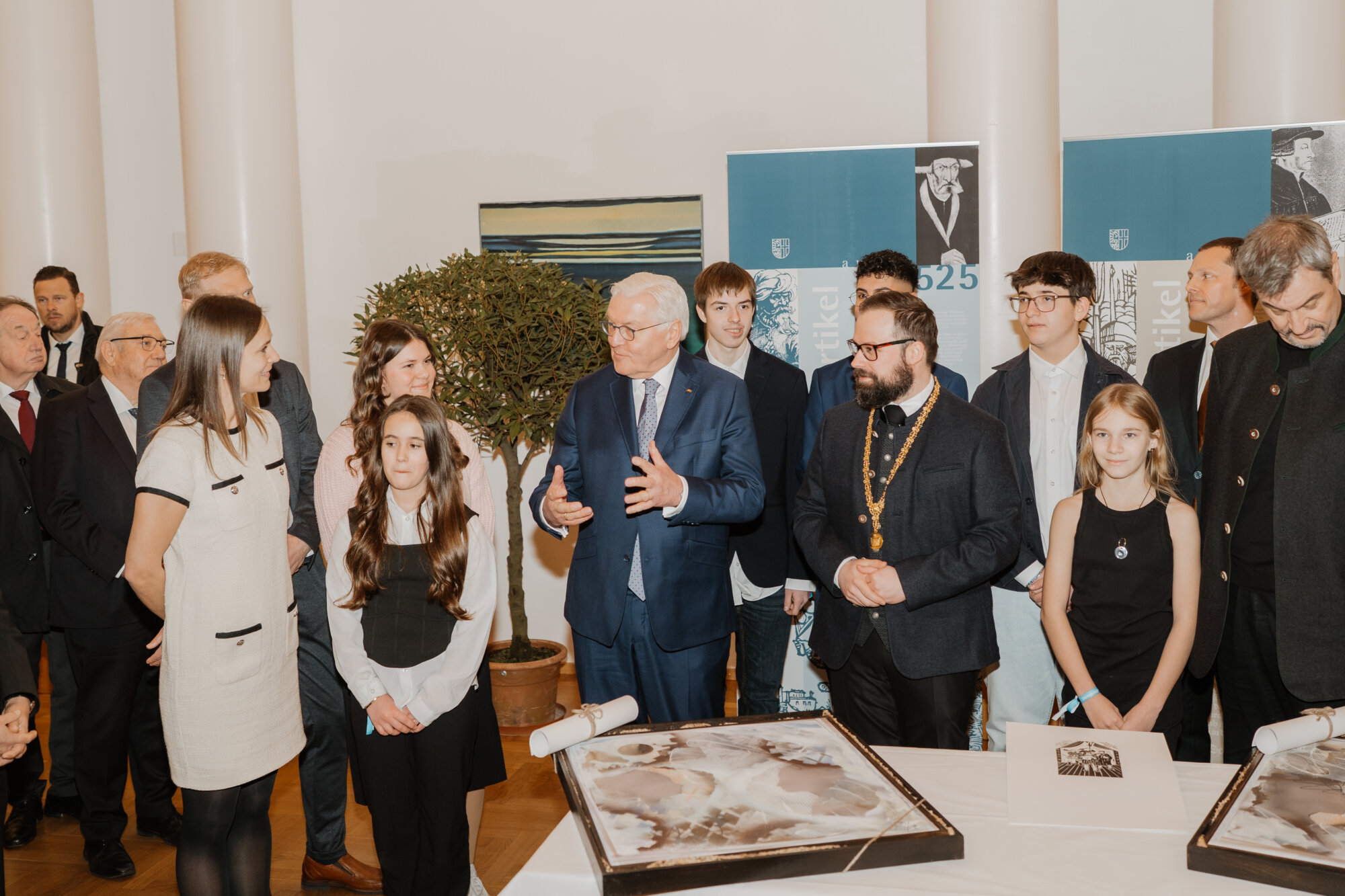 Bundespräsident Steinmeier trug sich in das Goldene Buch der Stadt ein und kam mit Schülerinnen und Schülern der Lindenschule ins Gespräch. Zum Abschluss des Festakts überreichte Oberbürgermeister Rothenbacher Steinmeier und Söder jeweils ein Faksimile der Zwölf Artikel von 1525 sowie eine besondere Erinnerung an ihren Besuch: filigran geschnitzte Porträt-Figuren, angefertigt von der Memminger Künstlerin Cornelia Brader.