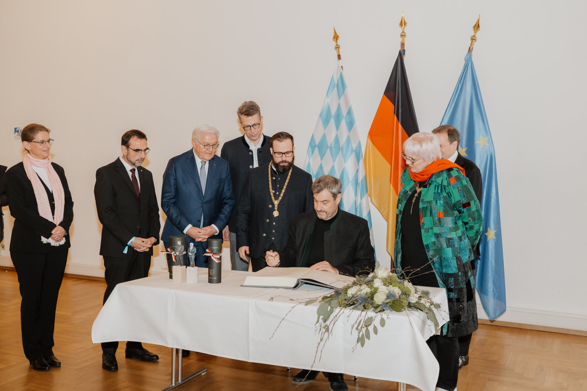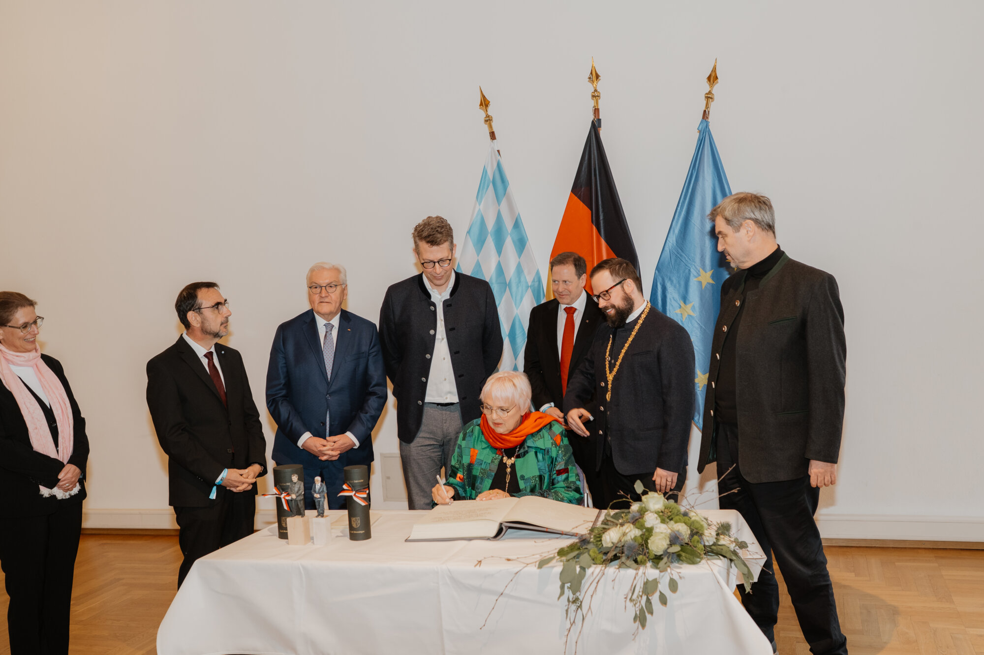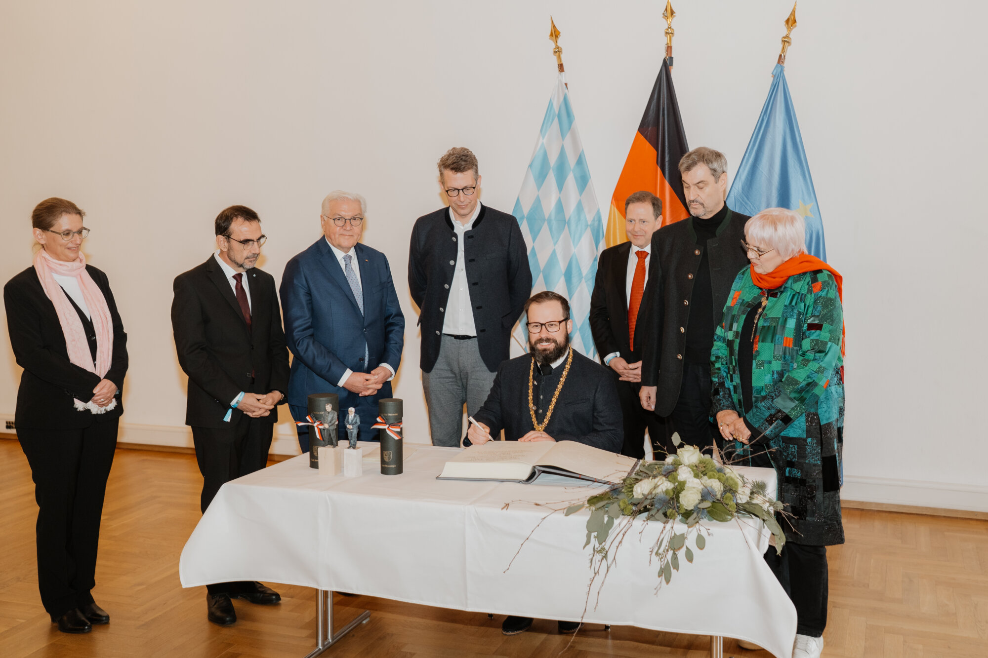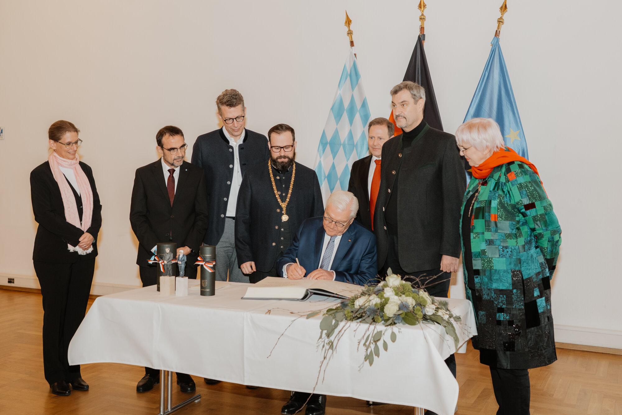 Bundespräsident Steinmeier trug sich in das Goldene Buch der Stadt ein und kam mit Schülerinnen und Schülern der Lindenschule ins Gespräch. Zum Abschluss des Festakts überreichte Oberbürgermeister Rothenbacher Steinmeier und Söder jeweils ein Faksimile der Zwölf Artikel von 1525 sowie eine besondere Erinnerung an ihren Besuch: filigran geschnitzte Porträt-Figuren, angefertigt von der Memminger Künstlerin Cornelia Brader.