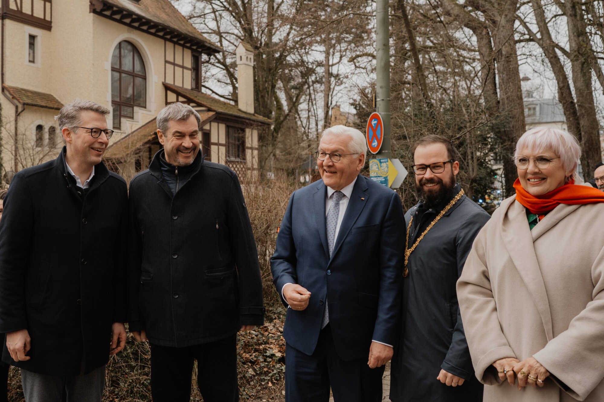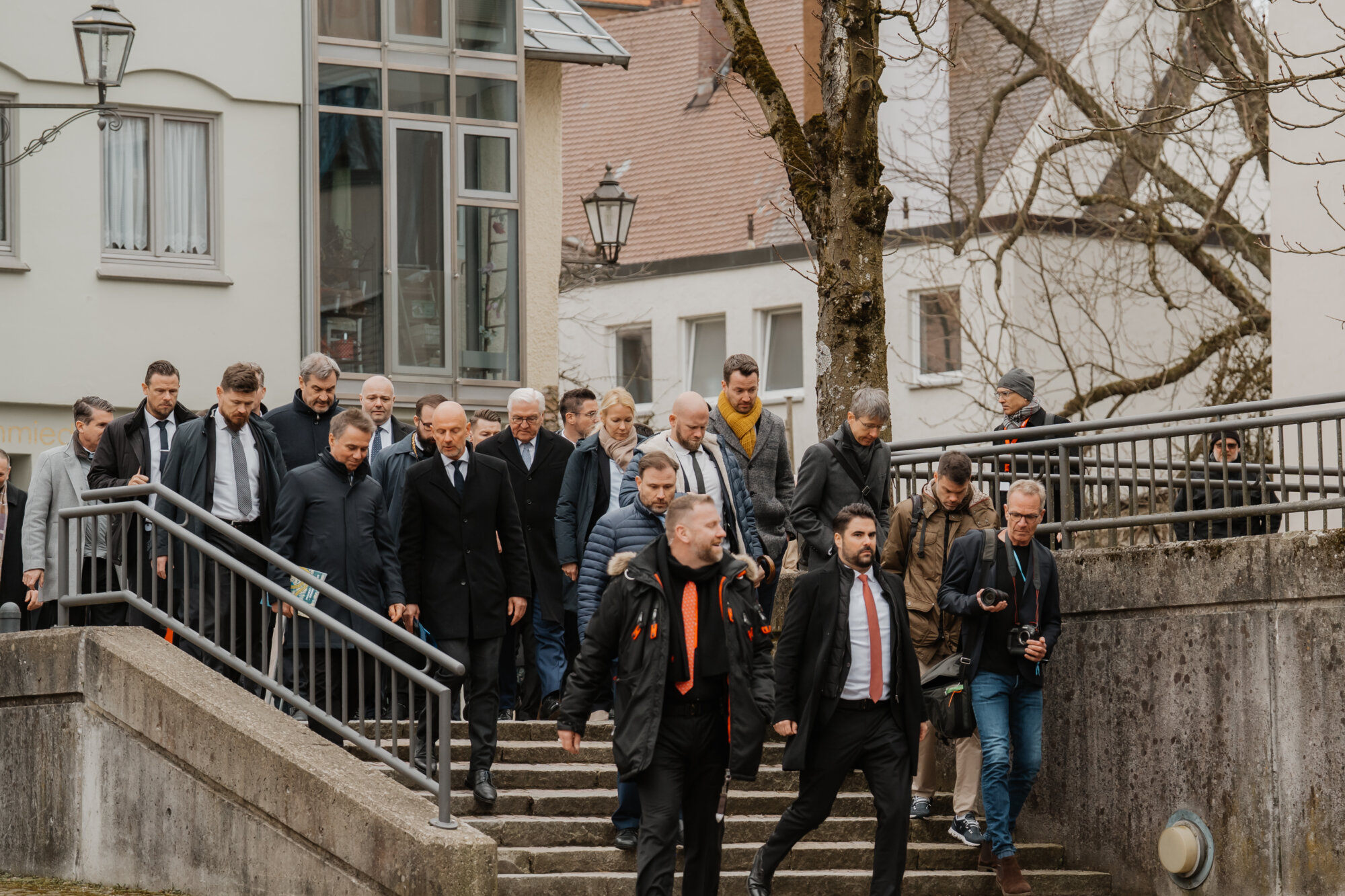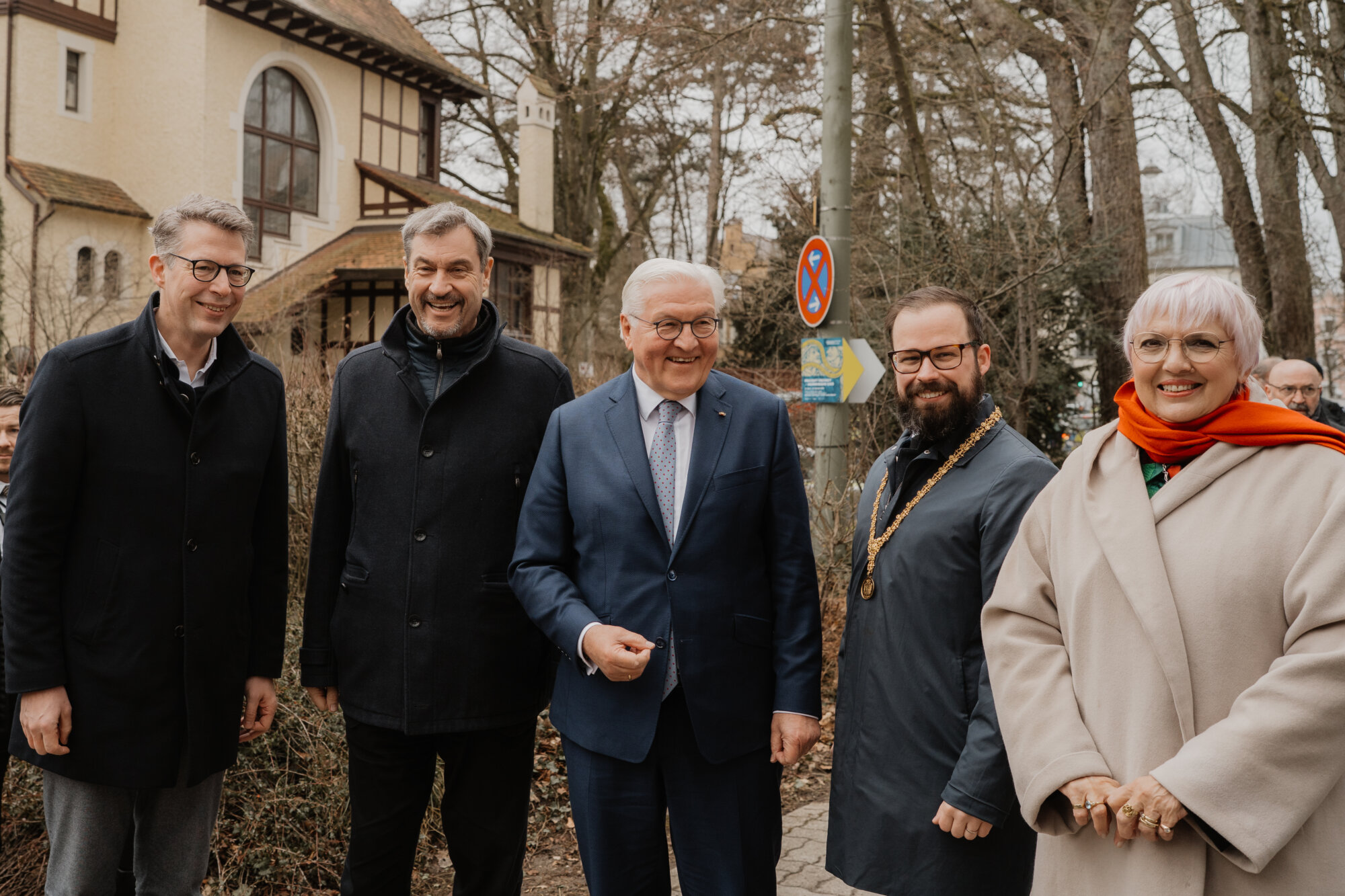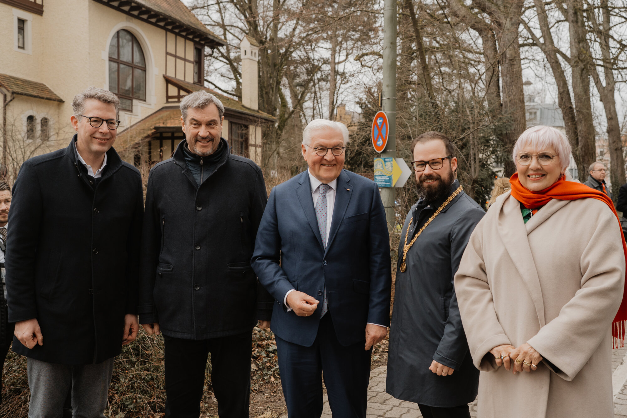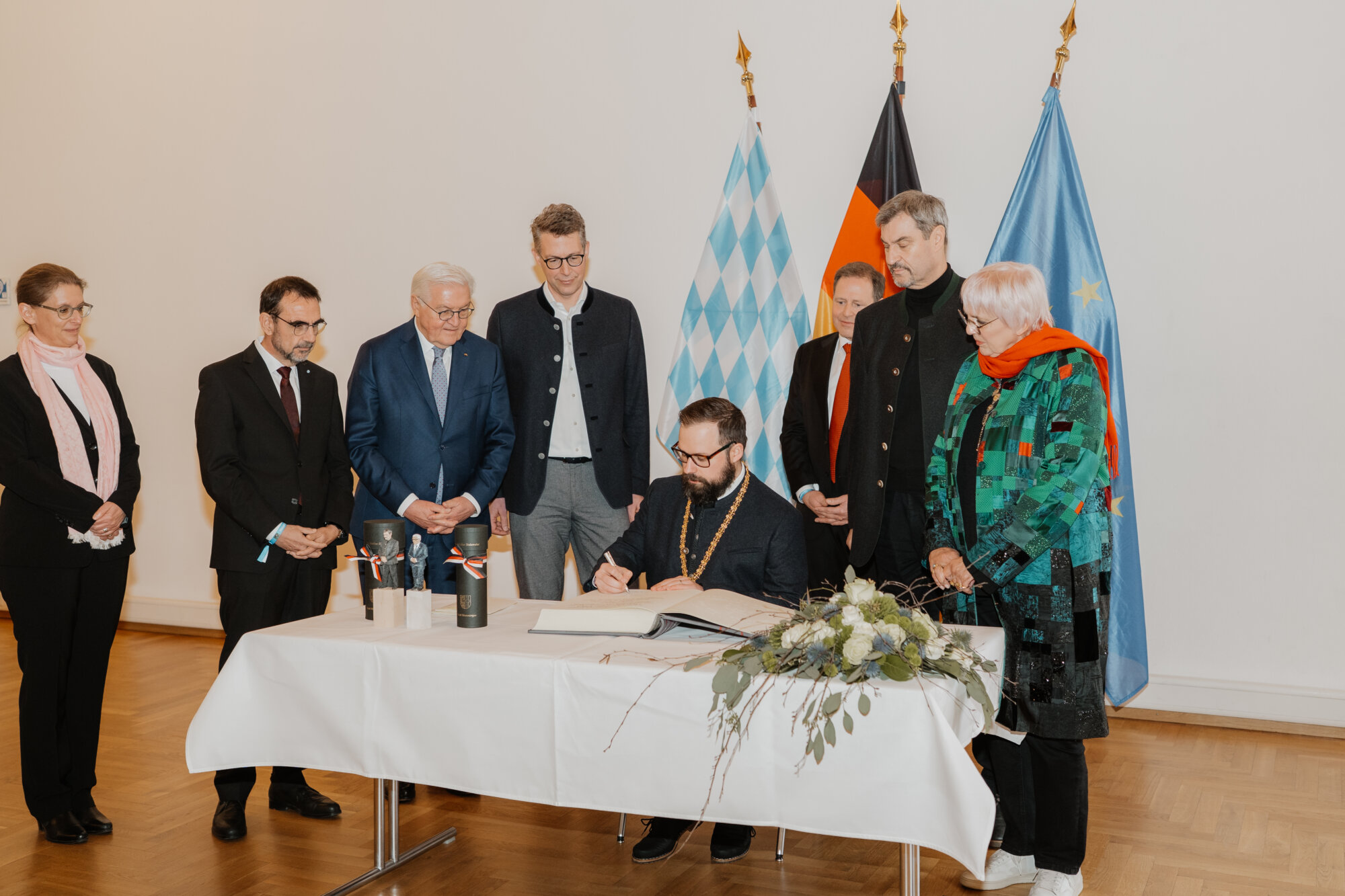 Bundespräsident Steinmeier trug sich in das Goldene Buch der Stadt ein und kam mit Schülerinnen und Schülern der Lindenschule ins Gespräch. Zum Abschluss des Festakts überreichte Oberbürgermeister Rothenbacher Steinmeier und Söder jeweils ein Faksimile der Zwölf Artikel von 1525 sowie eine besondere Erinnerung an ihren Besuch: filigran geschnitzte Porträt-Figuren, angefertigt von der Memminger Künstlerin Cornelia Brader.