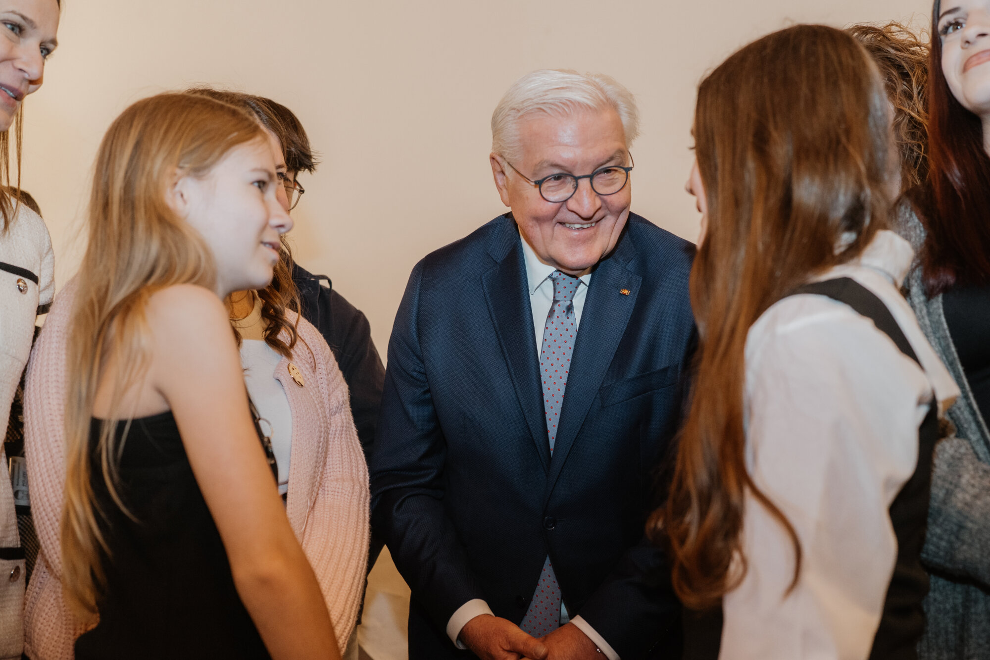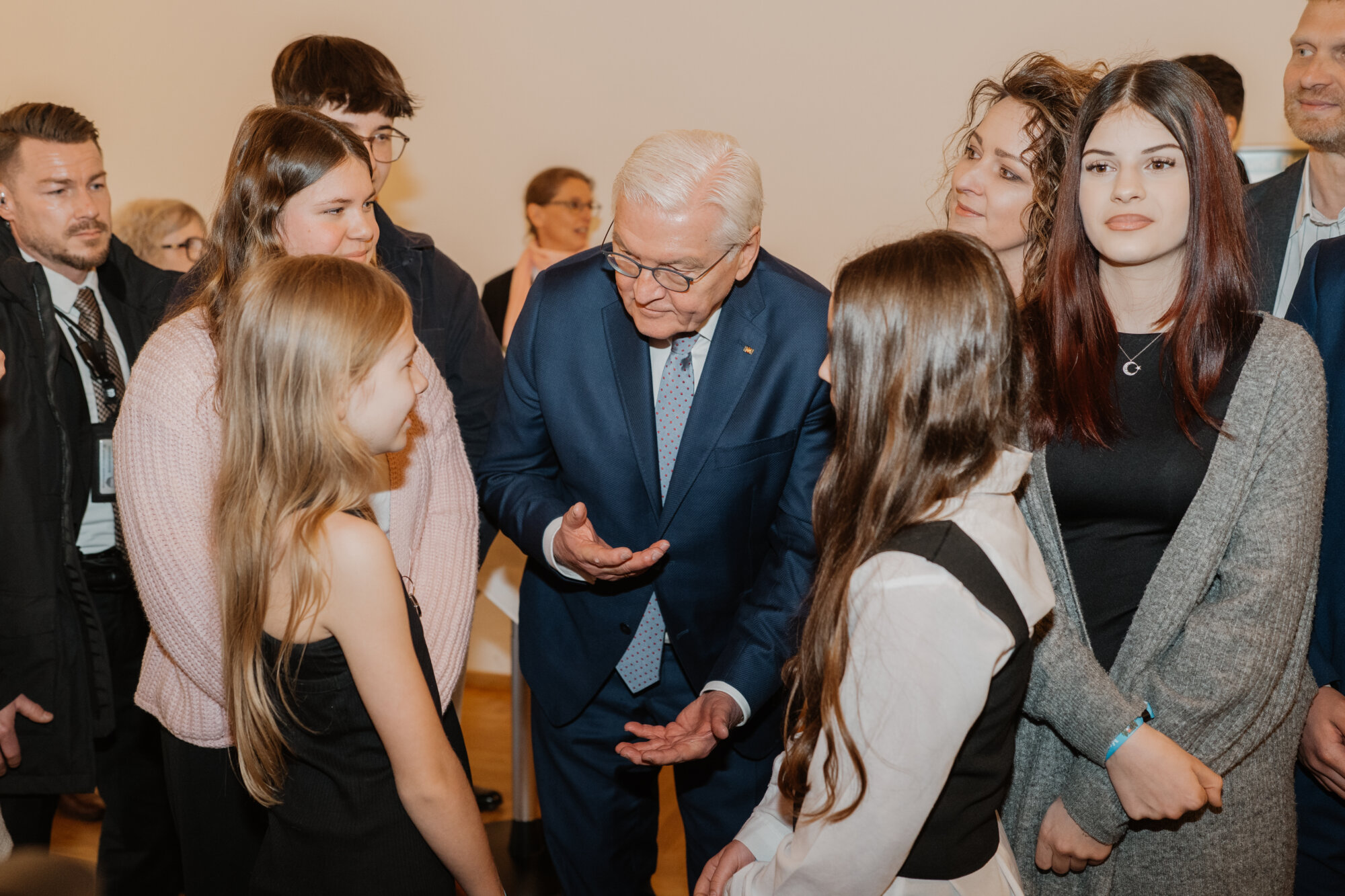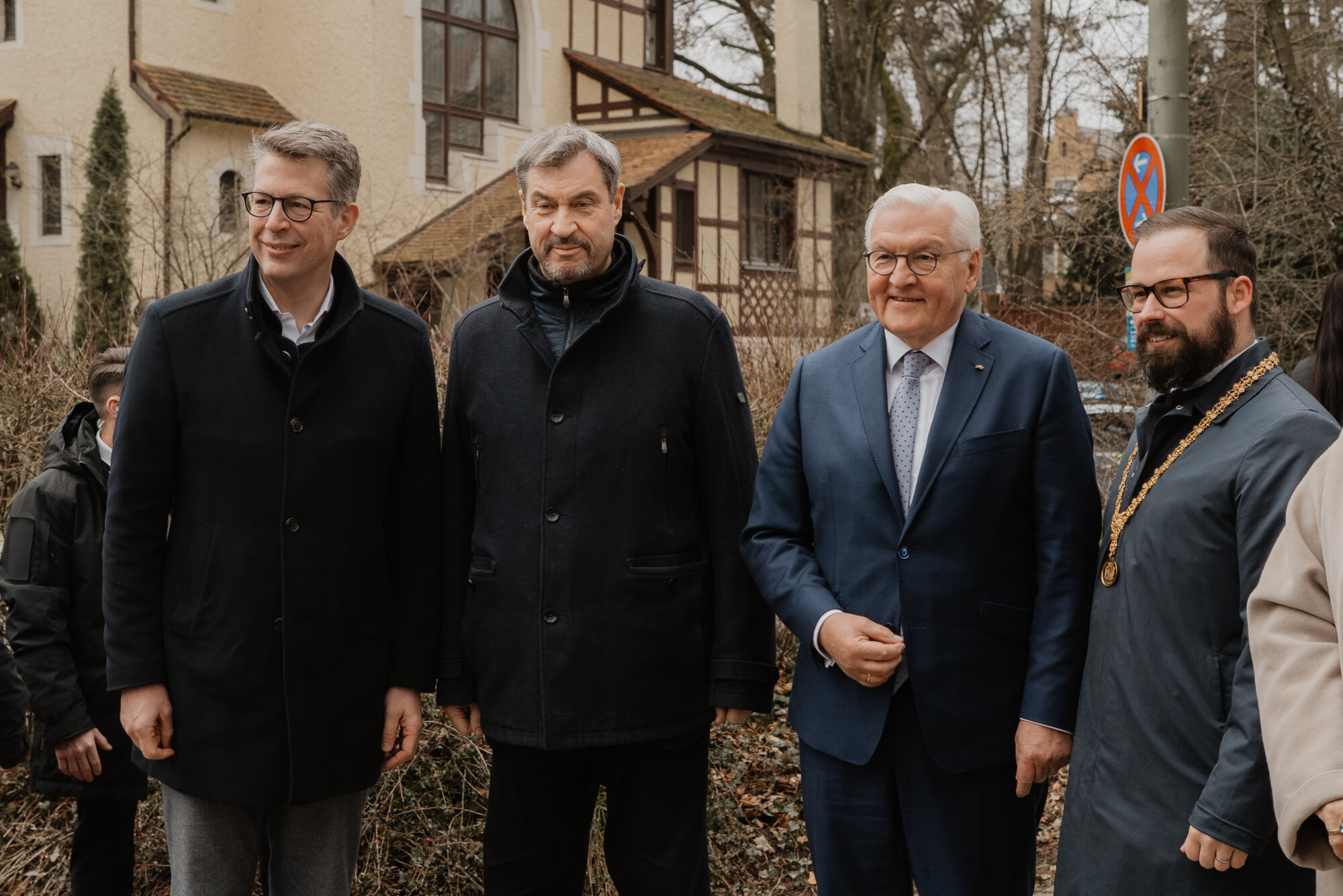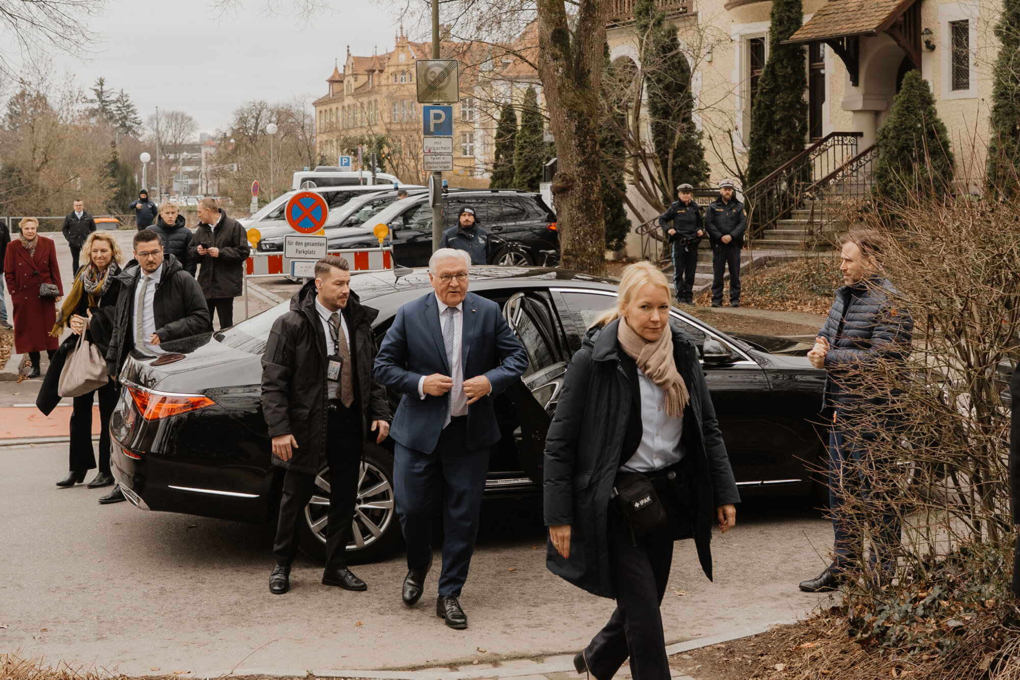 Bundespräsident Steinmeier trug sich in das Goldene Buch der Stadt ein und kam mit Schülerinnen und Schülern der Lindenschule ins Gespräch. Zum Abschluss des Festakts überreichte Oberbürgermeister Rothenbacher Steinmeier und Söder jeweils ein Faksimile der Zwölf Artikel von 1525 sowie eine besondere Erinnerung an ihren Besuch: filigran geschnitzte Porträt-Figuren, angefertigt von der Memminger Künstlerin Cornelia Brader.