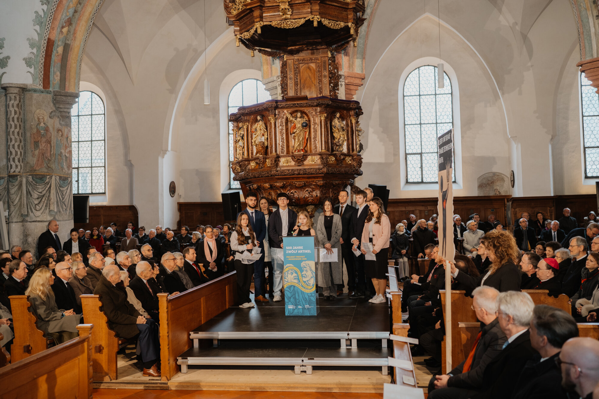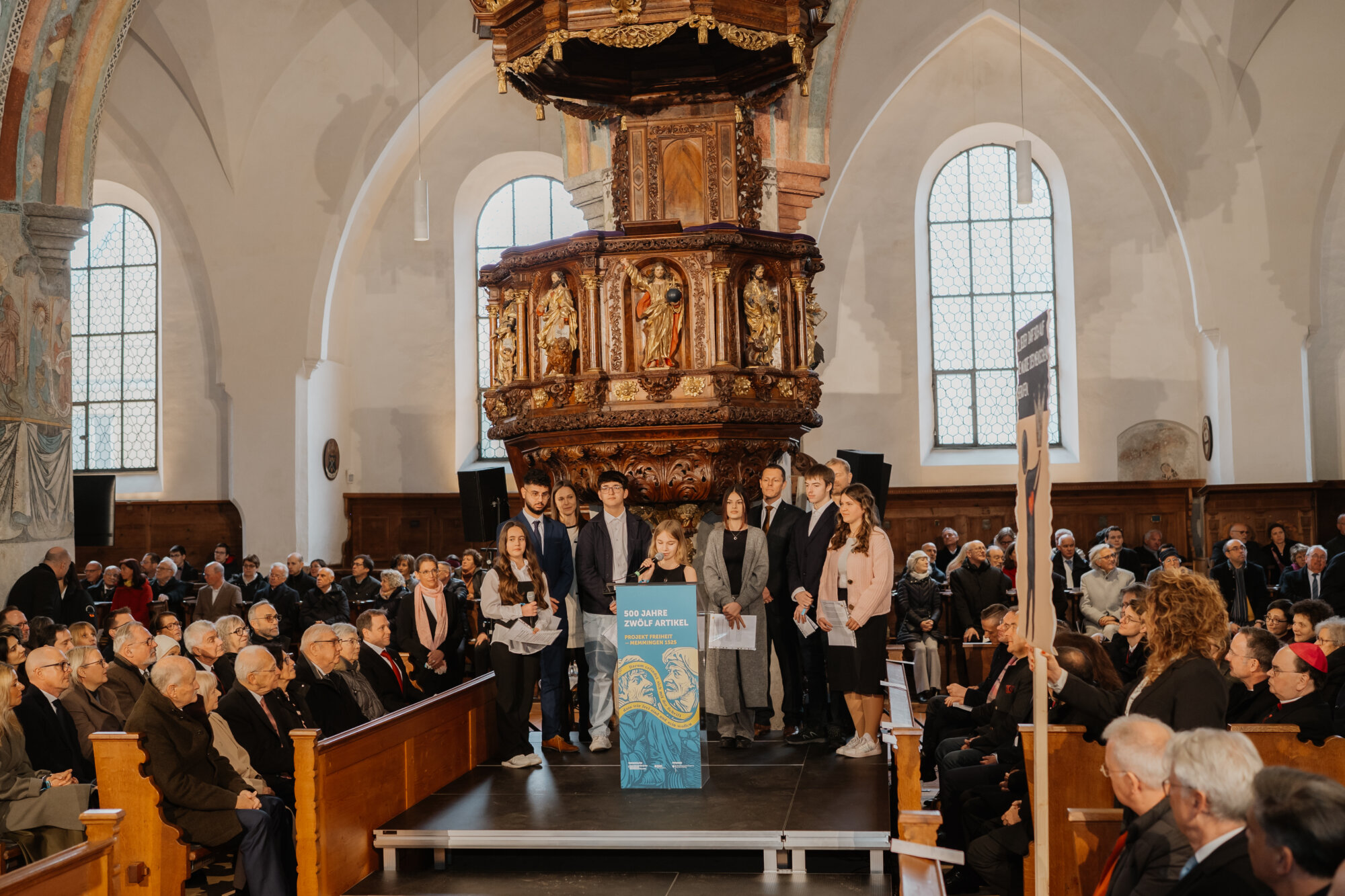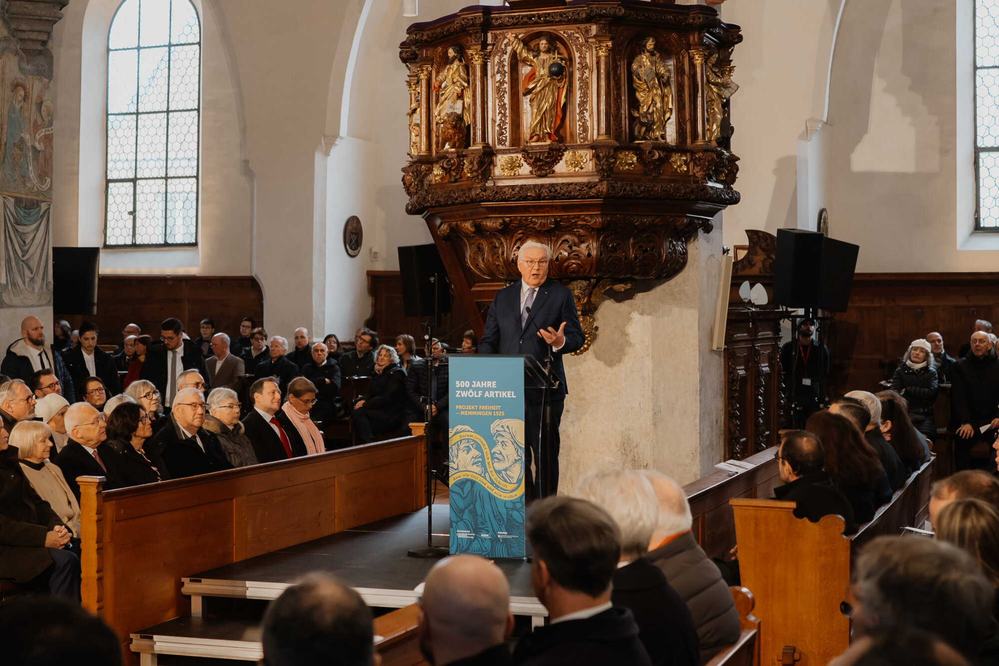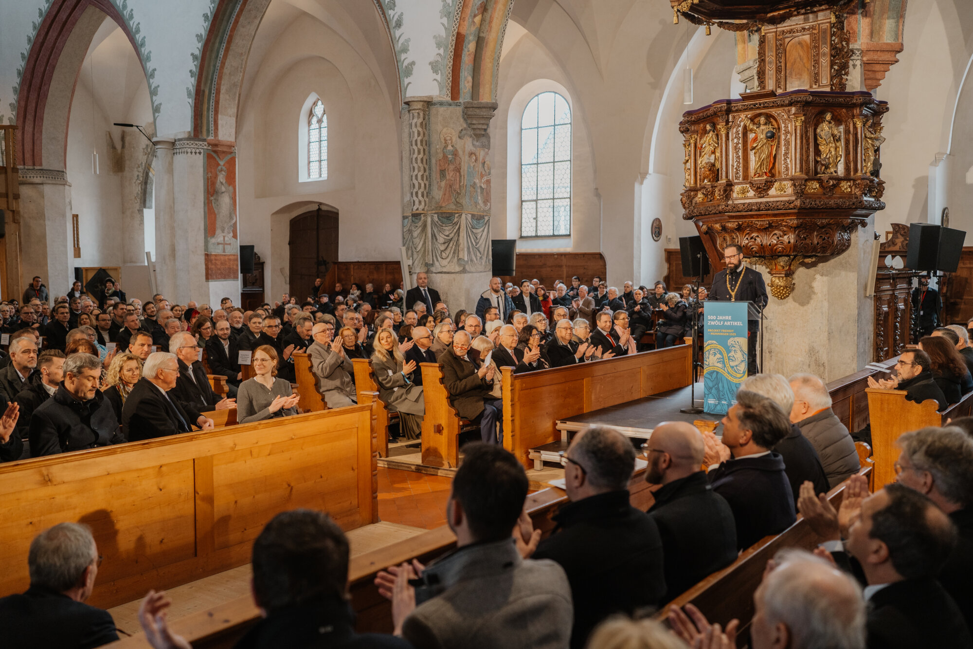 Mit einem eindrucksvollen Festakt in der Kirche St. Martin in Memmingen wurde das Gedenkjahr „500 Jahre Zwölf Artikel“ eröffnet. Bundespräsident Frank-Walter Steinmeier und Bayerns Ministerpräsident Dr. Markus Söder ehrten gemeinsam mit rund 1.000 geladenen Gästen die historische Bedeutung der Zwölf Artikel, die als eine der frühesten Forderungen nach Freiheitsrechten in Europa gelten. Weitere 1.000 Menschen verfolgten die Veranstaltung über Livestreams in den sozialen Medien.
