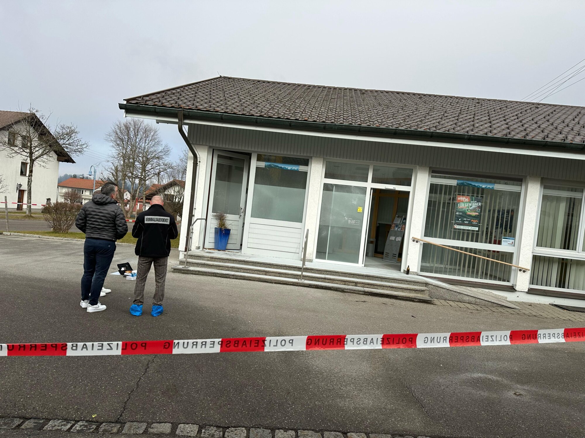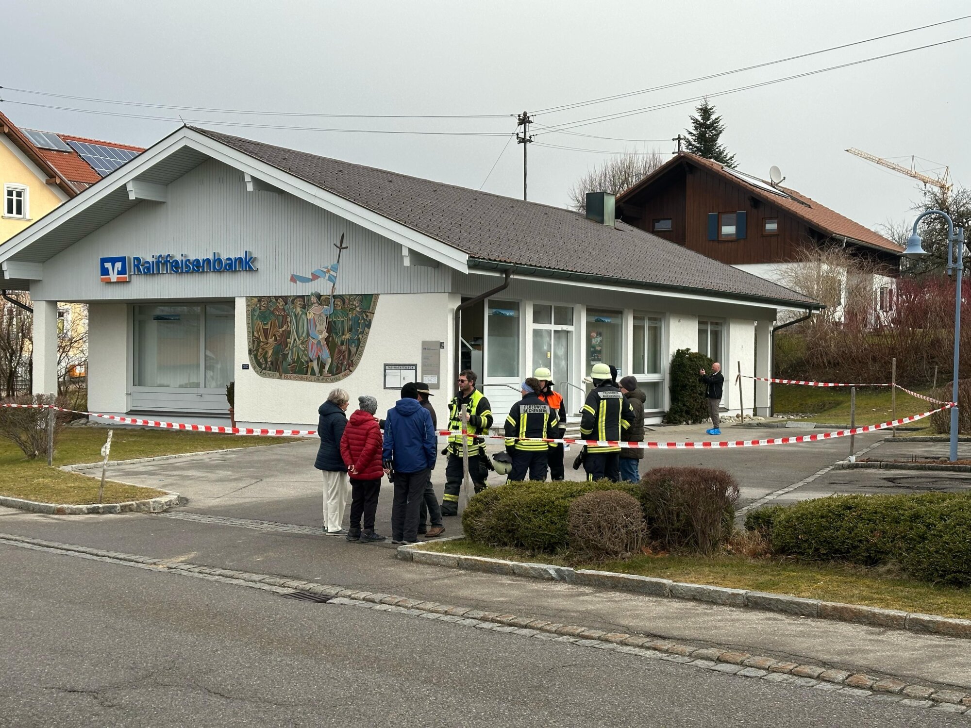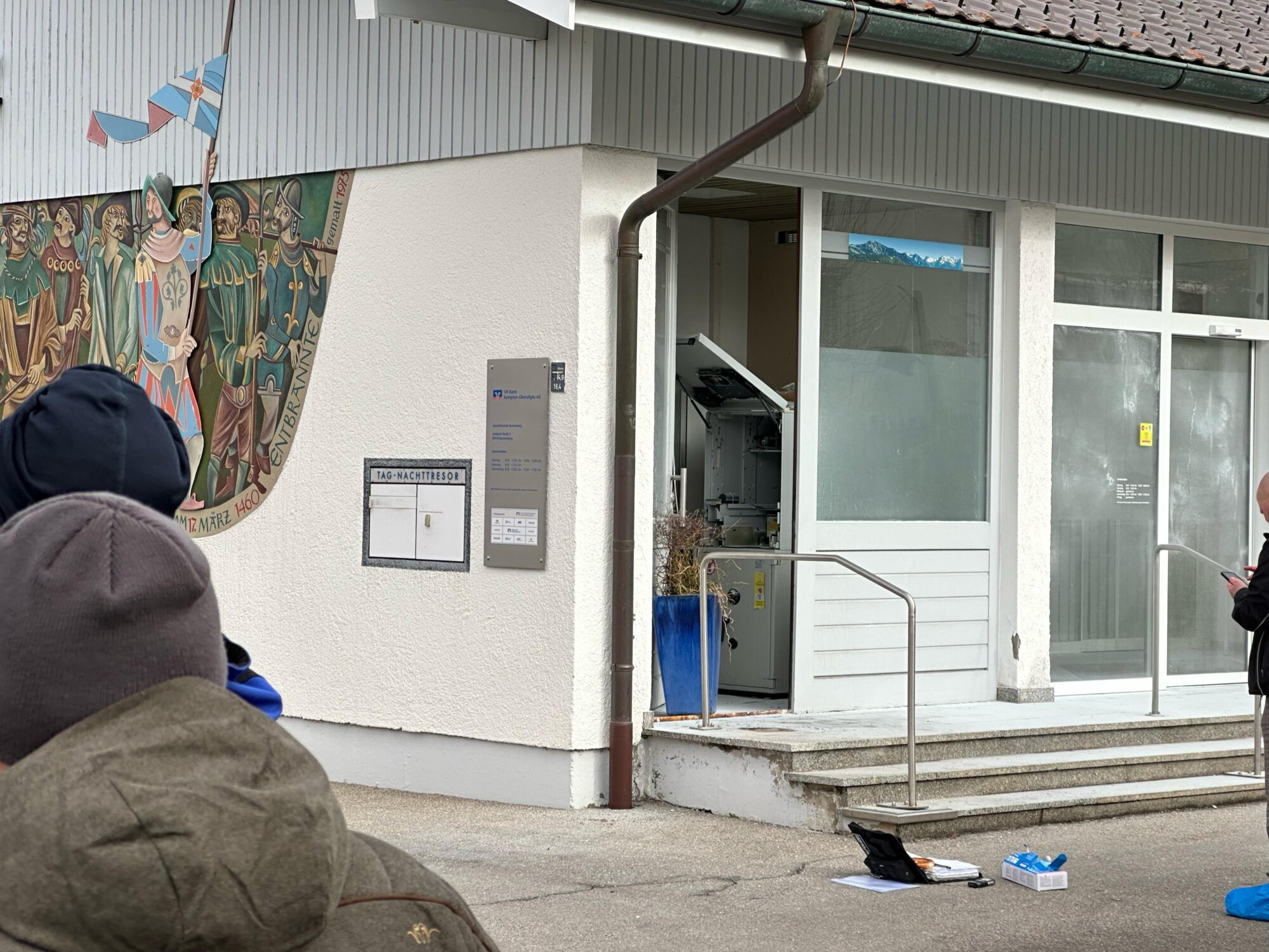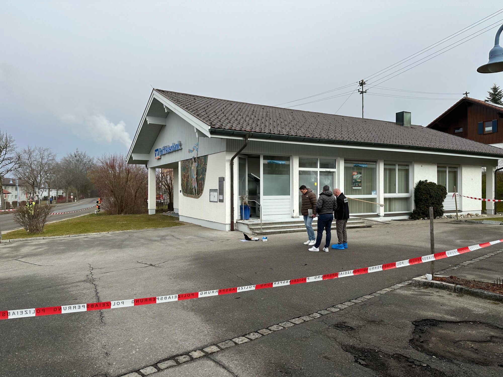 Gegen 8:30 Uhr wurde die Feuerwehr Buchenberg erneut alarmiert – diesmal zur Raiffeisenbank-Filiale, nur wenige Meter vom Brandort entfernt. Die Polizei fand verdächtige Gegenstände, der Geldautomat war aufgebrochen. Die Täter hatten die Tür zum Automatenraum gewaltsam geöffnet und versucht, den Automaten von hinten zu knacken. Laut Bürgermeister blieb der Tresor jedoch unversehrt.
