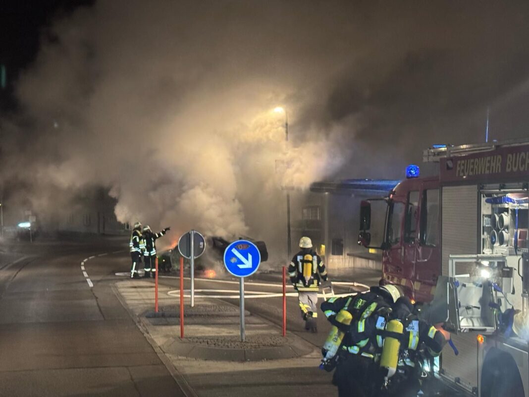 In der vergangenen Nacht wurde die Feuerwehr Buchenberg (Landkreis Oberallgäu) gegen 5:40 Uhr zu einem brennenden Pkw in die Lindauer Straße alarmiert. Vor Ort stand ein Auto lichterloh in Flammen – zwischen einer Verkehrsinsel und einer Bushaltestelle. Auffällig: Laut Augenzeugen fehlten die Kennzeichen am Fahrzeug.