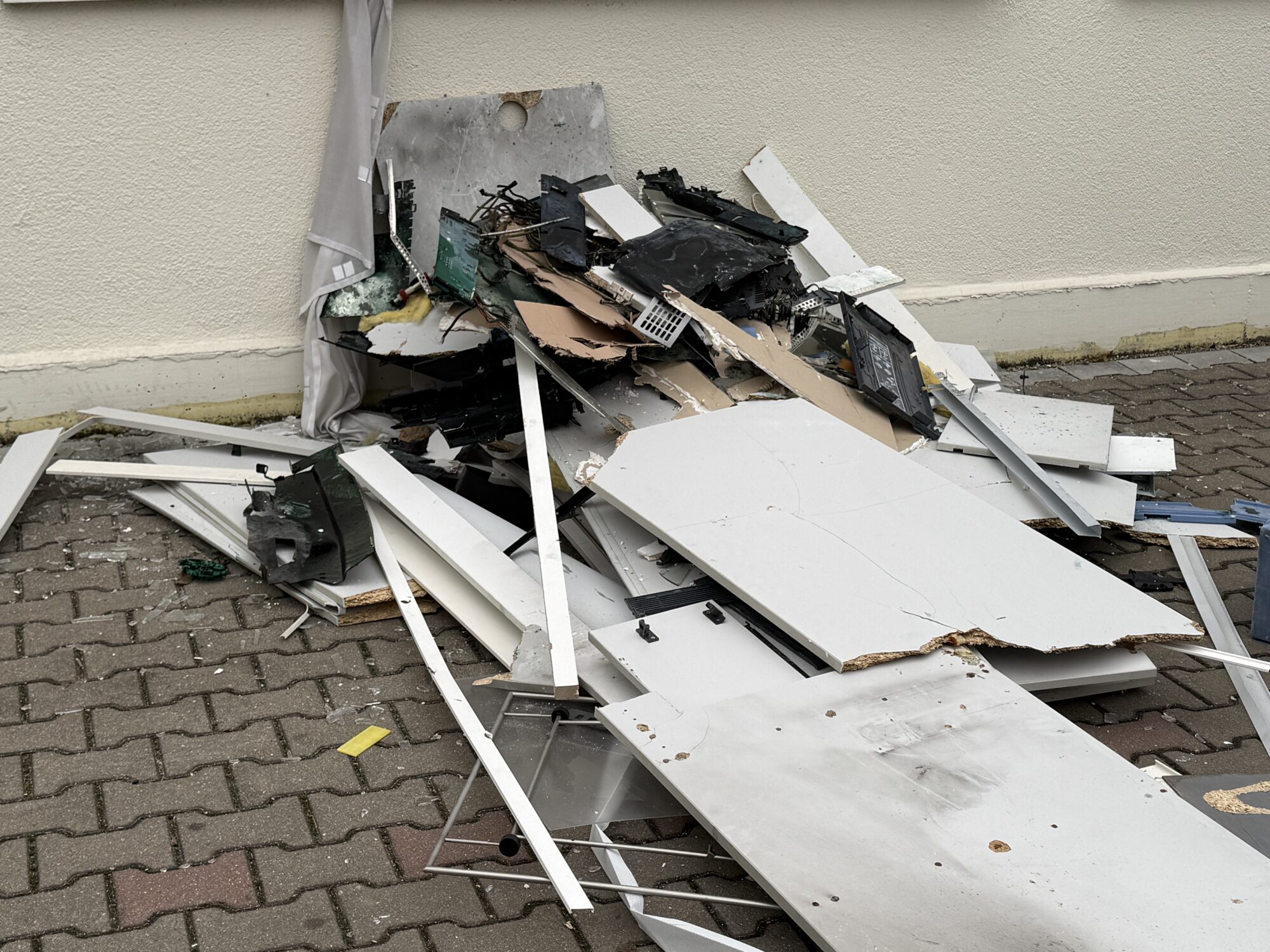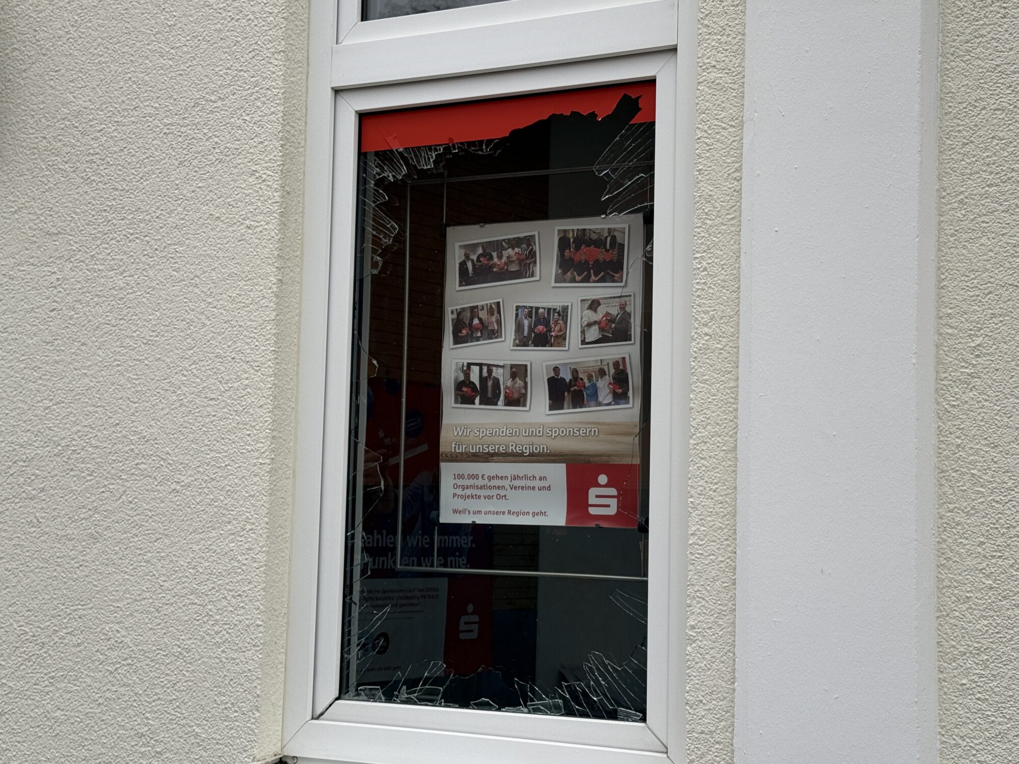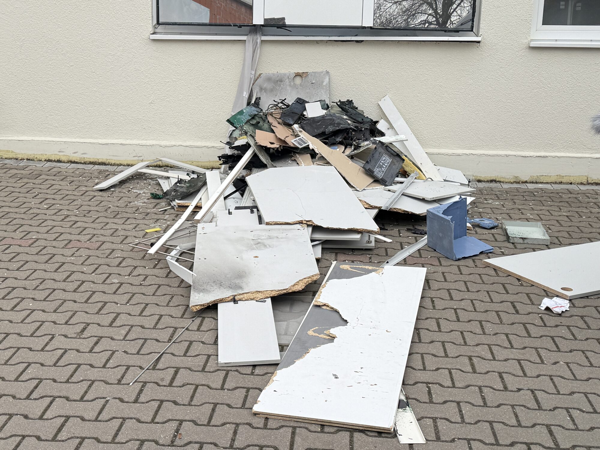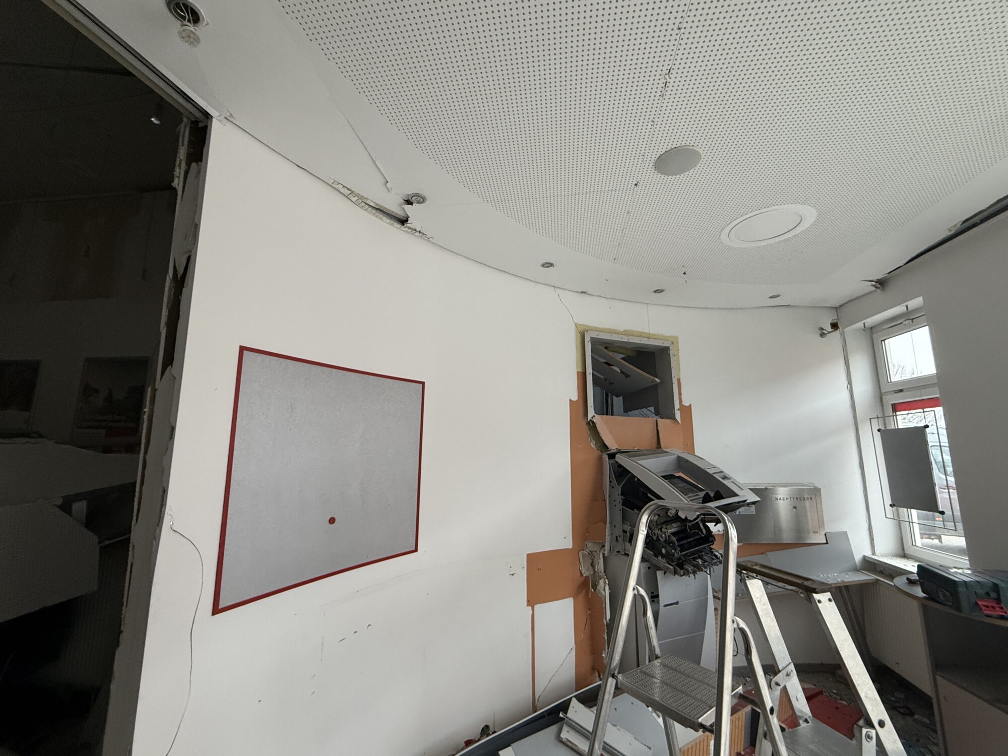 Ein lauter Knall riss Anwohner aus dem Schlaf, die umgehend die Polizei alarmierten. Vier männliche Täter brachten Sprengstoff an dem Geldausgabeautomaten an und lösten die Explosion aus. Die Auswirkungen waren massiv: Die Filiale wurde erheblich beschädigt, die komplette abgehängte Decke kam herunter, zahlreiche Scheiben gingen zu Bruch und der Automat wurde großflächig zerstört.